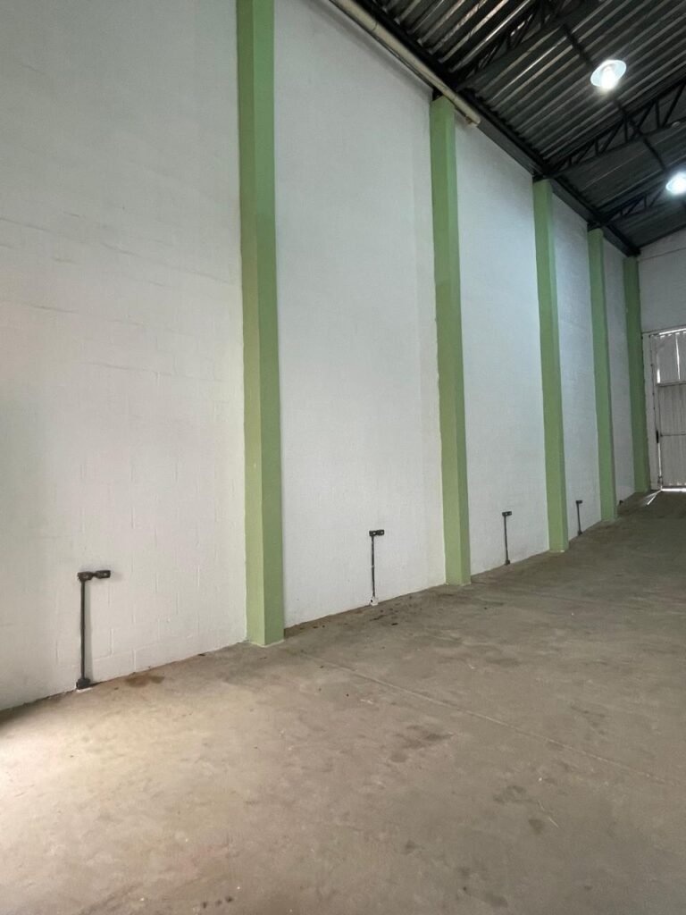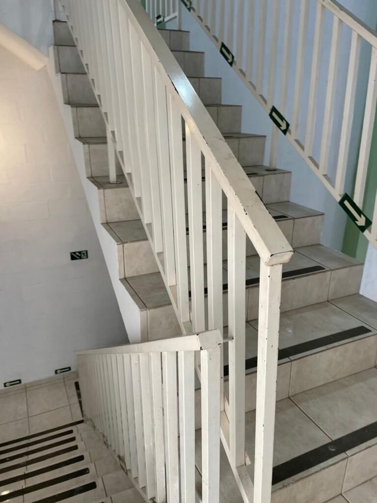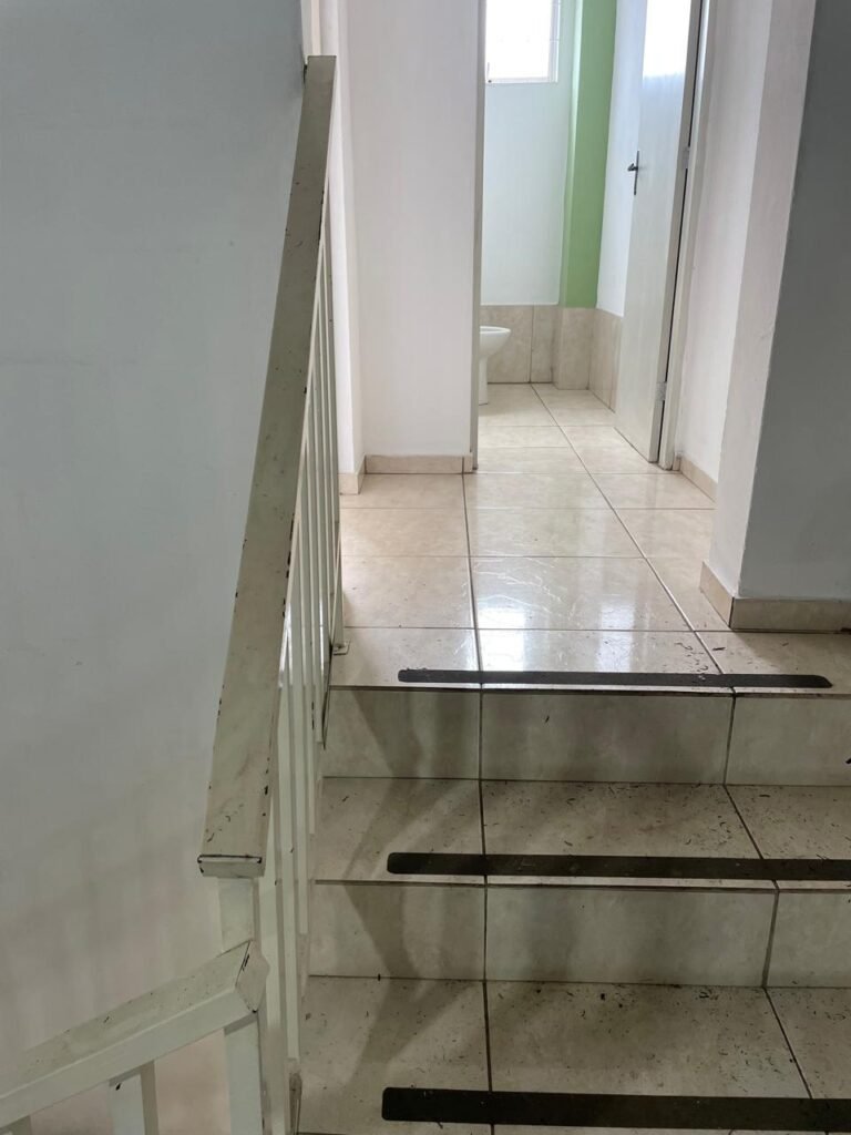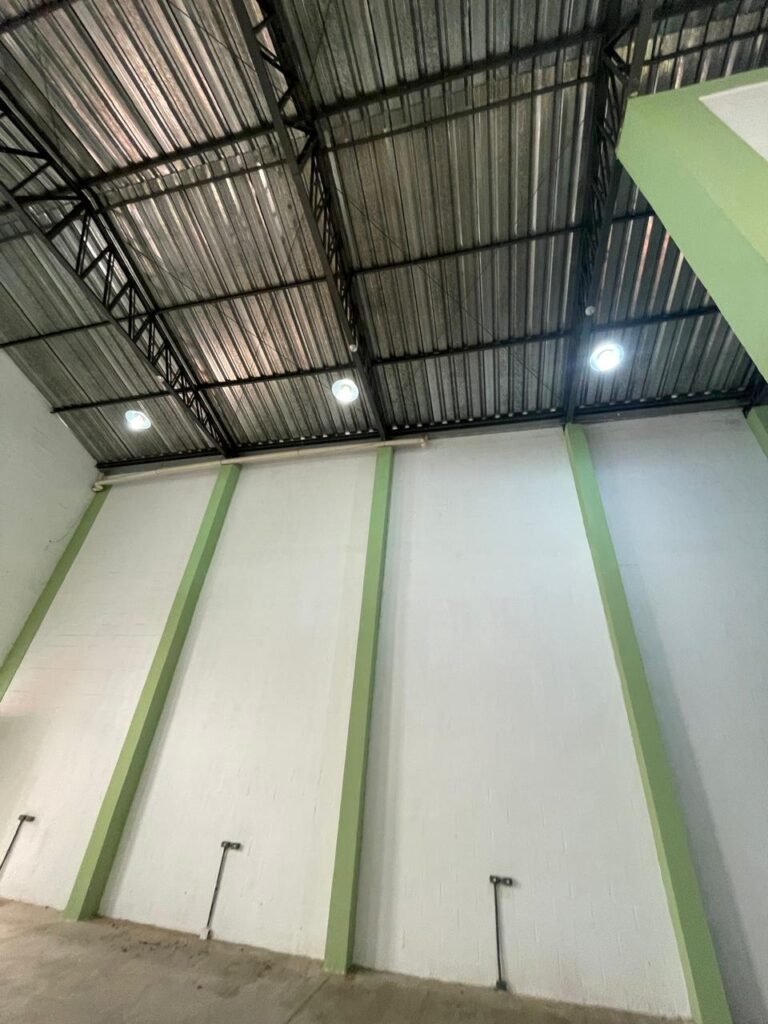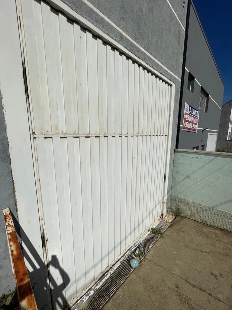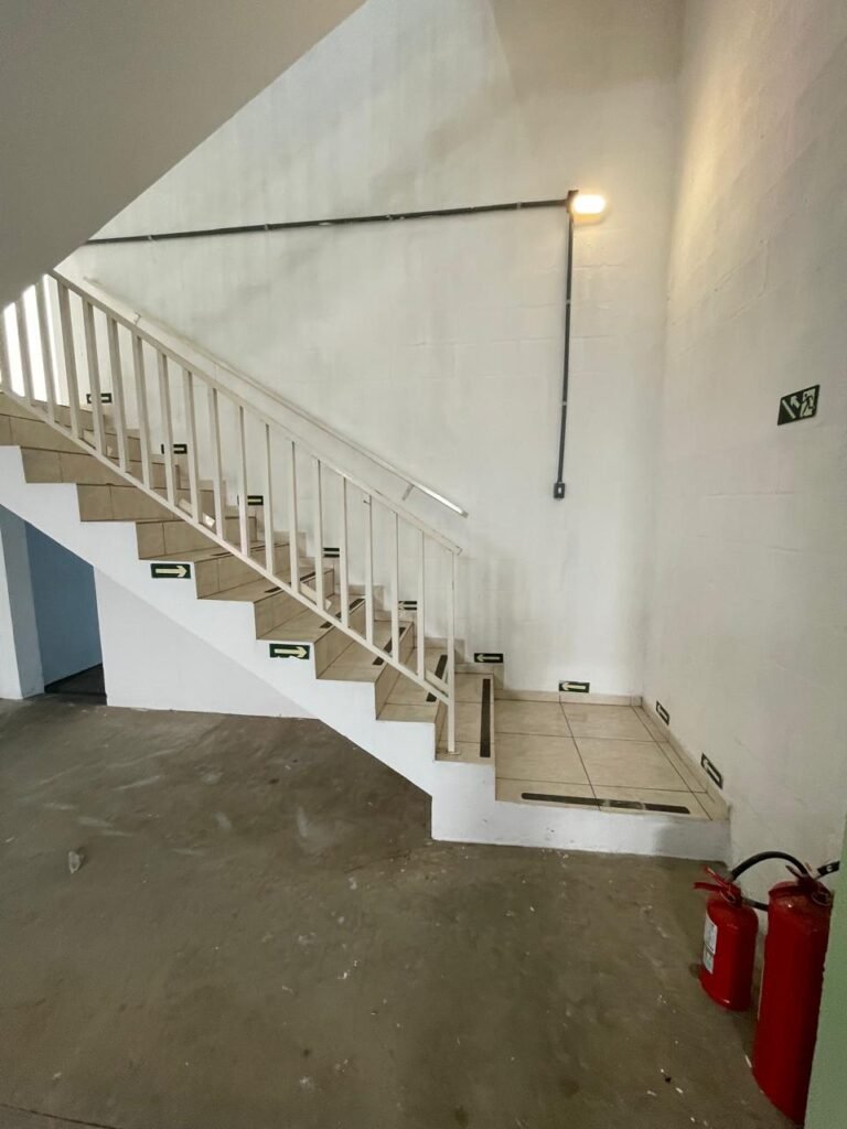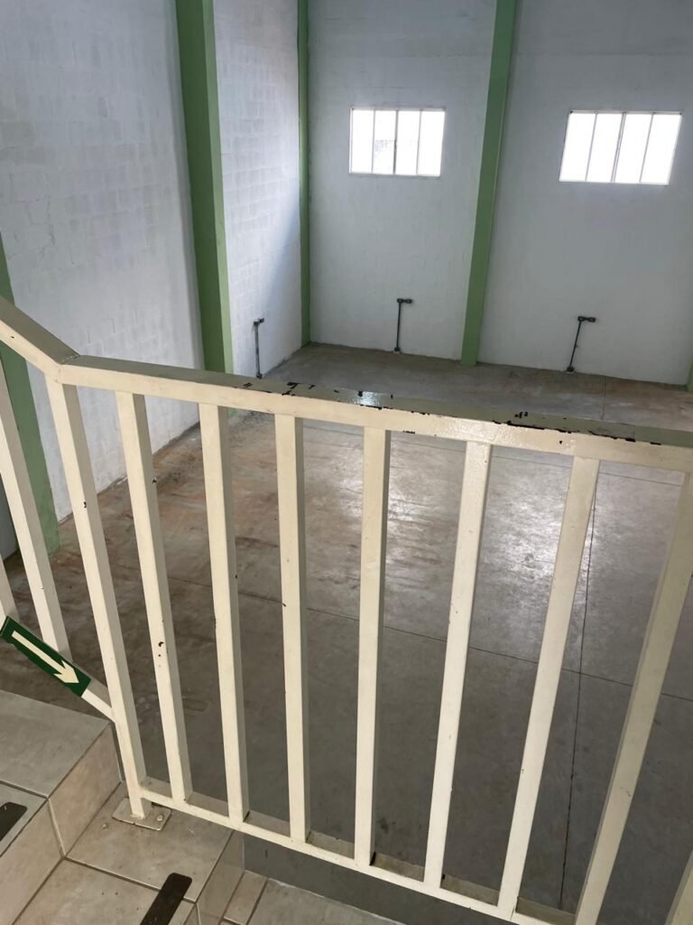 BARRACÃO-: Escada revestida de pisos frios cerâmicos com fitas antiderrapantes, com partes trincadas, alguns pisos soltos, acabamento de alvenaria com pintura na cor branco neve nova e em ordem, guarda corpo de ferro com pintura na cor branco com desgastes naturais, descasques pela extensão e restante em ordem, 02 corrimões de ferro com pintura na cor branco com desgastes naturais, descasques e restante em ordem, piso de concreto usinado com desgastes naturais, com manchas pela extensão e restante em ordem, paredes de blocos de concreto com pintura na cor branco neve nova e em ordem, pilares de alvenaria com pintura na cor verde nova e em ordem, 02 extintores de incêndio sendo, 01 de pó químico abc 2-A 20-B:C 4kg com validade em ordem e 01 com carga de água 10 litros, 2-A com validade em ordem, 02 interruptores, 20 tomadas, todos com espelhos de luz em ordem. 01 quadro de distribuição de disjuntores marca Brum em ordem, com 01 tampa em ordem, com disjuntores sendo: 01 SD 80A 3P, 01 SD C32 2P, 01 SD C20 1P e 01 SD C32 1P (Todos marca Steck), canos pvc canopla de registro em ordem, com 01 torneira de jardim em ordem, 01 portão de chapa dobrável de metalon, com pintura na cor branco com desgastes naturais, com descasques e restante em ordem, 01 puxador em ordem, 02 trincos com cadeados em ordem (01 marca Stam e 01 marca Pado) e com chaves, 01 porta social de metalon com pintura na cor branco com desgastes naturais, com 01 maçaneta em inox com manchas de tinta, com 01 fechadura marca Lmab em ordem e com chave, com 02 fechaduras tetras marca Stam em ordem e com 01 chave com mesmo segredo para ambas, 01 ralo em inox em ordem, estrutura de ferro do telhado com pintura na cor preto nova e em ordem, telhado revestido de telhas sanduíche em ordem, 06 luminárias pendentes todas com 01 lâmpada LED em ordem, 01 luminária modelo tartaruga com LED em ordem, 02 janelas deslizantes, ambas com fechaduras não testadas, com 01 trinco para cadeado em ordem, 04 janelas com um 04 folhas de vidro liso Blindex em cada, com manchas de tinta e restante em ordem, e com gradil de ferro de proteção, sendo que em 01 janela está com parte torta e restante está em ordem, ambas janelas com pintura na cor branco em ordem.