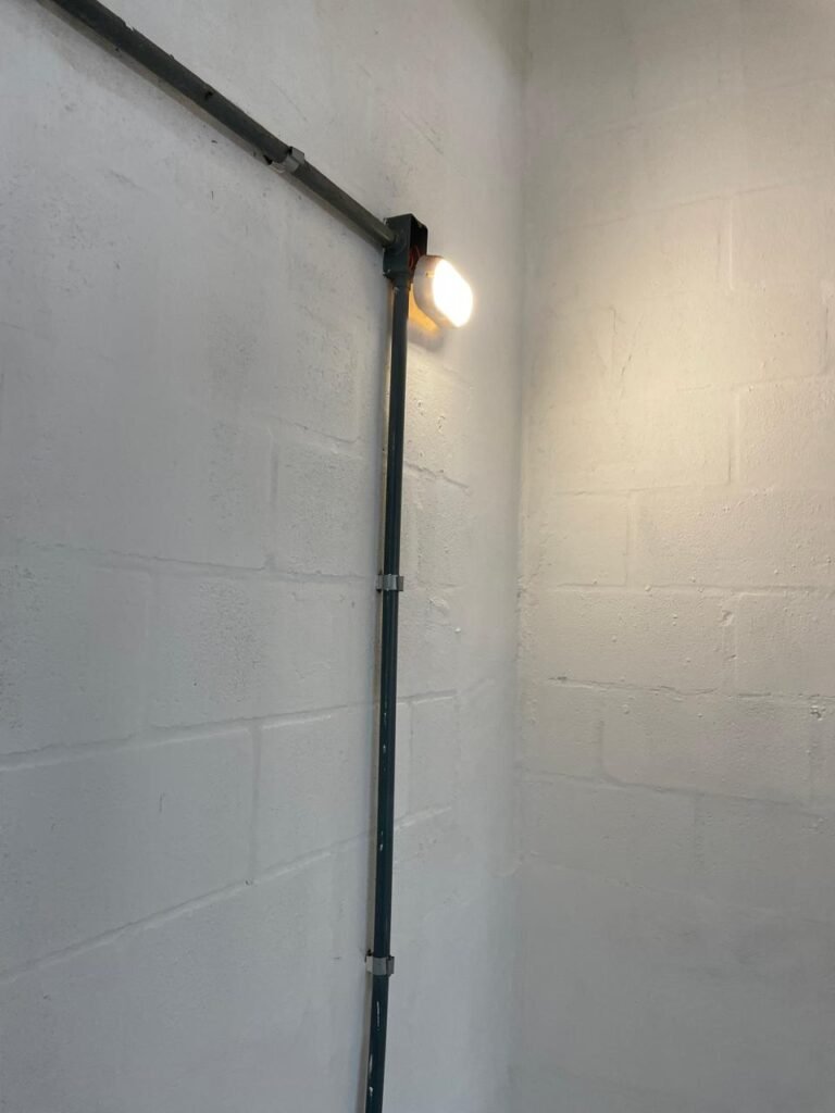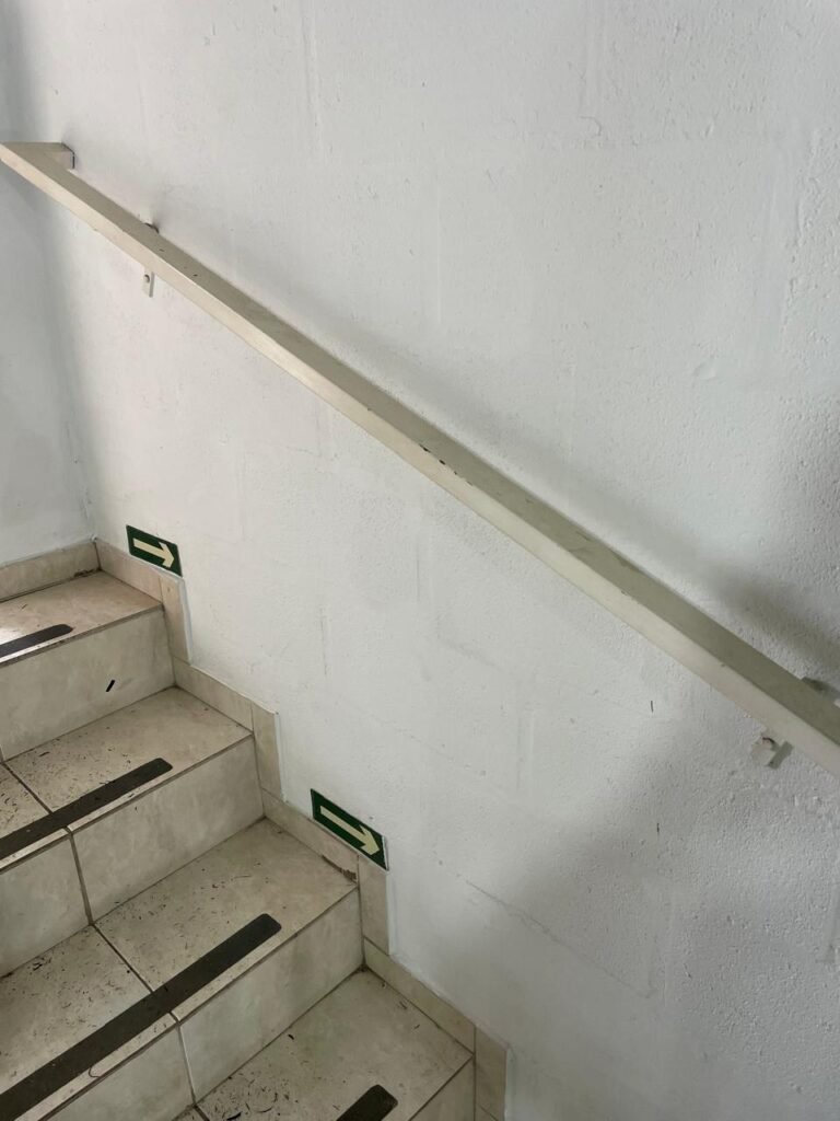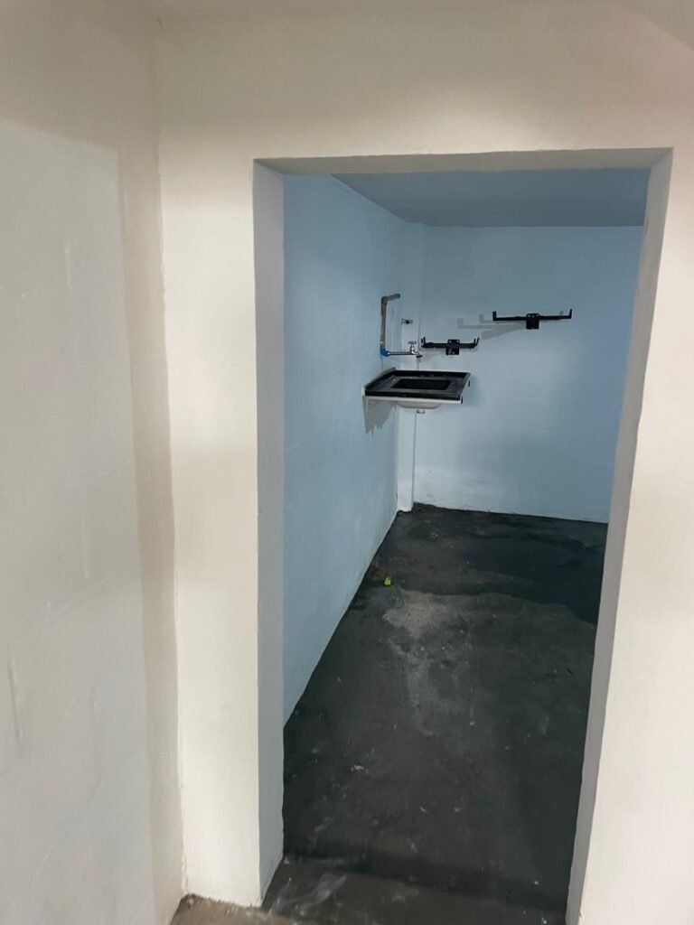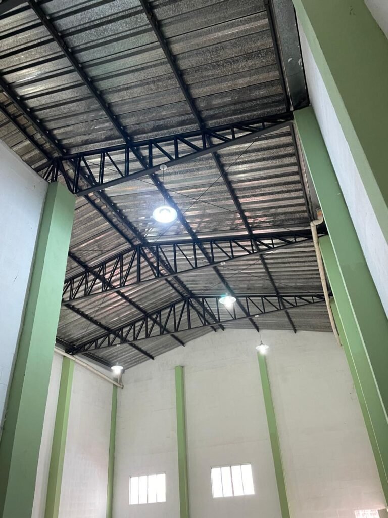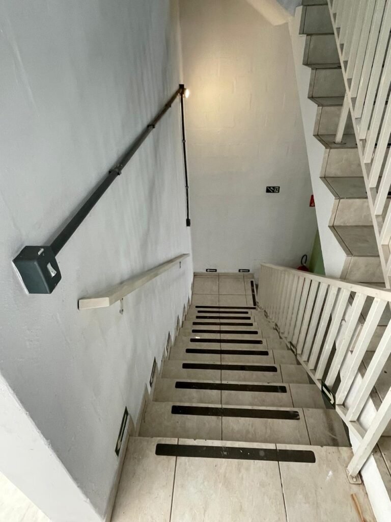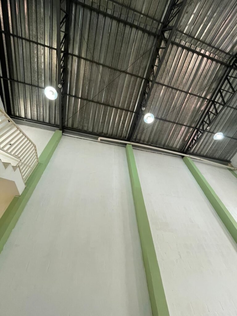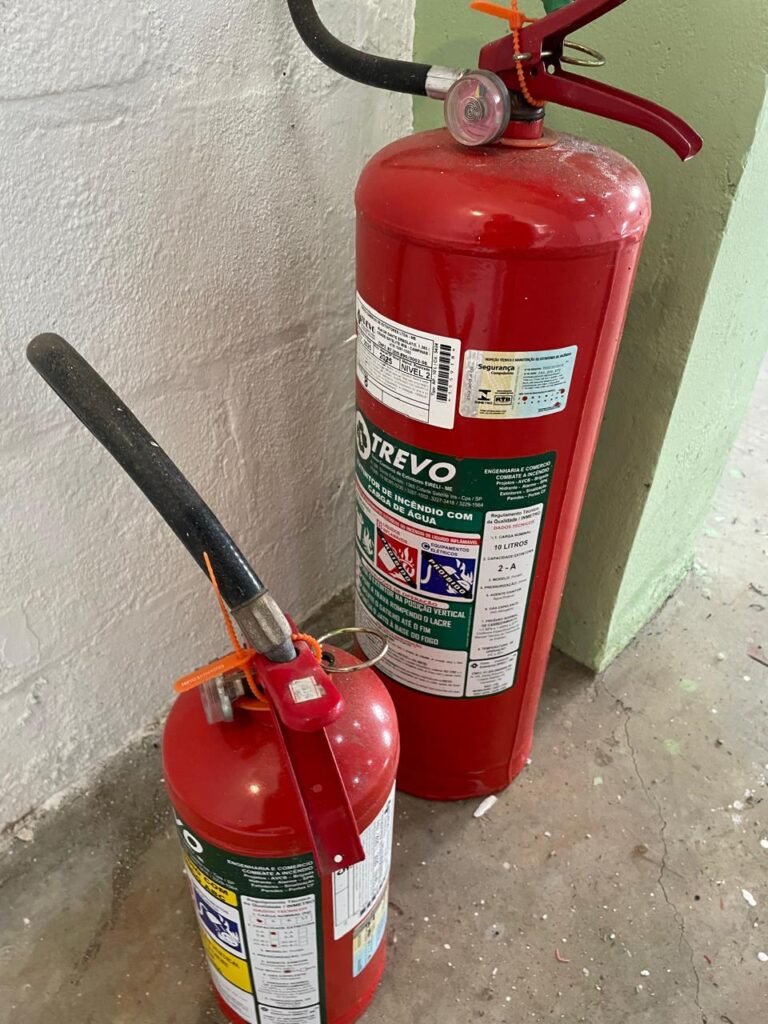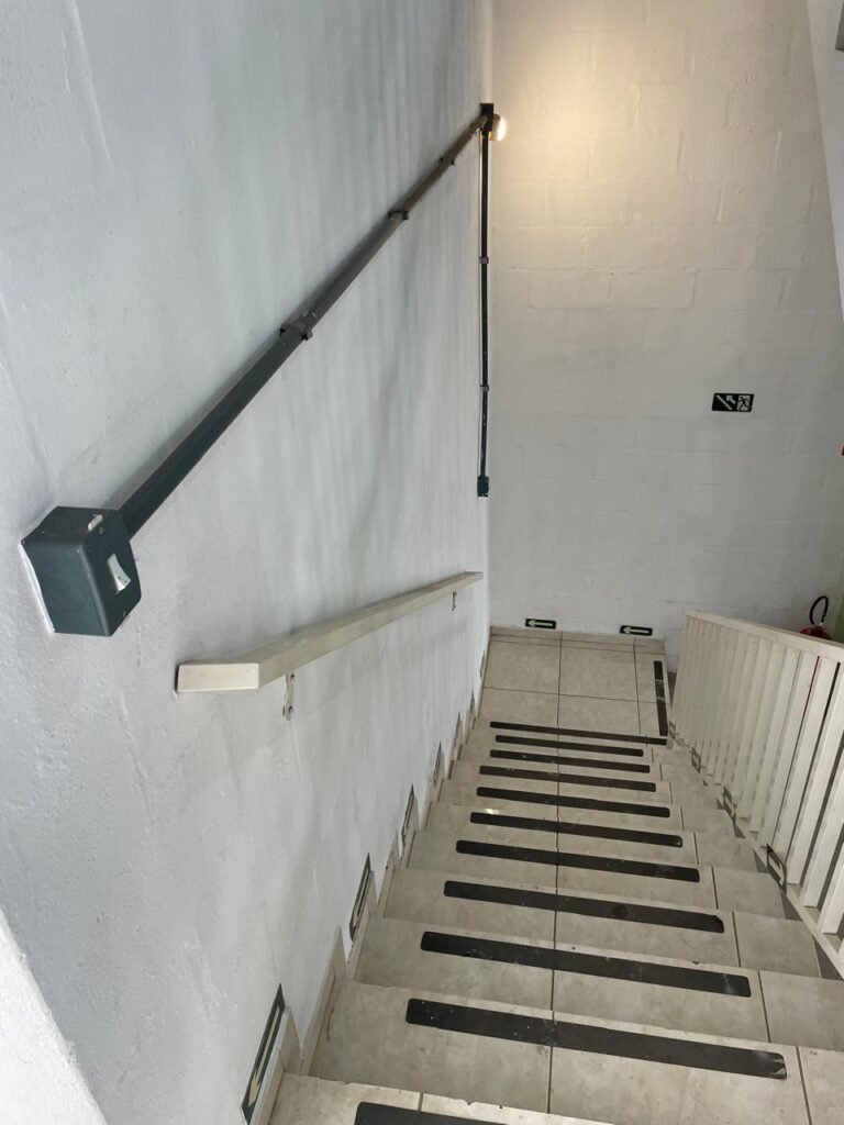 BARRACÃO-: Escada revestida de pisos frios cerâmicos com fitas antiderrapantes, com partes trincadas, alguns pisos soltos, acabamento de alvenaria com pintura na cor branco neve nova e em ordem, guarda corpo de ferro com pintura na cor branco com desgastes naturais, descasques pela extensão e restante em ordem, 02 corrimões de ferro com pintura na cor branco com desgastes naturais, descasques e restante em ordem, piso de concreto usinado com desgastes naturais, com manchas pela extensão e restante em ordem, paredes de blocos de concreto com pintura na cor branco neve nova e em ordem, pilares de alvenaria com pintura na cor verde nova e em ordem, 02 extintores de incêndio sendo, 01 de pó químico abc 2-A 20-B:C 4kg com validade em ordem e 01 com carga de água 10 litros, 2-A com validade em ordem, 02 interruptores, 20 tomadas, todos com espelhos de luz em ordem. 01 quadro de distribuição de disjuntores marca Brum em ordem, com 01 tampa em ordem, com disjuntores sendo: 01 SD 80A 3P, 01 SD C32 2P, 01 SD C20 1P e 01 SD C32 1P (Todos marca Steck), canos pvc canopla de registro em ordem, com 01 torneira de jardim em ordem, 01 portão de chapa dobrável de metalon, com pintura na cor branco com desgastes naturais, com descasques e restante em ordem, 01 puxador em ordem, 02 trincos com cadeados em ordem (01 marca Stam e 01 marca Pado) e com chaves, 01 porta social de metalon com pintura na cor branco com desgastes naturais, com 01 maçaneta em inox com manchas de tinta, com 01 fechadura marca Lmab em ordem e com chave, com 02 fechaduras tetras marca Stam em ordem e com 01 chave com mesmo segredo para ambas, 01 ralo em inox em ordem, estrutura de ferro do telhado com pintura na cor preto nova e em ordem, telhado revestido de telhas sanduíche em ordem, 06 luminárias pendentes todas com 01 lâmpada LED em ordem, 01 luminária modelo tartaruga com LED em ordem, 02 janelas deslizantes, ambas com fechaduras não testadas, com 01 trinco para cadeado em ordem, 04 janelas com um 04 folhas de vidro liso Blindex em cada, com manchas de tinta e restante em ordem, e com gradil de ferro de proteção, sendo que em 01 janela está com parte torta e restante está em ordem, ambas janelas com pintura na cor branco em ordem.