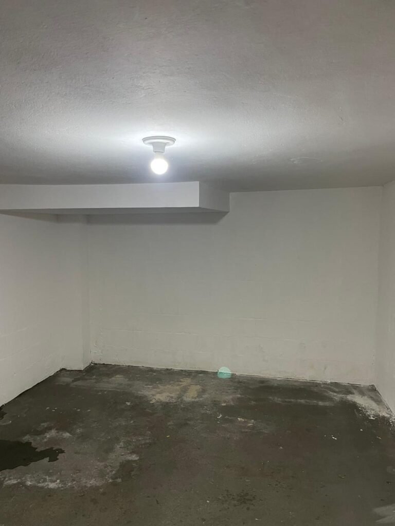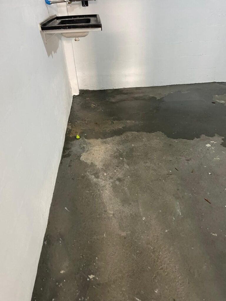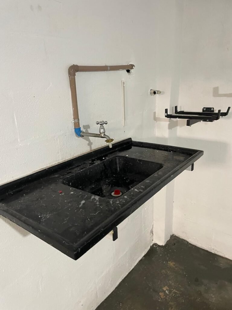 COPA-: Piso de concreto com pintura na cor cinza com desgastes naturais, com descasques pela extensão, com manchas e restante em ordem, paredes e teto com pintura na cor branco neve nova, com pequenas manchas e restante em ordem, 01 interruptor com espelho de luz em ordem e com canaleta com fio aparente e 01 tomada, 02 estruturas de suporte para eletrodomésticos em ordem, 01 pia de resina na cor preto com detalhes e restante em ordem, 01 torneira em inox em ordem, sem sifão, 01 bocal com 01 lâmpada LED em ordem, 01 ponto de água aberto.