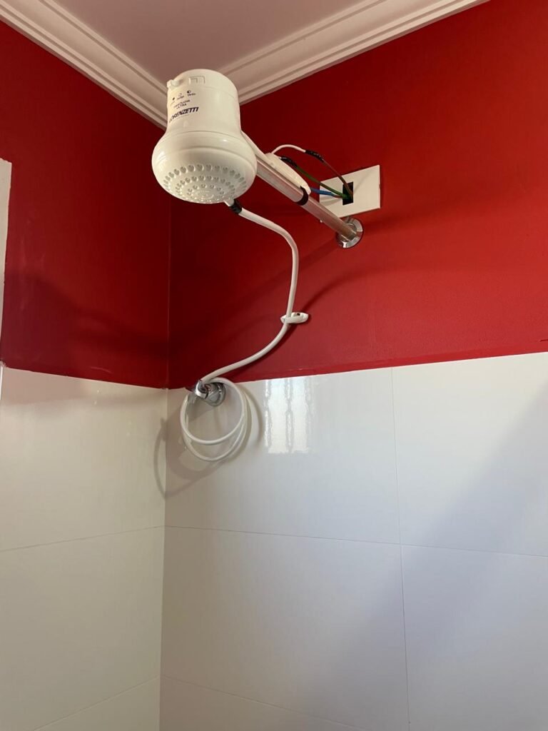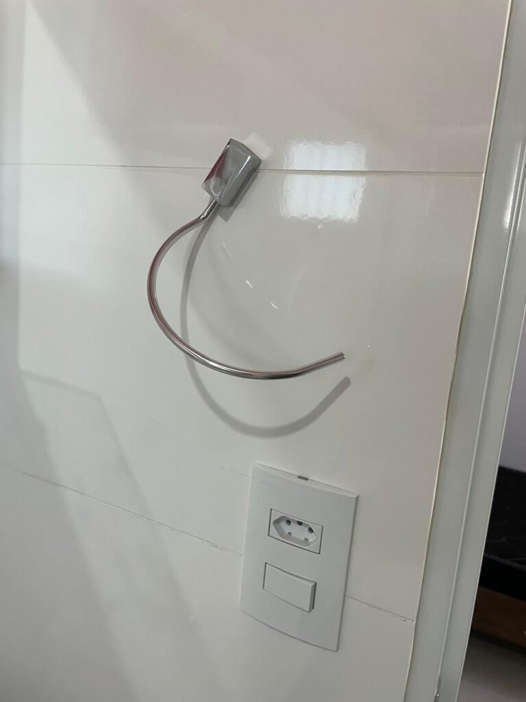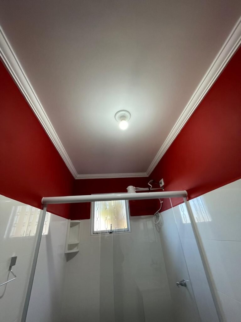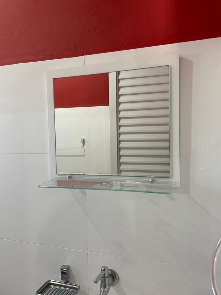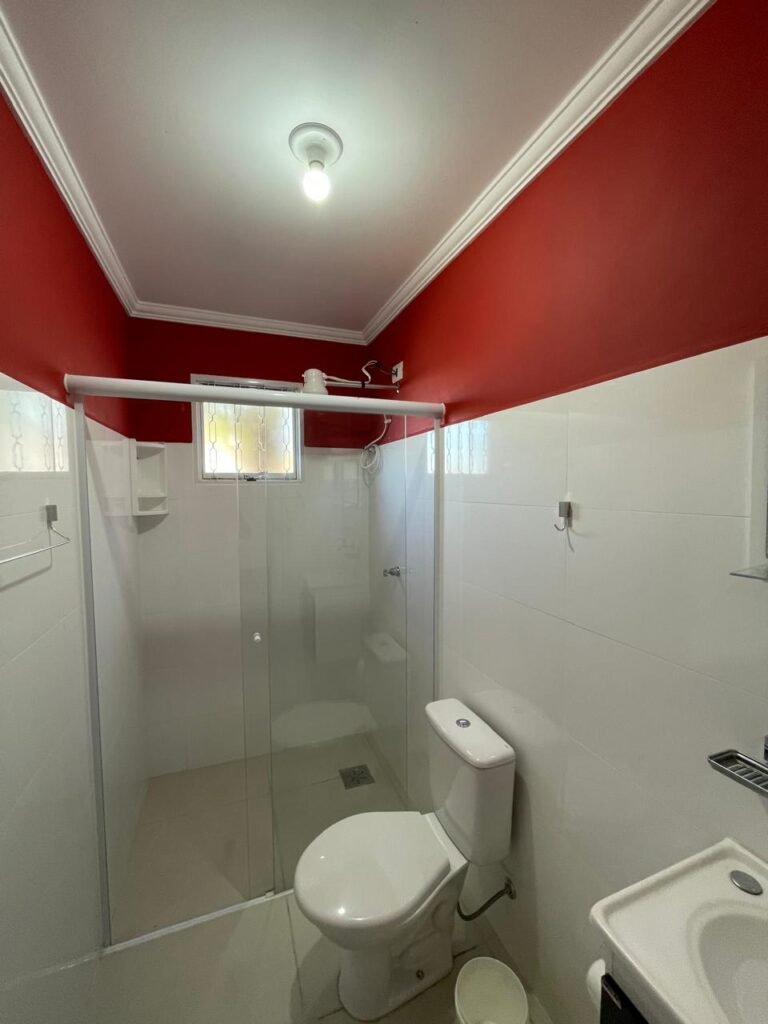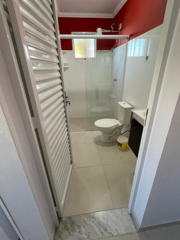 Banheiro:- Porta em Alumínio Sasazaki com a pintura eletrostática na cor branco em ordem, com chaves em ordem, maçaneta e fechadura marca Stam em ordem, dobradiças em ordem, soleira mármore branco em ordem, piso porcelanato bege mesclado em ordem, quatro paredes com azulejos brancos meia parede em ordem, restante com a pintura na cor vermelho com manchas de infiltração restante em ordem, teto com a pintura na cor branco em ordem, gola de gesso com a pintura na cor branco em ordem, spot com lâmpada de led em ordem, uma janela basculante Alumínio Sasasaki com grades e com a pintura na cor branco em ordem, puxador em ordem, um vidro jateado em ordem, um kit de vaso sanitário e caia acoplada marca Deca em ordem, uma tampa de vaso marca Deca em ordem, uma pia sintética em ordem, um sifão branco desentupido em ordem, uma válvula de ralo de metal em ordem, uma torneira de bica móvel em ordem, uma tampa em ordem, um gabinete MDF branco marca MGM contendo uma porta de abrir com a pintura na cor preta em ordem, com um puxador em ordem, com duas dobradiças em ordem, uma espelheira para banheiro MDF na cor branco em ordem, com uma prateleira de vidro em ordem, uma saboneteira de inox em ordem, dois porta toalhas de inox em ordem, um porta toalhas de banheiro de inox em ordem, um porta papel higiênico inox em ordem, uma lixeira banheiro em ordem, um Box blindex com duas folhas sendo uma fixa e outra de correr em ordem, um chuveiro 220 v marca Lorenzetti completo em ordem, um registro marca Deca em ordem, uma canopla marca Deca em ordem, um ralo de inox desentupido em ordem, uma cantoneira plástico para porta shampoo em ordem, um spot com lâmpada de led em ordem, um espelho com módulo duplo de energia e luz marca Margirus completo em ordem, uma caixa distribuição de energia de embutir marca Tigre com tampa em ordem, sete djusntores marca Steck em ordem.