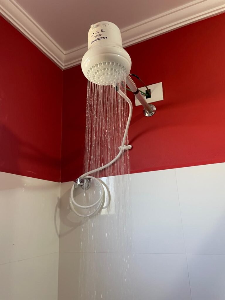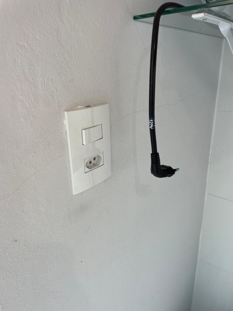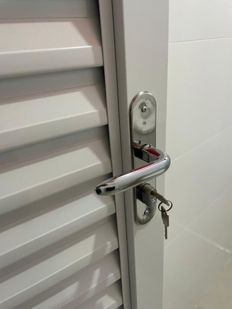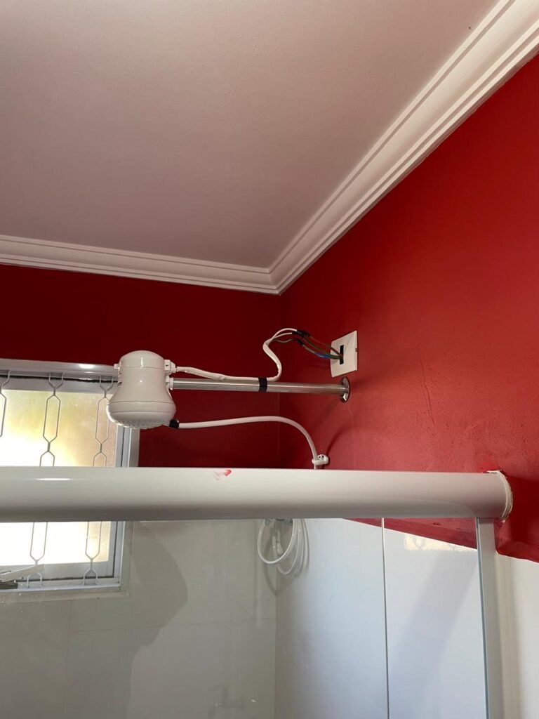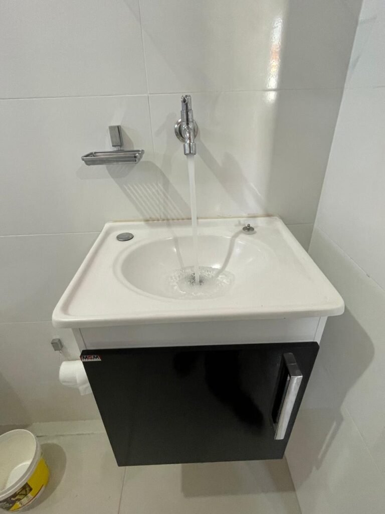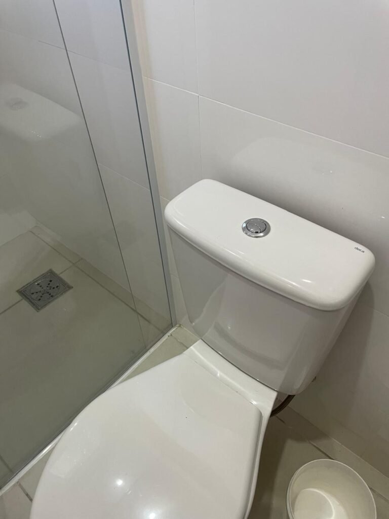 Banheiro:- Porta em Alumínio Sasazaki com a pintura eletrostática na cor branco em ordem, com chaves em ordem, maçaneta e fechadura marca Stam em ordem, dobradiças em ordem, soleira mármore branco em ordem, piso porcelanato bege mesclado em ordem, quatro paredes com azulejos brancos meia parede em ordem, restante com a pintura na cor vermelho com manchas de infiltração restante em ordem, teto com a pintura na cor branco em ordem, gola de gesso com a pintura na cor branco em ordem, spot com lâmpada de led em ordem, uma janela basculante Alumínio Sasasaki com grades e com a pintura na cor branco em ordem, puxador em ordem, um vidro jateado em ordem, um kit de vaso sanitário e caia acoplada marca Deca em ordem, uma tampa de vaso marca Deca em ordem, uma pia sintética em ordem, um sifão branco desentupido em ordem, uma válvula de ralo de metal em ordem, uma torneira de bica móvel em ordem, uma tampa em ordem, um gabinete MDF branco marca MGM contendo uma porta de abrir com a pintura na cor preta em ordem, com um puxador em ordem, com duas dobradiças em ordem, uma espelheira para banheiro MDF na cor branco em ordem, com uma prateleira de vidro em ordem, uma saboneteira de inox em ordem, dois porta toalhas de inox em ordem, um porta toalhas de banheiro de inox em ordem, um porta papel higiênico inox em ordem, uma lixeira banheiro em ordem, um Box blindex com duas folhas sendo uma fixa e outra de correr em ordem, um chuveiro 220 v marca Lorenzetti completo em ordem, um registro marca Deca em ordem, uma canopla marca Deca em ordem, um ralo de inox desentupido em ordem, uma cantoneira plástico para porta shampoo em ordem, um spot com lâmpada de led em ordem, um espelho com módulo duplo de energia e luz marca Margirus completo em ordem, uma caixa distribuição de energia de embutir marca Tigre com tampa em ordem, sete djusntores marca Steck em ordem.