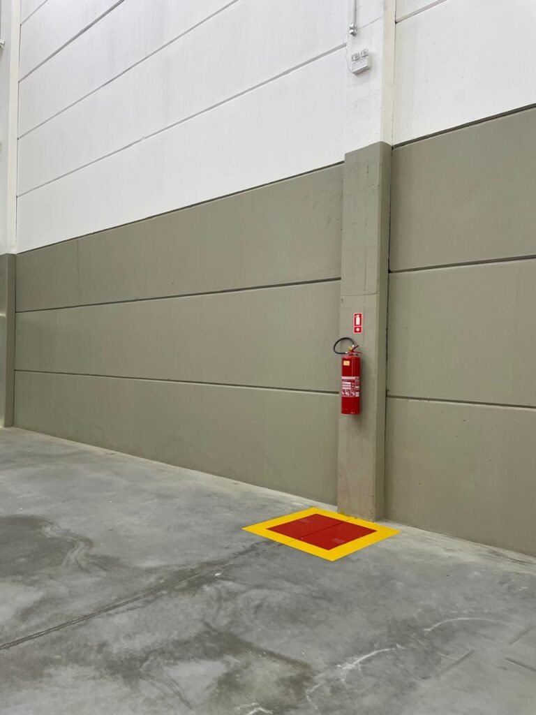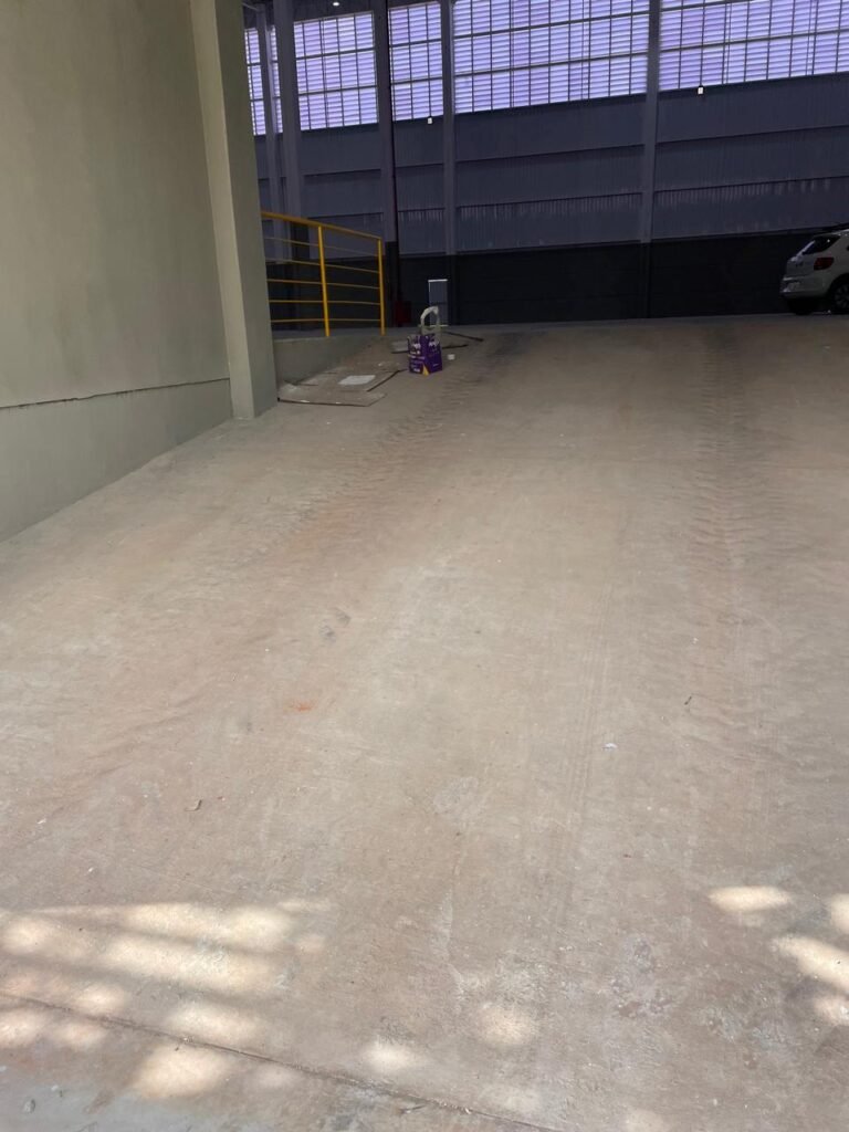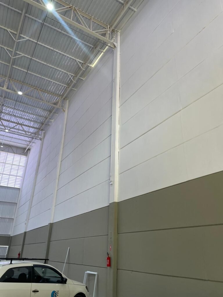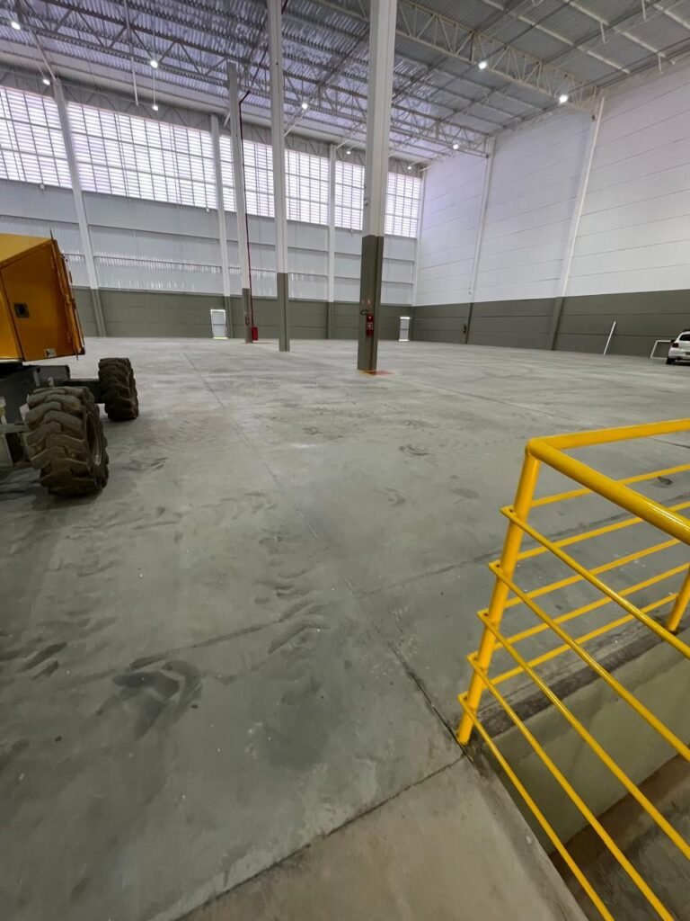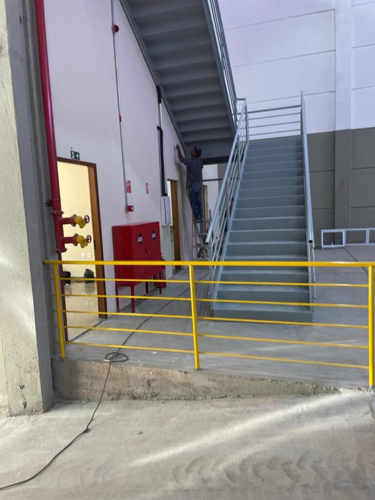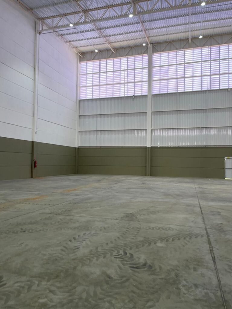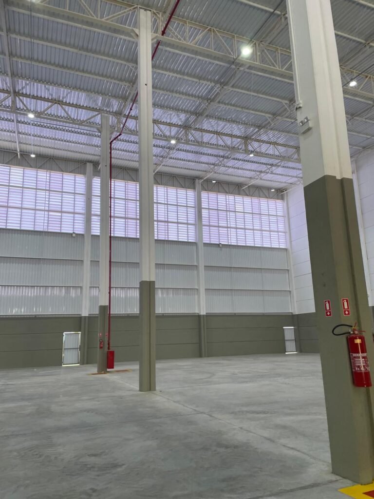 INTERIOR GALPÕES -: Piso em concreto usinado estrutural novo e em ordem, 06 guarda corpos com pintura na cor amarela nova e em ordem, paredes com pintura 1/2 na cor concreto nova e em ordem, restante 2/2 na cor branco neve nova e em ordem, 01 sensor de presença em ordem, estrutura metálica do telhado com telhas galvanizadas novas e em ordem, 30 luminárias de de 300w com led em ordem, 06 luminárias de emergência em ordem, 03 sistemas lineares de incêndio em ordem, 03 caixas duplas de hidrante em ordem, 08 extintores na validade e em ordem, sendo eles, 04 de água e 04 de pó químico BC, 02 portas sociais em chapa dobrada e com fechamento em telhas galvanizadas cor branco em ordem, 01 fechadura em ordem com chave, 02 escadas com guarda corpos novas e em ordem, com pintura na cor cinza médio nova e em ordem, 02 caixas de distruibuição de disjuntores, com tampas e fechaduras em ordem, sendo eles, 01 marca Steck SD C63 3P e 08 marca Elitek ED6 2P em ordem da primeira caixa (galpão 05), e na outra (galpão 06) sendo idêntica, 02 espelhos de luz com 02 tomadas em ordem.