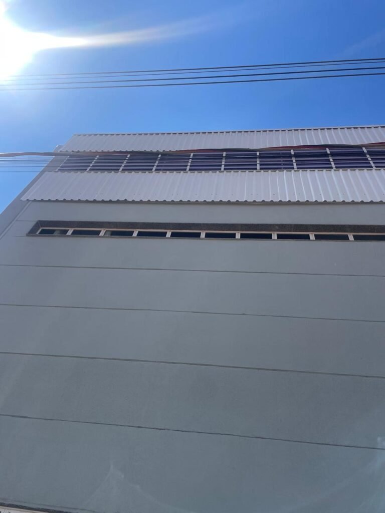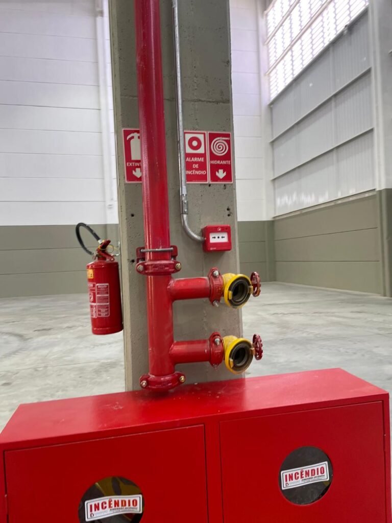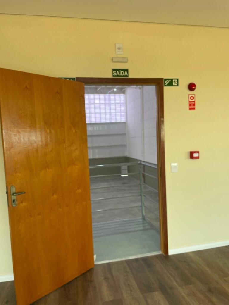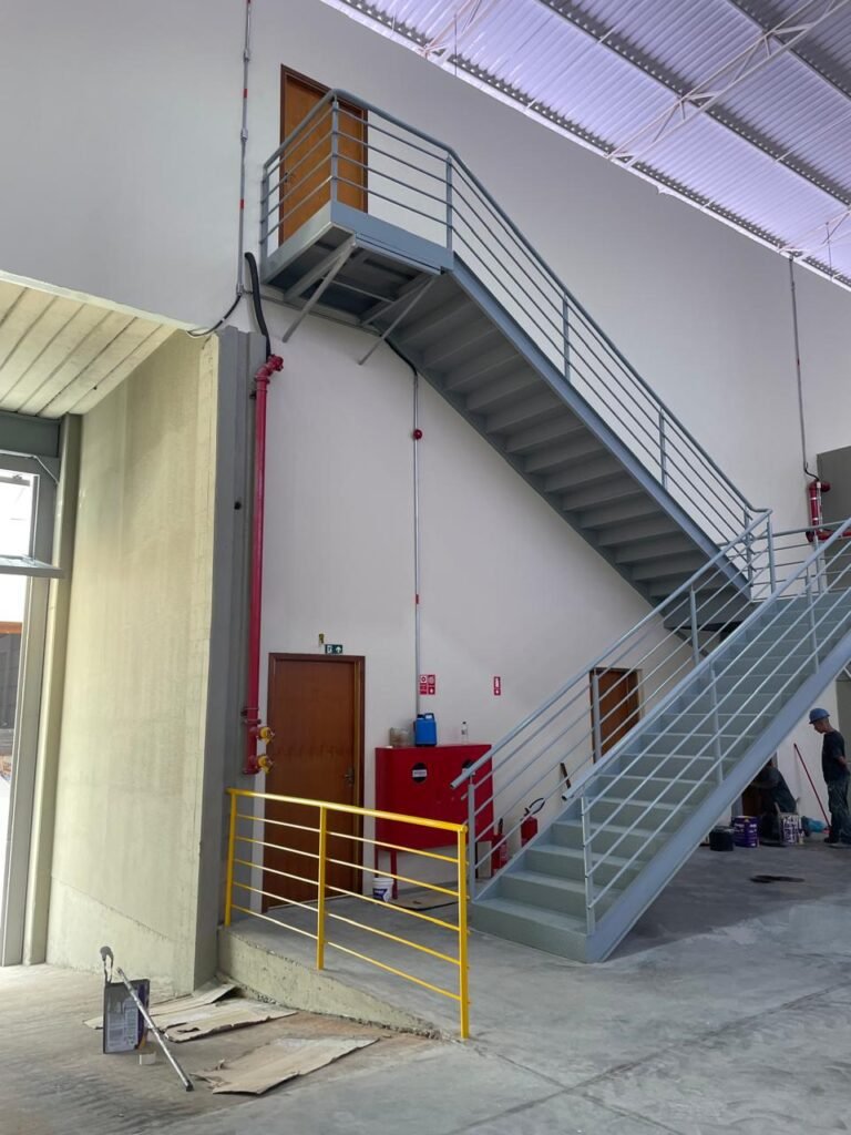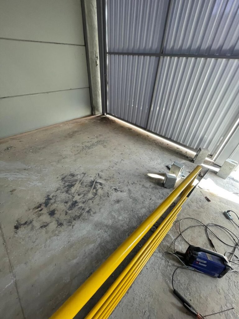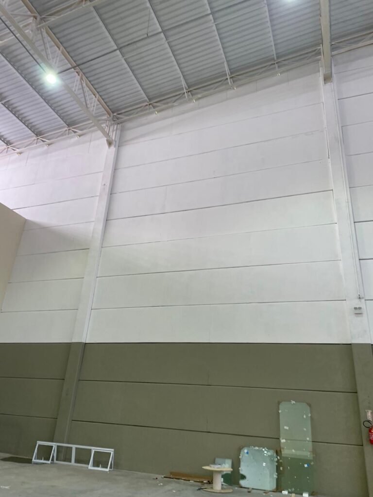 INTERIOR GALPÕES -: Piso em concreto usinado estrutural novo e em ordem, 06 guarda corpos com pintura na cor amarela nova e em ordem, paredes com pintura 1/2 na cor concreto nova e em ordem, restante 2/2 na cor branco neve nova e em ordem, 01 sensor de presença em ordem, estrutura metálica do telhado com telhas galvanizadas novas e em ordem, 30 luminárias de de 300w com led em ordem, 06 luminárias de emergência em ordem, 03 sistemas lineares de incêndio em ordem, 03 caixas duplas de hidrante em ordem, 08 extintores na validade e em ordem, sendo eles, 04 de água e 04 de pó químico BC, 02 portas sociais em chapa dobrada e com fechamento em telhas galvanizadas cor branco em ordem, 01 fechadura em ordem com chave, 02 escadas com guarda corpos novas e em ordem, com pintura na cor cinza médio nova e em ordem, 02 caixas de distruibuição de disjuntores, com tampas e fechaduras em ordem, sendo eles, 01 marca Steck SD C63 3P e 08 marca Elitek ED6 2P em ordem da primeira caixa (galpão 05), e na outra (galpão 06) sendo idêntica, 02 espelhos de luz com 02 tomadas em ordem.