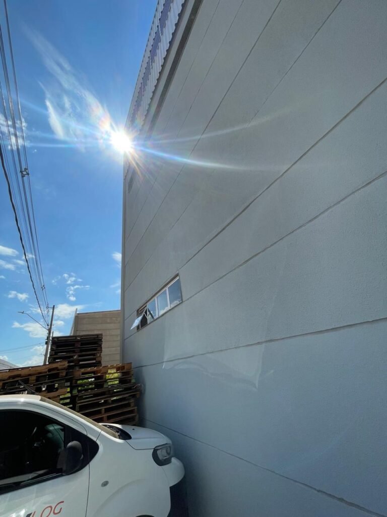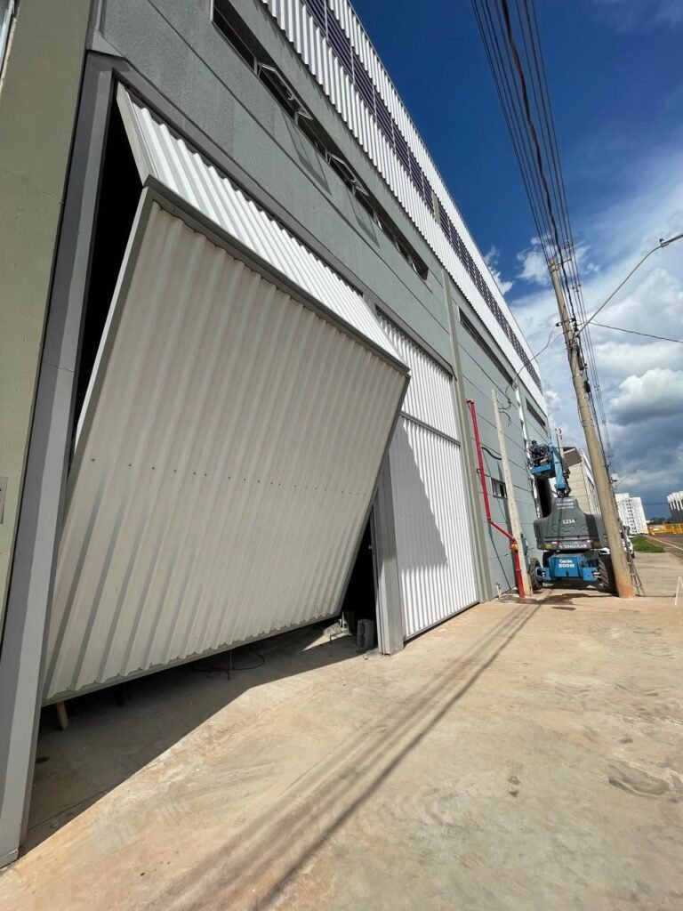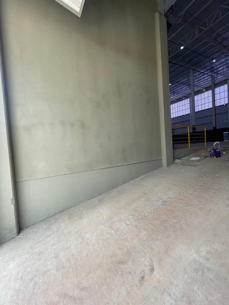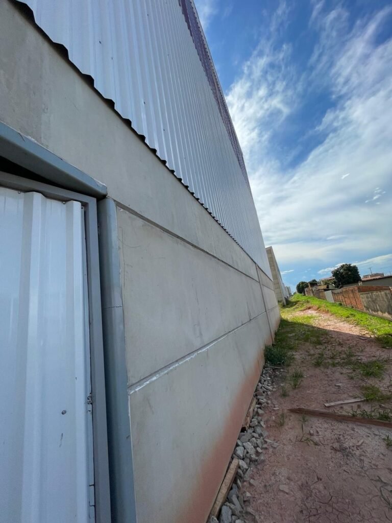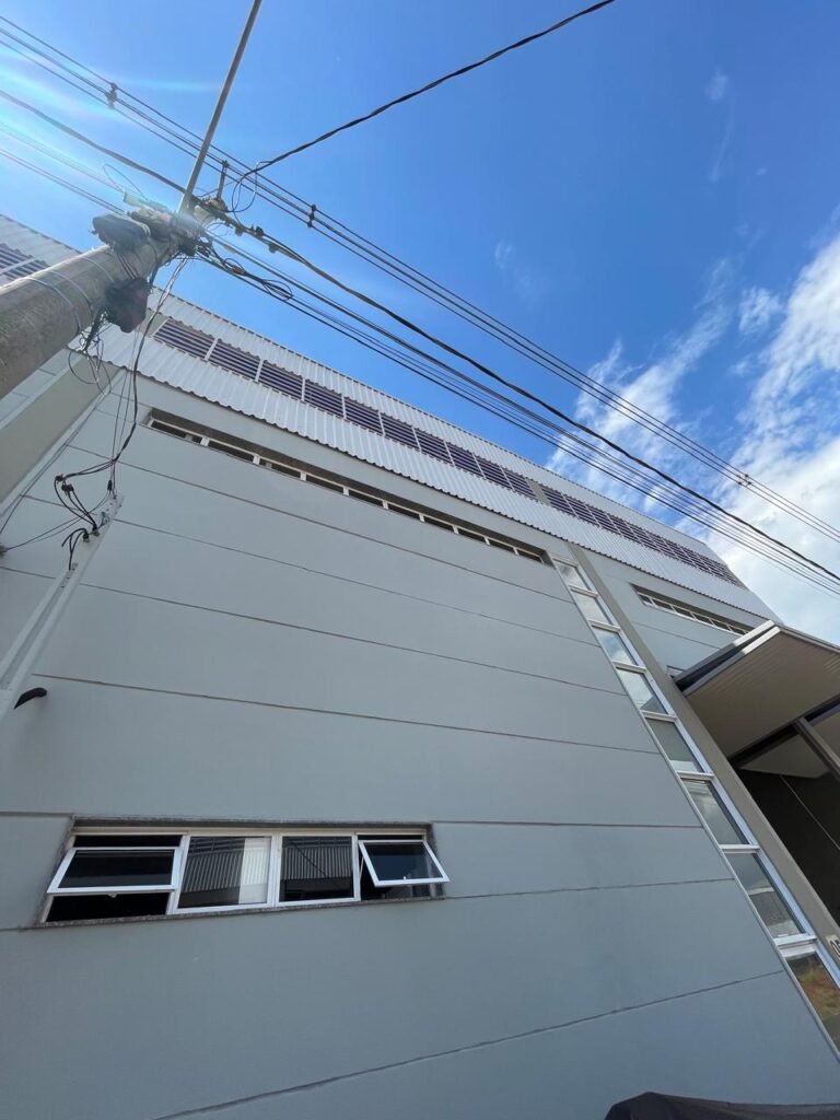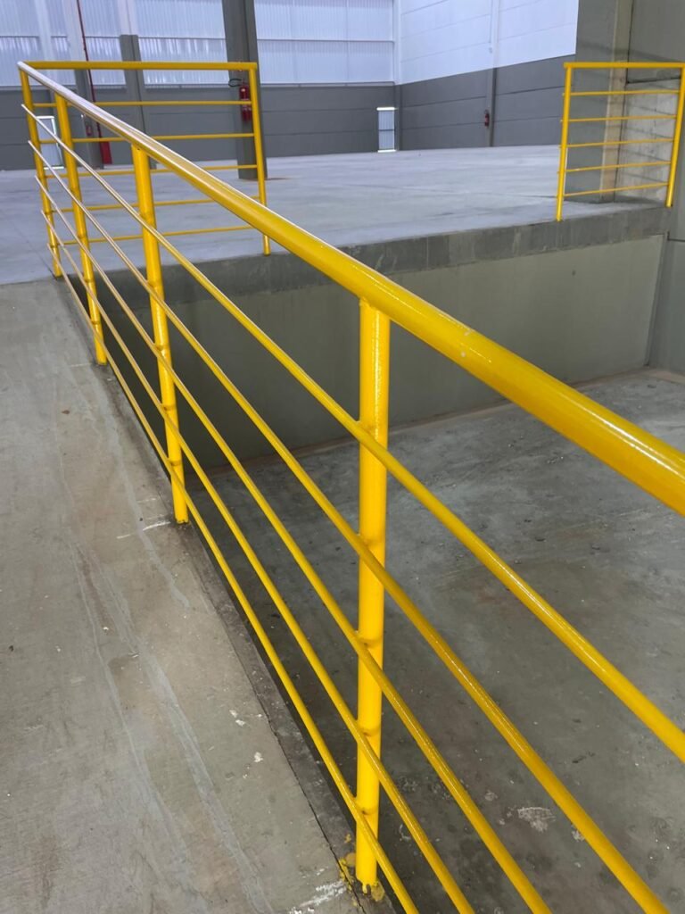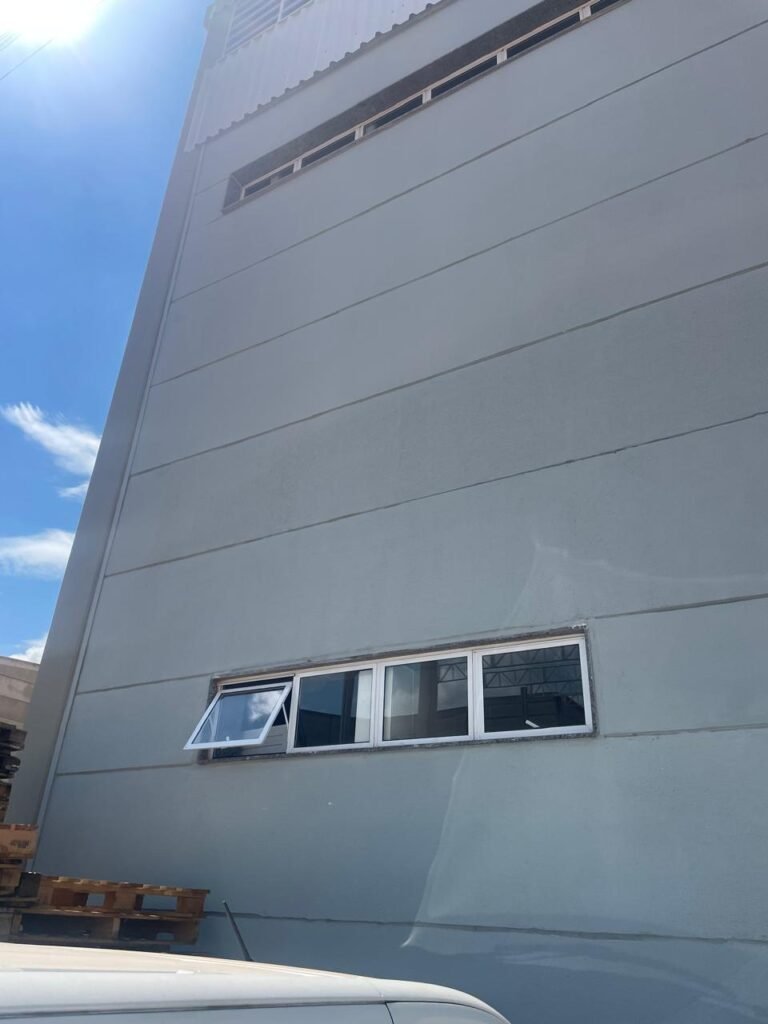 INTERIOR GALPÕES -: Piso em concreto usinado estrutural novo e em ordem, 06 guarda corpos com pintura na cor amarela nova e em ordem, paredes com pintura 1/2 na cor concreto nova e em ordem, restante 2/2 na cor branco neve nova e em ordem, 01 sensor de presença em ordem, estrutura metálica do telhado com telhas galvanizadas novas e em ordem, 30 luminárias de de 300w com led em ordem, 06 luminárias de emergência em ordem, 03 sistemas lineares de incêndio em ordem, 03 caixas duplas de hidrante em ordem, 08 extintores na validade e em ordem, sendo eles, 04 de água e 04 de pó químico BC, 02 portas sociais em chapa dobrada e com fechamento em telhas galvanizadas cor branco em ordem, 01 fechadura em ordem com chave, 02 escadas com guarda corpos novas e em ordem, com pintura na cor cinza médio nova e em ordem, 02 caixas de distruibuição de disjuntores, com tampas e fechaduras em ordem, sendo eles, 01 marca Steck SD C63 3P e 08 marca Elitek ED6 2P em ordem da primeira caixa (galpão 05), e na outra (galpão 06) sendo idêntica, 02 espelhos de luz com 02 tomadas em ordem.