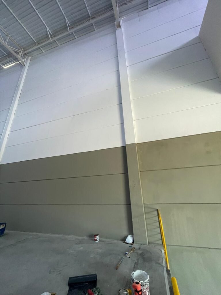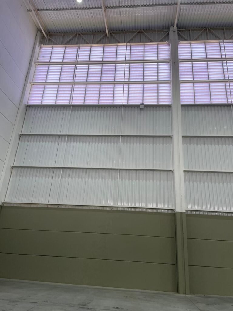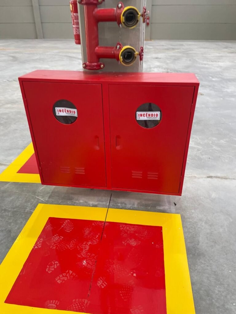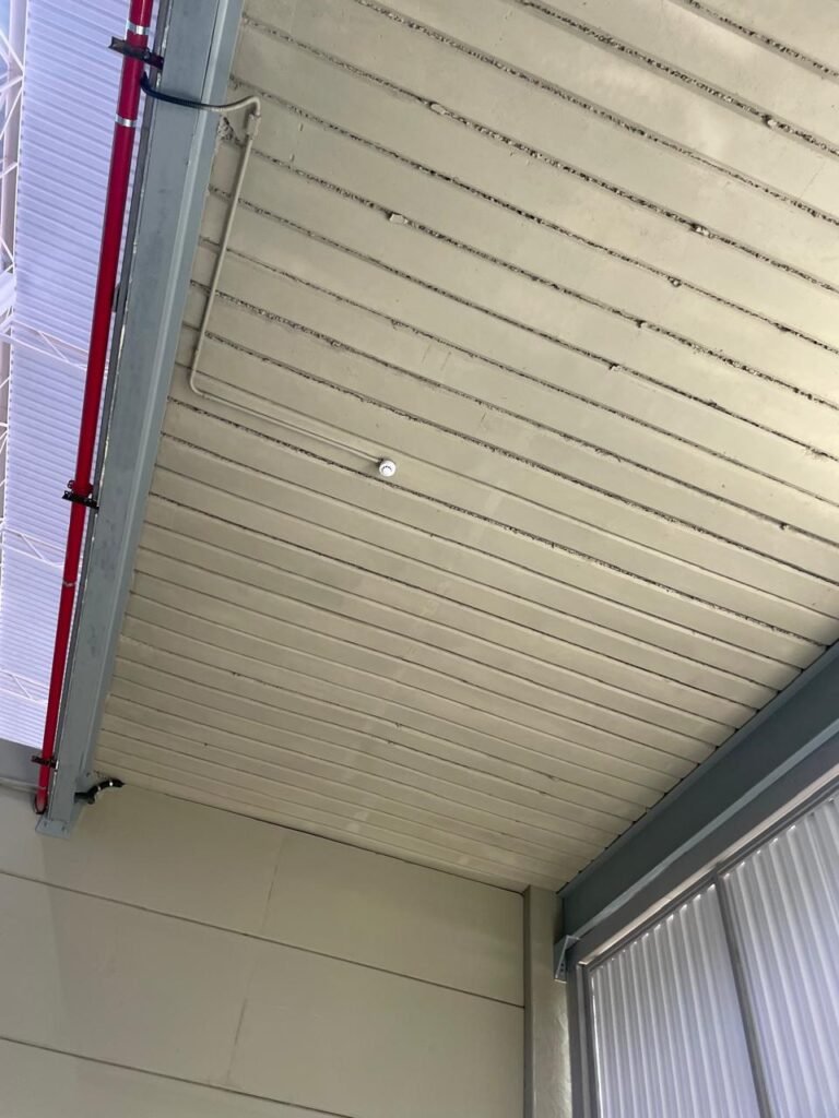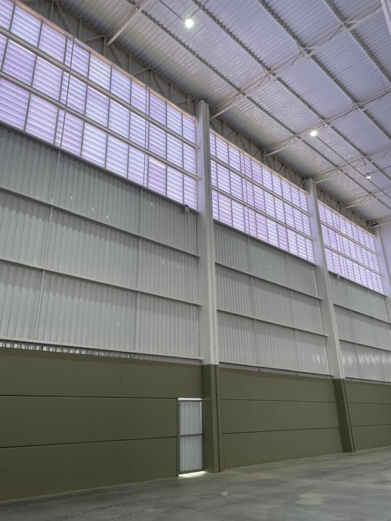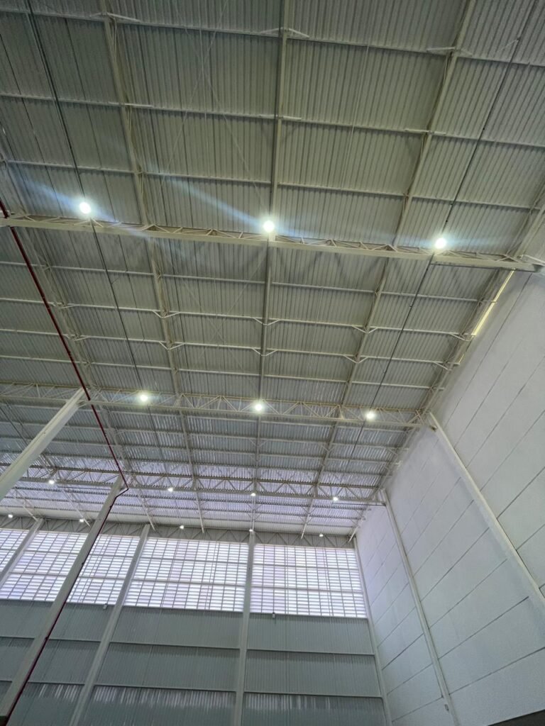 INTERIOR GALPÕES -: Piso em concreto usinado estrutural novo e em ordem, 06 guarda corpos com pintura na cor amarela nova e em ordem, paredes com pintura 1/2 na cor concreto nova e em ordem, restante 2/2 na cor branco neve nova e em ordem, 01 sensor de presença em ordem, estrutura metálica do telhado com telhas galvanizadas novas e em ordem, 30 luminárias de de 300w com led em ordem, 06 luminárias de emergência em ordem, 03 sistemas lineares de incêndio em ordem, 03 caixas duplas de hidrante em ordem, 08 extintores na validade e em ordem, sendo eles, 04 de água e 04 de pó químico BC, 02 portas sociais em chapa dobrada e com fechamento em telhas galvanizadas cor branco em ordem, 01 fechadura em ordem com chave, 02 escadas com guarda corpos novas e em ordem, com pintura na cor cinza médio nova e em ordem, 02 caixas de distruibuição de disjuntores, com tampas e fechaduras em ordem, sendo eles, 01 marca Steck SD C63 3P e 08 marca Elitek ED6 2P em ordem da primeira caixa (galpão 05), e na outra (galpão 06) sendo idêntica, 02 espelhos de luz com 02 tomadas em ordem.
