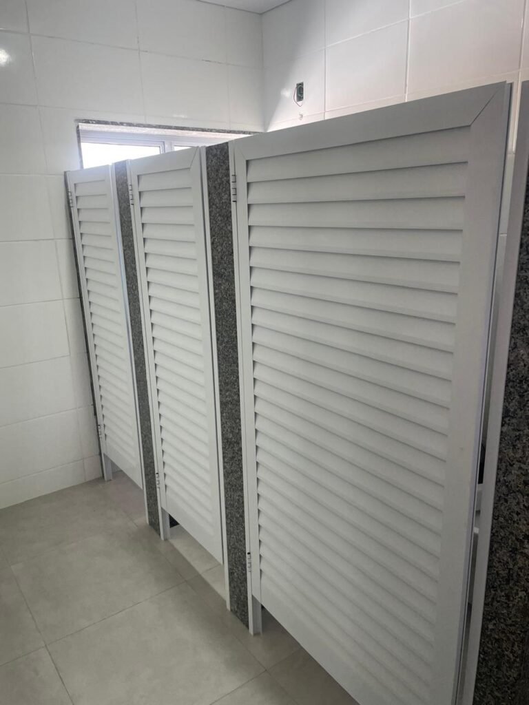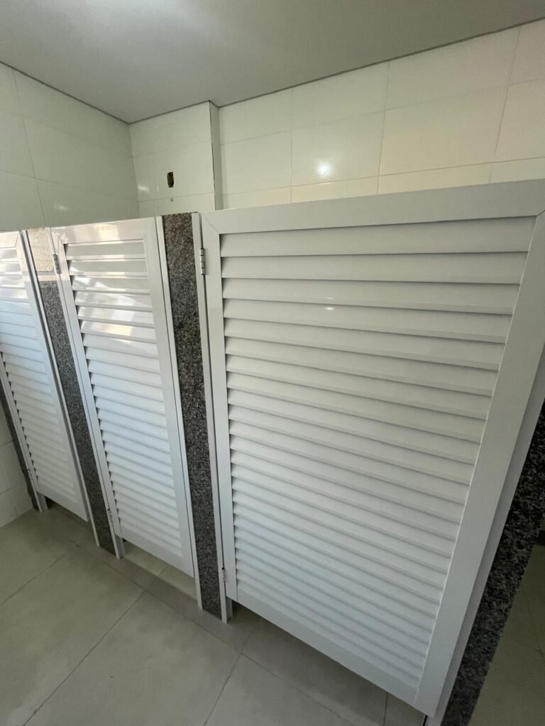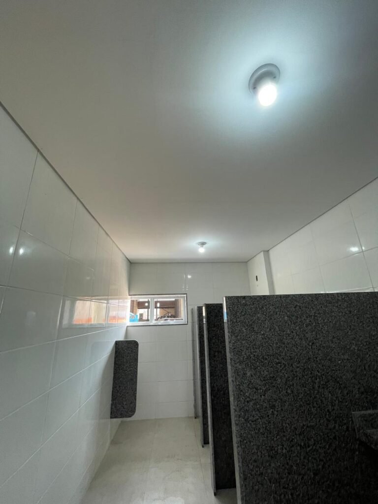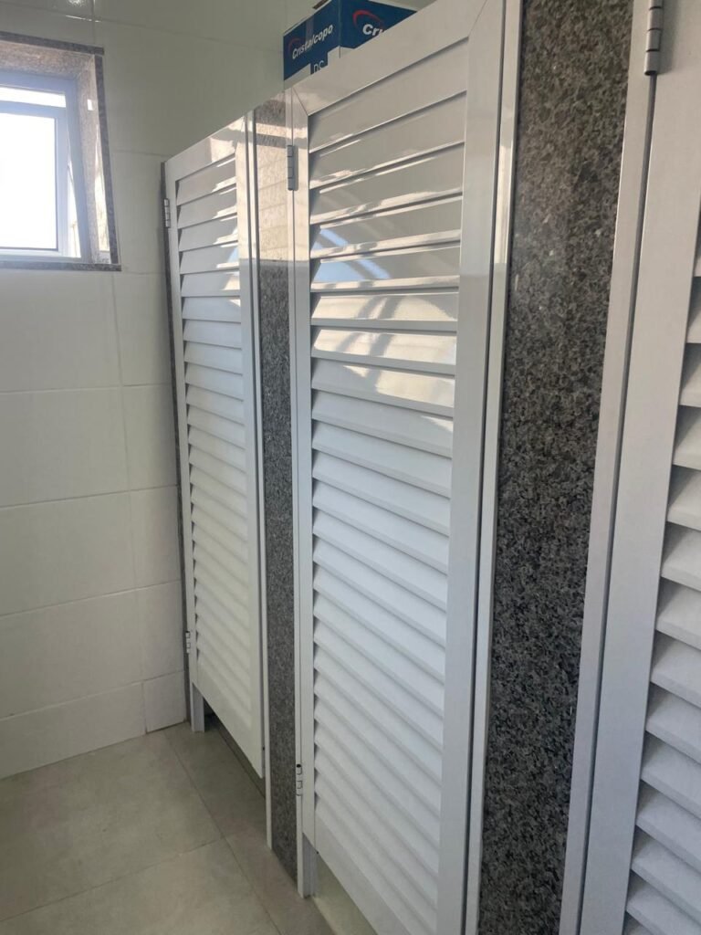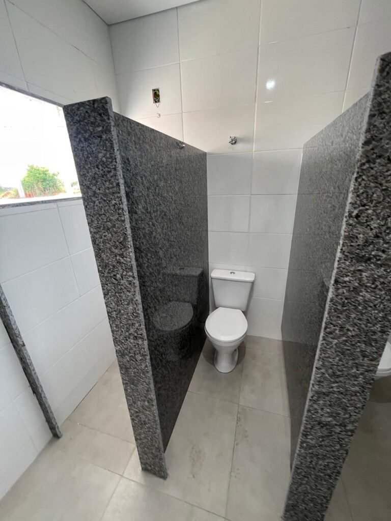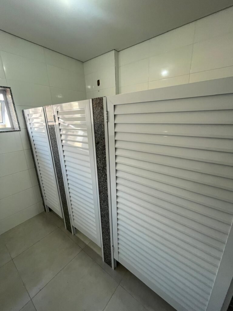 VESTIÁRIO MASCULINO (05) -: 01 porta de madeira envernizada nova e em ordem, com maçaneta nova e em ordem e com chave embutida, pisos revestidos de porcelanato na cor cinza novos e em ordem, paredes revestidas de azulejos na cor branco até o teto, teto com forro de gesso e com pintura na cor branco neve nova e em ordem, 02 luminárias plafon com leds em ordem, 02 ralos de plástico cor branco novos em ordem, 01 bancada de granito cinza ocre nova e em ordem, 02 cubas de cerâmica na cor branco novas em ordem, 02 torneiras em inox novas em ordem, 02 sifões sanfonados novos em ordem, 03 divisórias de granito cinza ocre novas em ordem, com 03 portas venezianas de alumínio na cor branco novas em ordem, com fechaduras em ordem, 02 conjuntos sanitários de cerâmica na cor branco novos em ordem, com acento em ordem, tampa e descarga em ordem, 01 divisória de granito cinza ocre ( mictório ), 01 mictório de cerâmica na cor branco, marca Icasa com descarga em ordem, 01 vitrô basculante com esquadrias na cor branco, com fechadura e com 01 vidro temperado marca Blindex, novos e em ordem, 02 canoplas em inox em ordem, 01 pré-instalação de chuveiro, 01 espelho de luz com 01 interruptor em ordem.