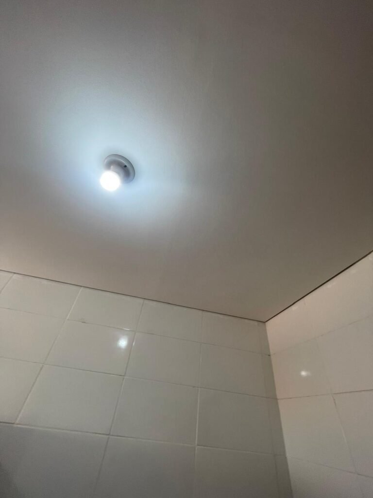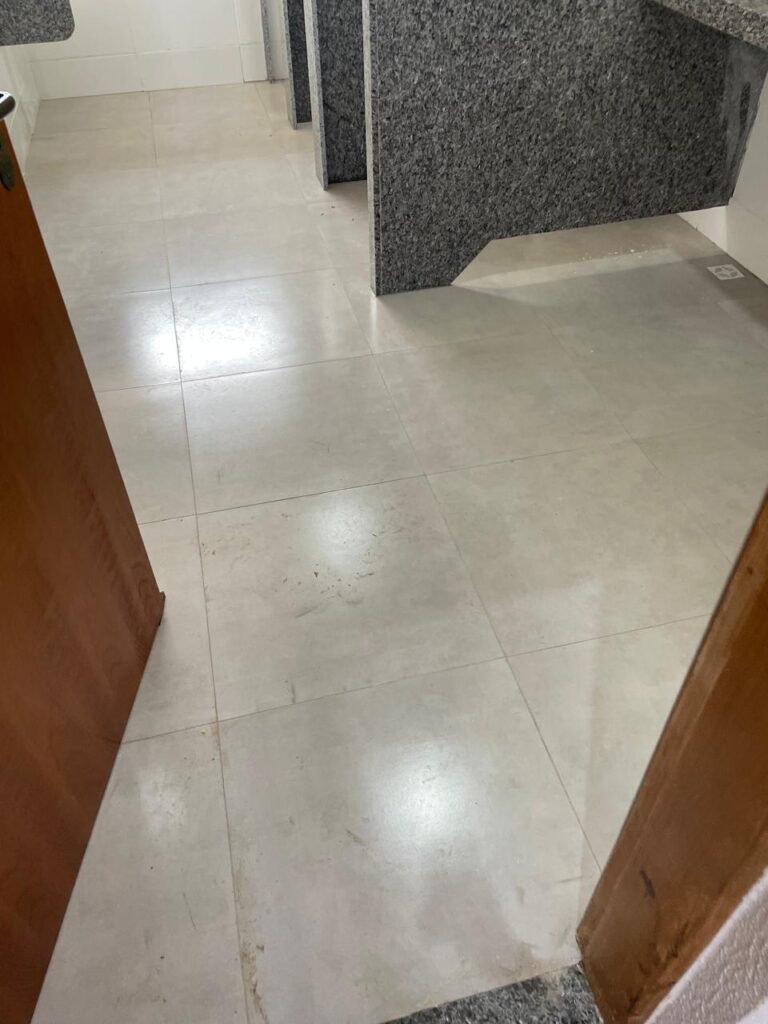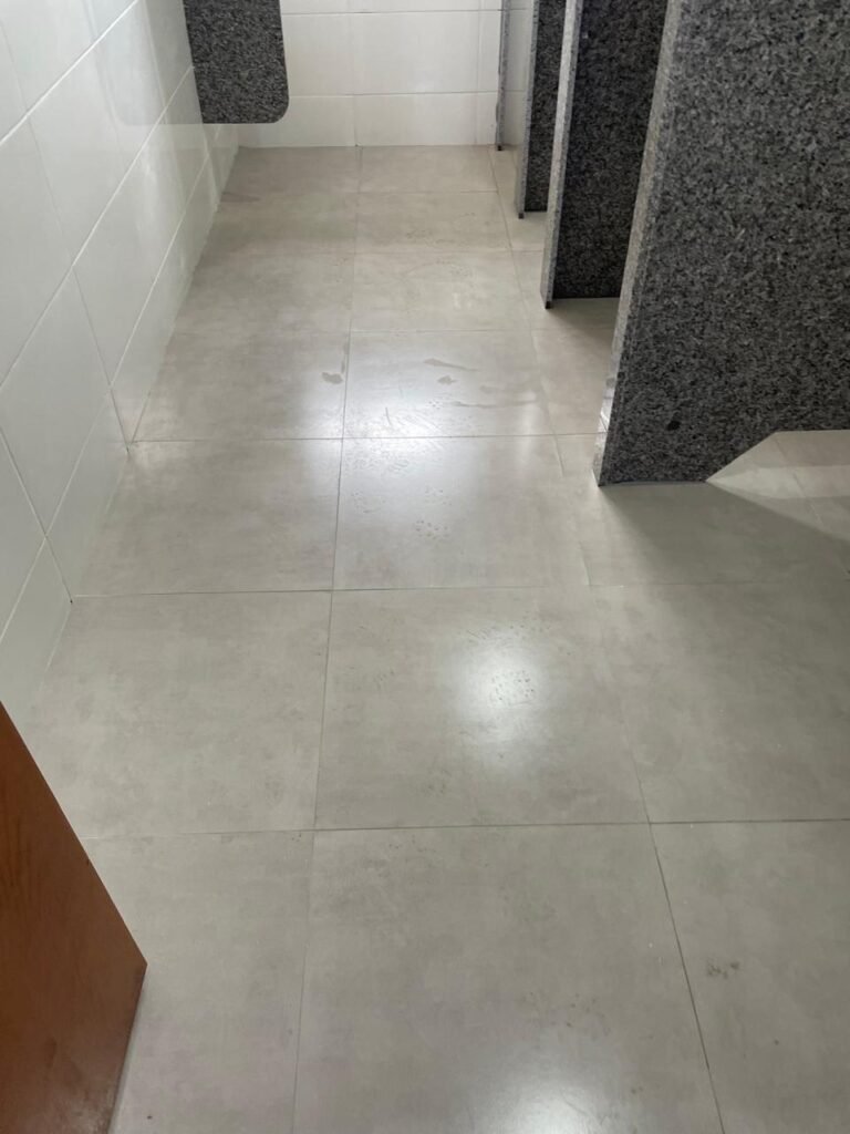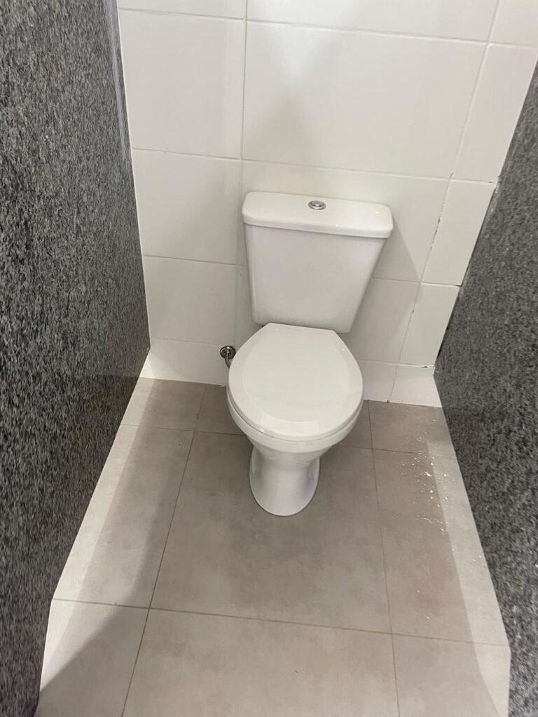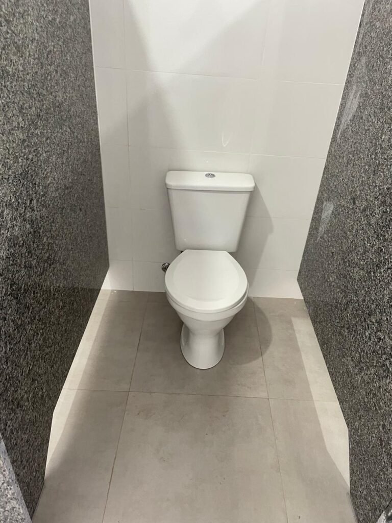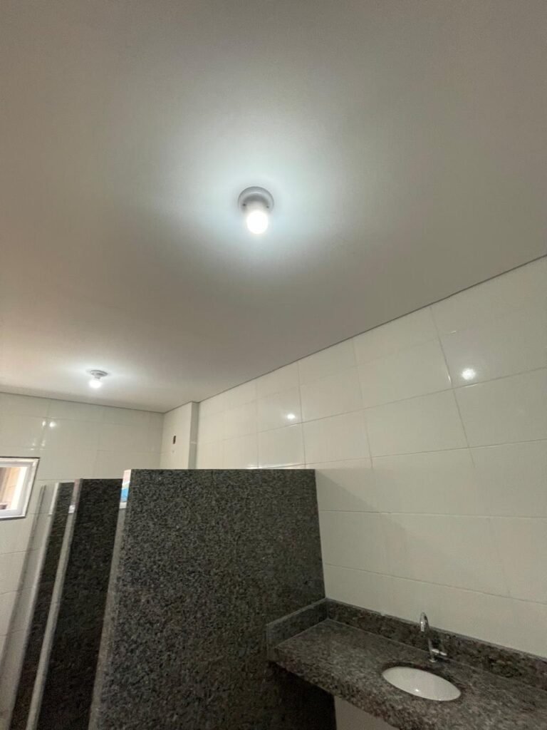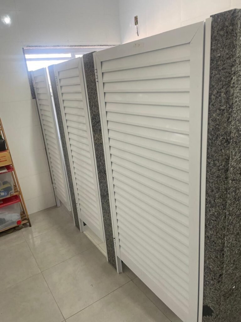 VESTIÁRIO MASCULINO (05) -: 01 porta de madeira envernizada nova e em ordem, com maçaneta nova e em ordem e com chave embutida, pisos revestidos de porcelanato na cor cinza novos e em ordem, paredes revestidas de azulejos na cor branco até o teto, teto com forro de gesso e com pintura na cor branco neve nova e em ordem, 02 luminárias plafon com leds em ordem, 02 ralos de plástico cor branco novos em ordem, 01 bancada de granito cinza ocre nova e em ordem, 02 cubas de cerâmica na cor branco novas em ordem, 02 torneiras em inox novas em ordem, 02 sifões sanfonados novos em ordem, 03 divisórias de granito cinza ocre novas em ordem, com 03 portas venezianas de alumínio na cor branco novas em ordem, com fechaduras em ordem, 02 conjuntos sanitários de cerâmica na cor branco novos em ordem, com acento em ordem, tampa e descarga em ordem, 01 divisória de granito cinza ocre ( mictório ), 01 mictório de cerâmica na cor branco, marca Icasa com descarga em ordem, 01 vitrô basculante com esquadrias na cor branco, com fechadura e com 01 vidro temperado marca Blindex, novos e em ordem, 02 canoplas em inox em ordem, 01 pré-instalação de chuveiro, 01 espelho de luz com 01 interruptor em ordem.