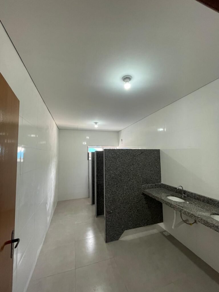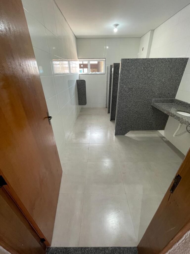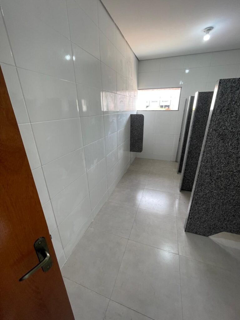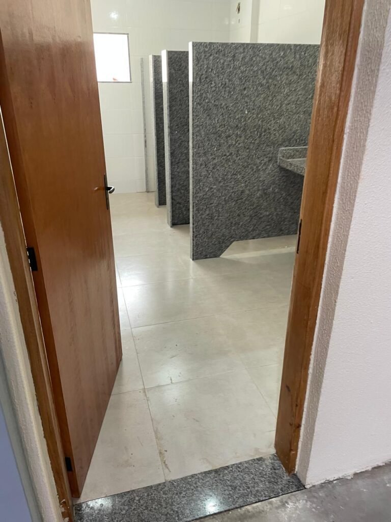 VESTIÁRIO MASCULINO (GALPÃO 06) -: 01 porta de madeira envernizada nova e em ordem, com maçaneta nova e em ordem e com chave embutida, pisos revestidos de porcelanato na cor cinza novos e em ordem, paredes revestidas de azulejos na cor branco até o teto, teto com forro de gesso e com pintura na cor branco neve nova e em ordem, 02 luminárias plafon com leds em ordem, 02 ralos de plástico cor branco novos em ordem, 01 bancada de granito cinza ocre nova e em ordem, 02 cubas de cerâmica na cor branco novas em ordem, 02 torneiras em inox novas em ordem, 02 sifões sanfonados novos em ordem, 03 divisórias de granito cinza ocre novas em ordem, com 03 portas venezianas de alumínio na cor branco novas em ordem, com fechaduras em ordem, 02 conjuntos sanitários de cerâmica na cor branco novos em ordem, com acento em ordem, tampa e descarga em ordem, 01 divisória de granito cinza ocre ( mictório ), 01 mictório de cerâmica na cor branco, marca Icasa com descarga em ordem, 01 vitrô basculante com esquadrias na cor branco, com fechadura e com 01 vidro temperado marca Blindex, novos e em ordem, 02 canoplas em inox em ordem, 01 pré-instalação de chuveiro, 01 espelho de luz com 01 interruptor em ordem.