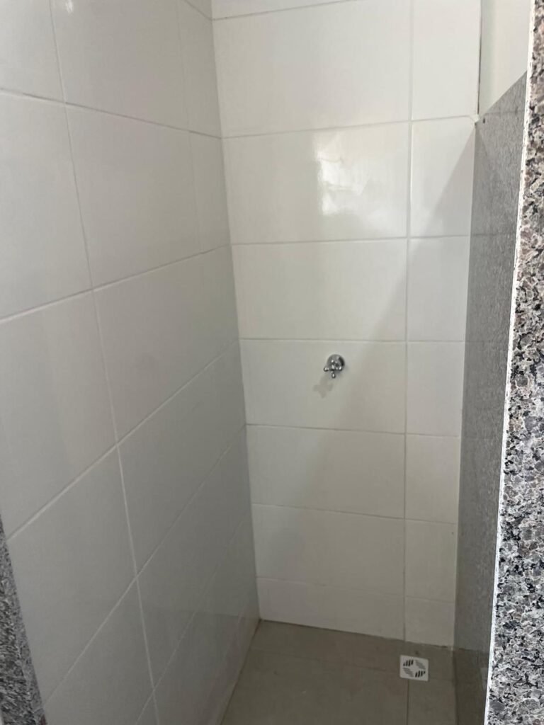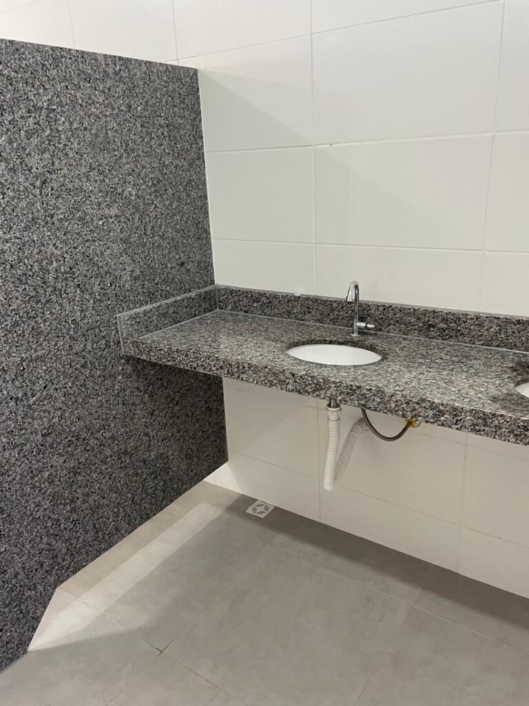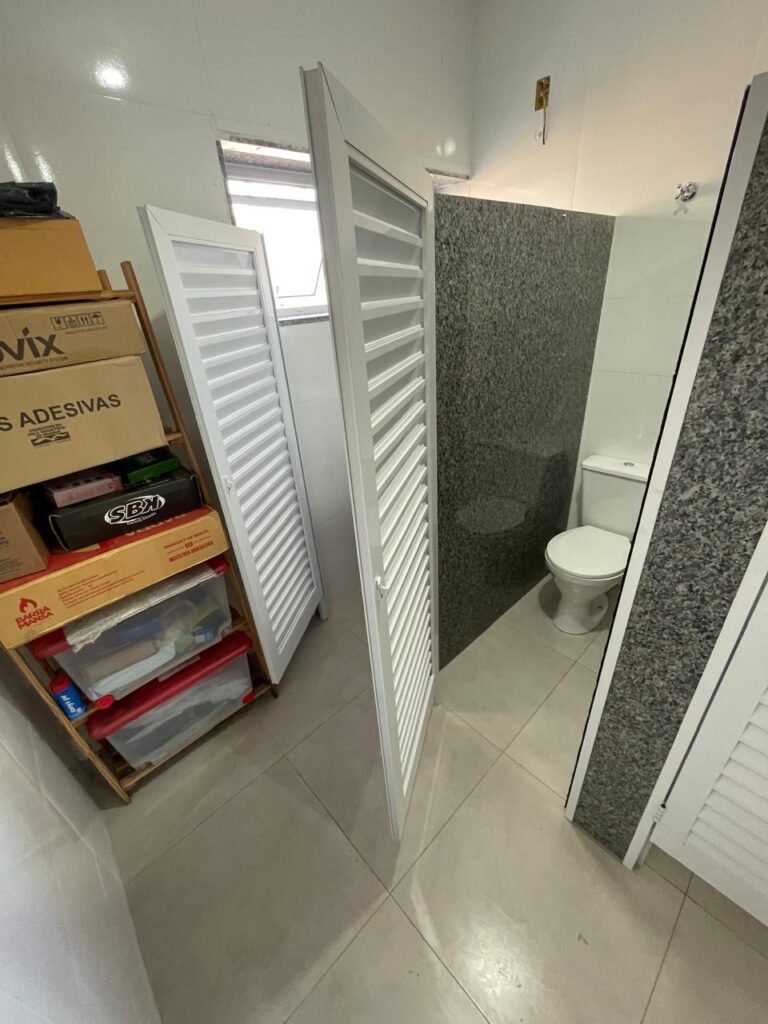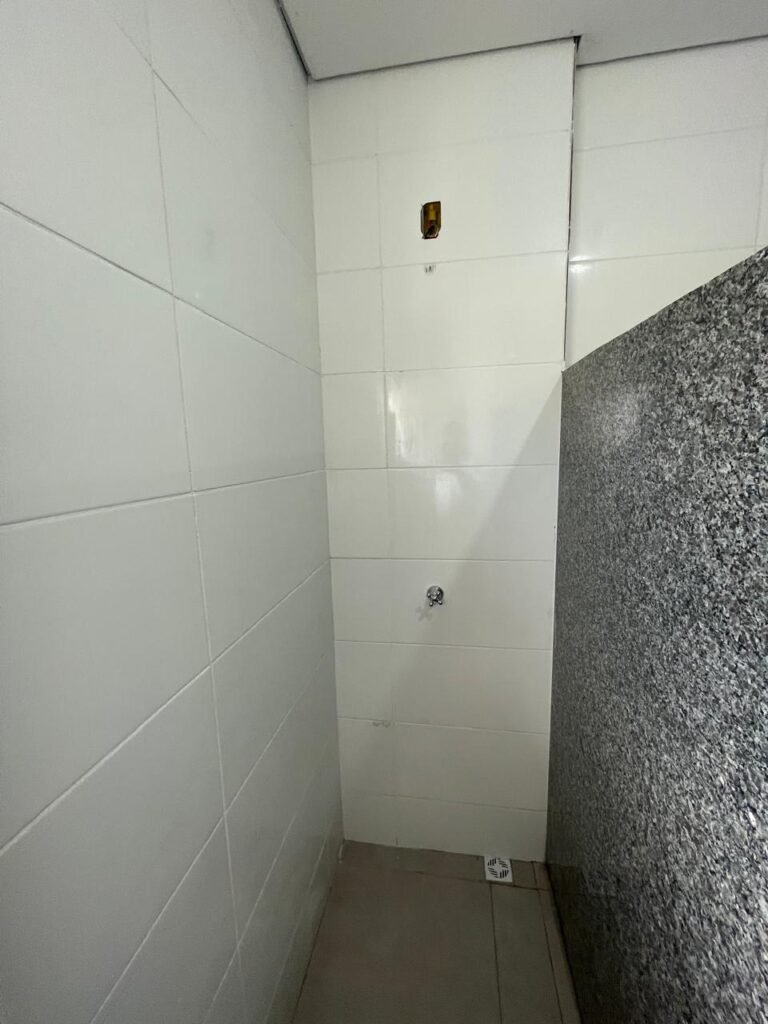 VESTIÁRIO MASCULINO (GALPÃO 06) -: 01 porta de madeira envernizada nova e em ordem, com maçaneta nova e em ordem e com chave embutida, pisos revestidos de porcelanato na cor cinza novos e em ordem, paredes revestidas de azulejos na cor branco até o teto, teto com forro de gesso e com pintura na cor branco neve nova e em ordem, 02 luminárias plafon com leds em ordem, 02 ralos de plástico cor branco novos em ordem, 01 bancada de granito cinza ocre nova e em ordem, 02 cubas de cerâmica na cor branco novas em ordem, 02 torneiras em inox novas em ordem, 02 sifões sanfonados novos em ordem, 03 divisórias de granito cinza ocre novas em ordem, com 03 portas venezianas de alumínio na cor branco novas em ordem, com fechaduras em ordem, 02 conjuntos sanitários de cerâmica na cor branco novos em ordem, com acento em ordem, tampa e descarga em ordem, 01 divisória de granito cinza ocre ( mictório ), 01 mictório de cerâmica na cor branco, marca Icasa com descarga em ordem, 01 vitrô basculante com esquadrias na cor branco, com fechadura e com 01 vidro temperado marca Blindex, novos e em ordem, 02 canoplas em inox em ordem, 01 pré-instalação de chuveiro, 01 espelho de luz com 01 interruptor em ordem.