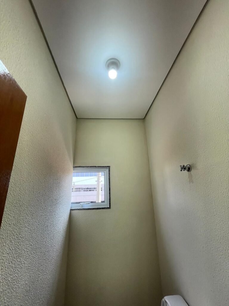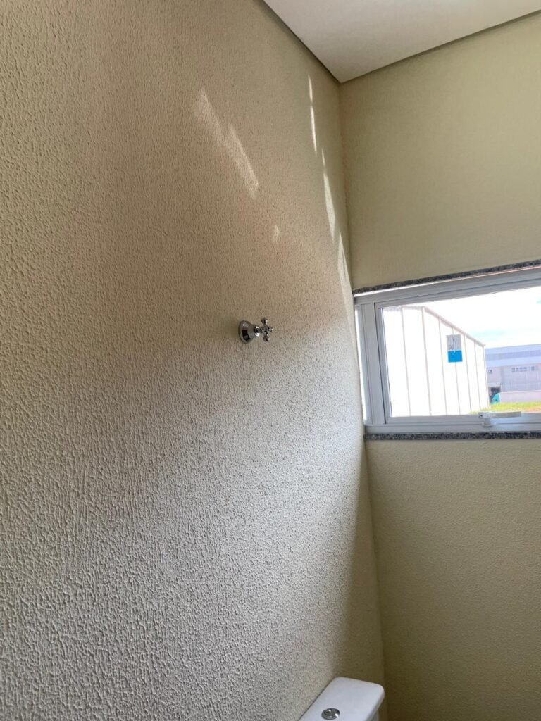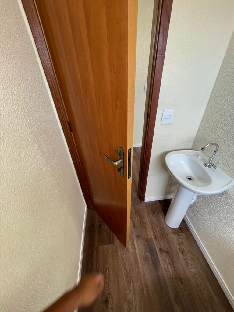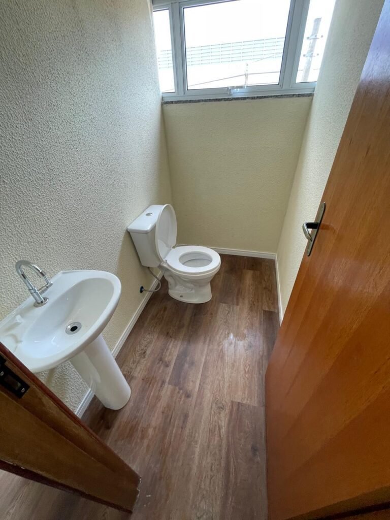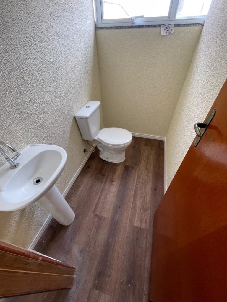 W.C 02 (05) -: 01 porta de madeira envernizada nova em ordem, com maçanetas em ordem e chave embutida, piso revestido de laminado novo e em ordem, rodapés revestidos de poliestireno na cor branco em ordem, paredes com grafiato na cor palha nova em ordem, 01 pia com coluna de cerâmica na cor branco em ordem, 01 torneira em inox nova e em ordem, 01 conjunto sanitário marca Icasa, novo e em ordem, 01 interruptor em ordem, 01 vitrô basculante em ordem, com 01 vidro temperado marca Blindex novo em ordem, com 01 fechadura em ordem, 01 luminária plafon com led em ordem, 01 canopla em inox de registro em ordem.