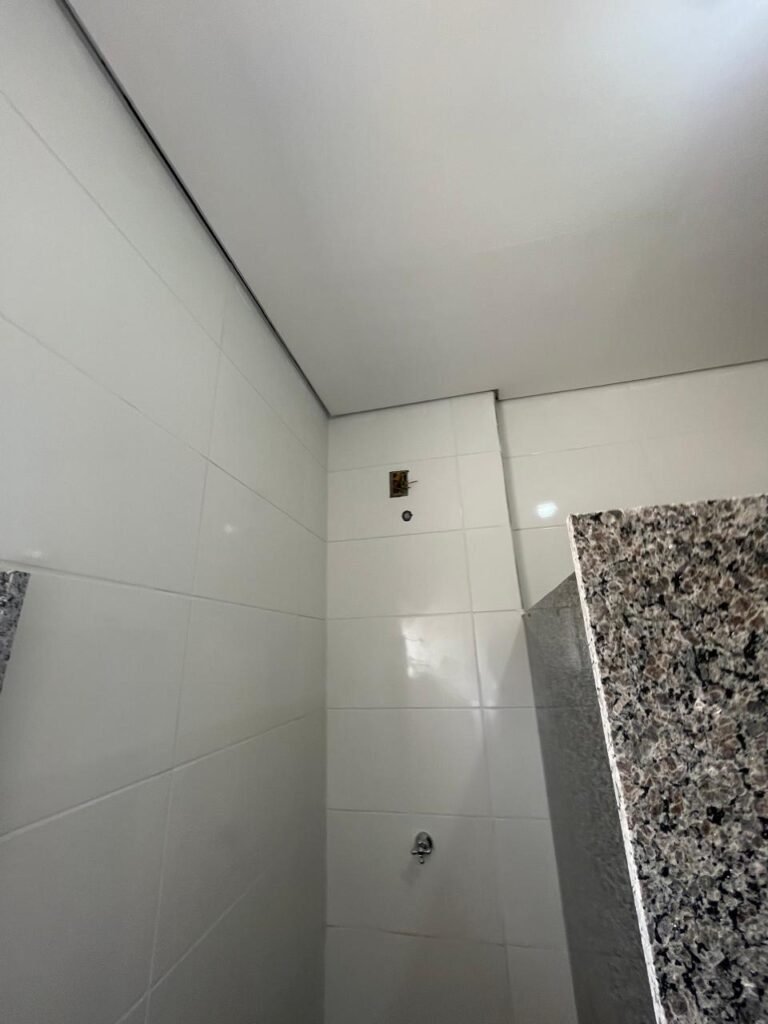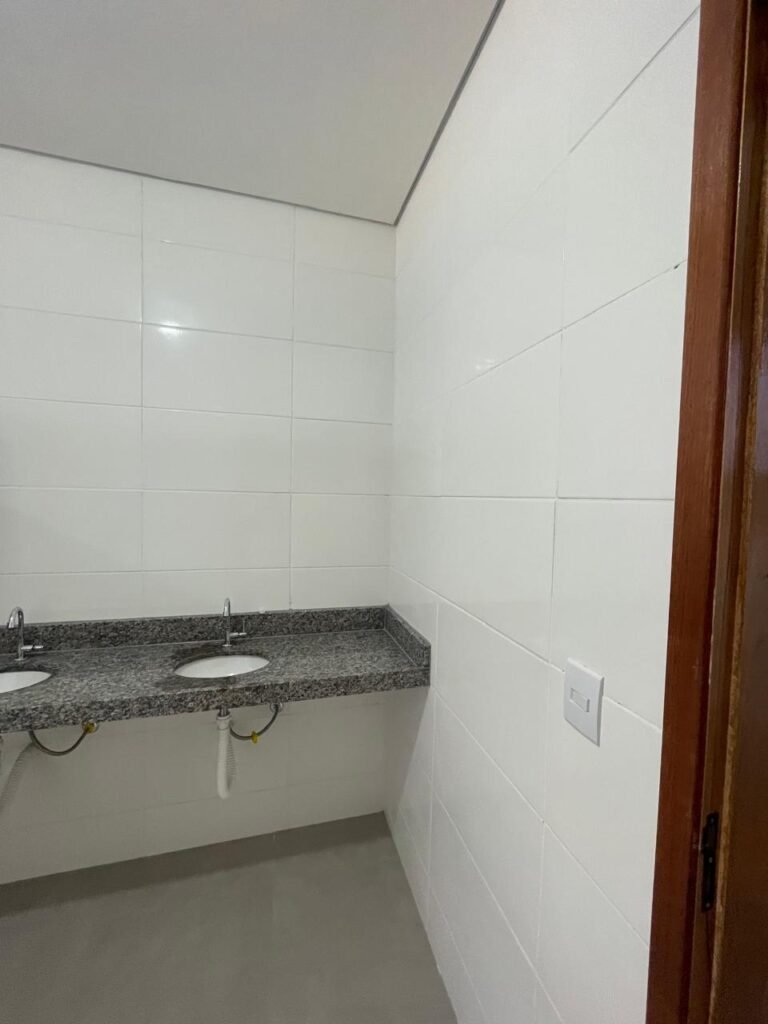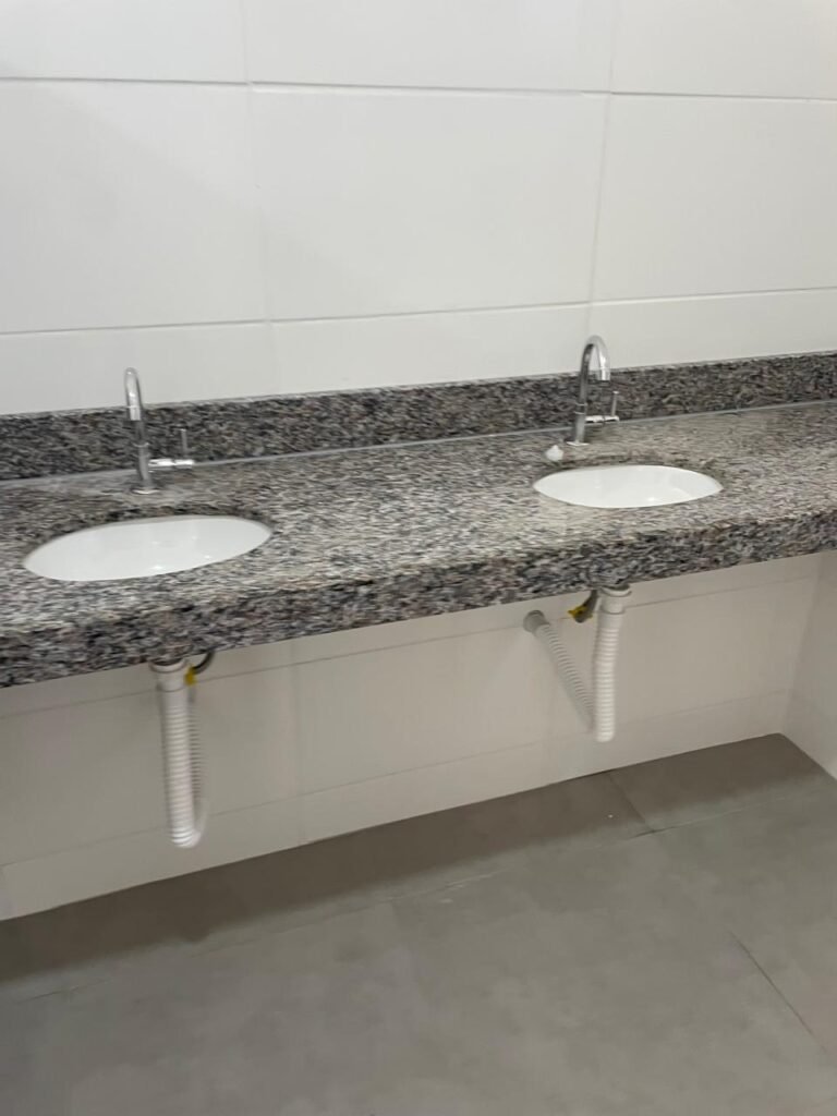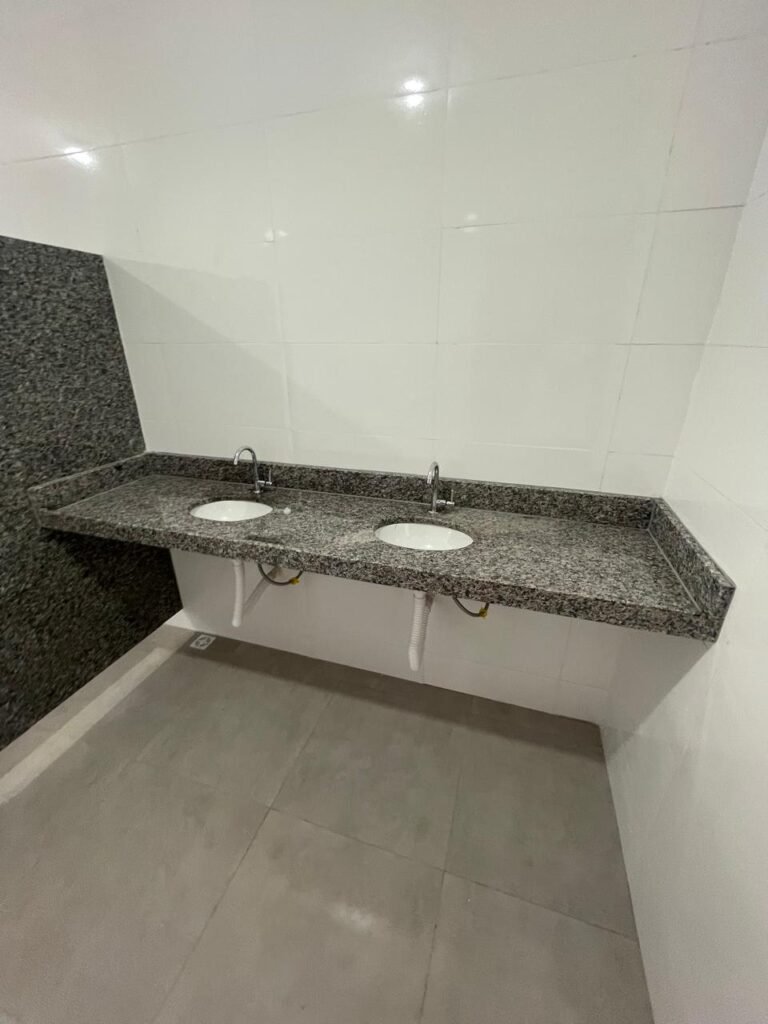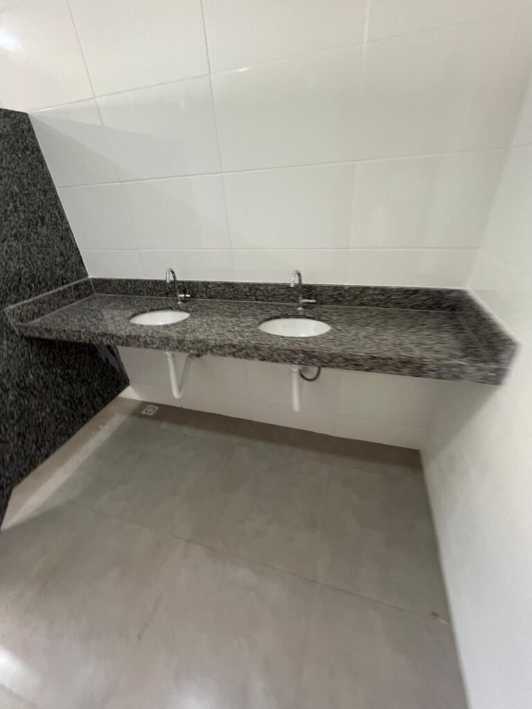 VESTIÁRIO FEMININO (05) -: 01 porta de madeira envernizada nova e em ordem, com maçaneta nova e em ordem e com chave embutida, pisos revestidos de porcelanato na cor cinza novos e em ordem, paredes revestidas de azulejos na cor branco até o teto, teto com forro de gesso e com pintura na cor branco neve nova e em ordem, 01 entrada para alçapão em ordem, 02 luminárias plafon com leds em ordem, 02 ralos de plástico cor branco novos em ordem, 01 bancada de granito cinza ocre nova e em ordem, 02 cubas de cerâmica na cor branco novas em ordem, 02 torneiras em inox novas em ordem, 02 sifões sanfonados novos em ordem, 03 divisórias de granito cinza ocre novas em ordem, com 03 portas venezianas de alumínio na cor branco novas em ordem, com fechaduras em ordem, 02 conjuntos sanitários de cerâmica na cor branco novos em ordem, com acento em ordem, tampa e descarga em ordem, 01 vitrô basculante com esquadrias na cor branco, com fechadura e com 01 vidro temperado marca Blindex, novos e em ordem, 02 canoplas em inox em ordem, 01 pré-instalação de chuveiro, 01 espelho de luz com 01 interruptor em ordem.
