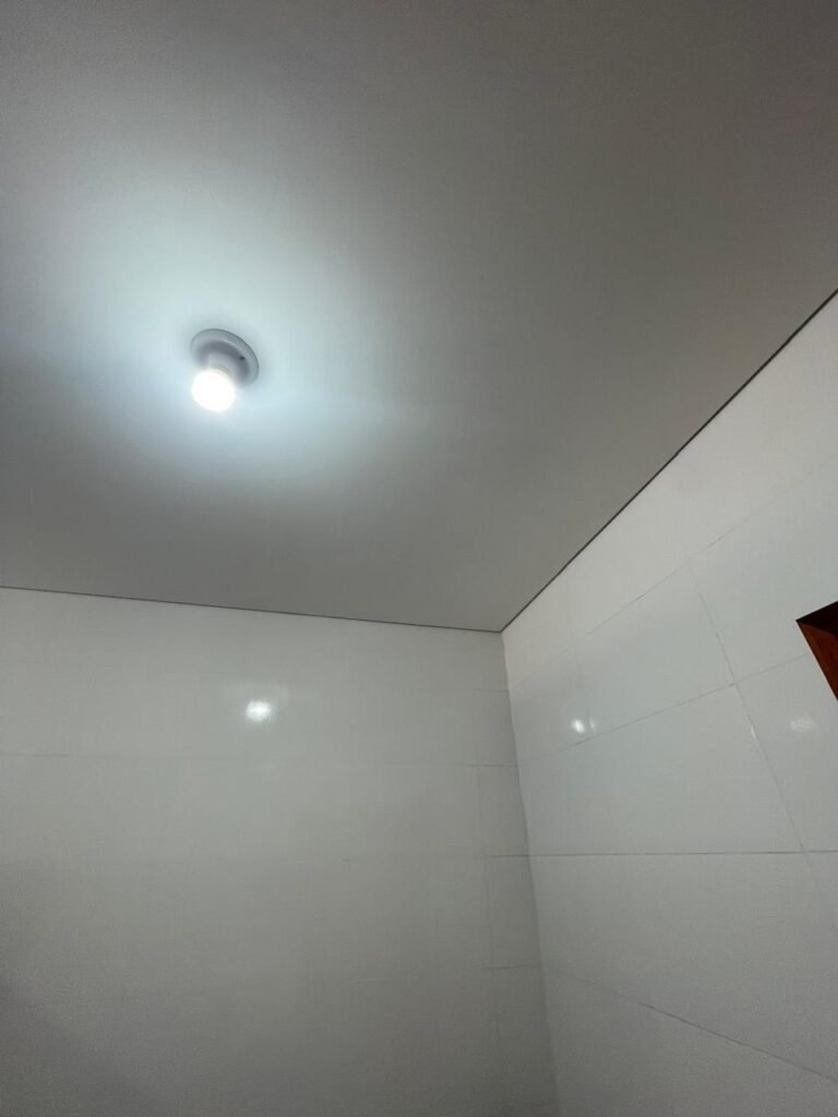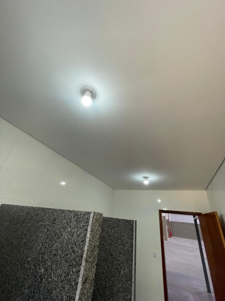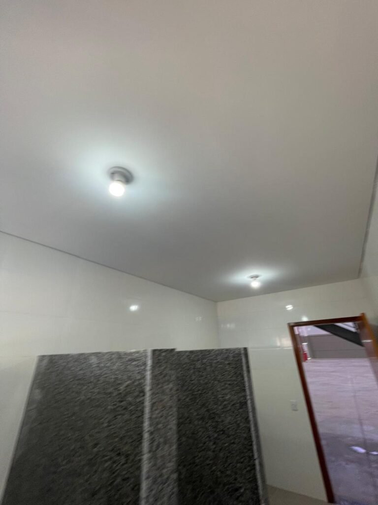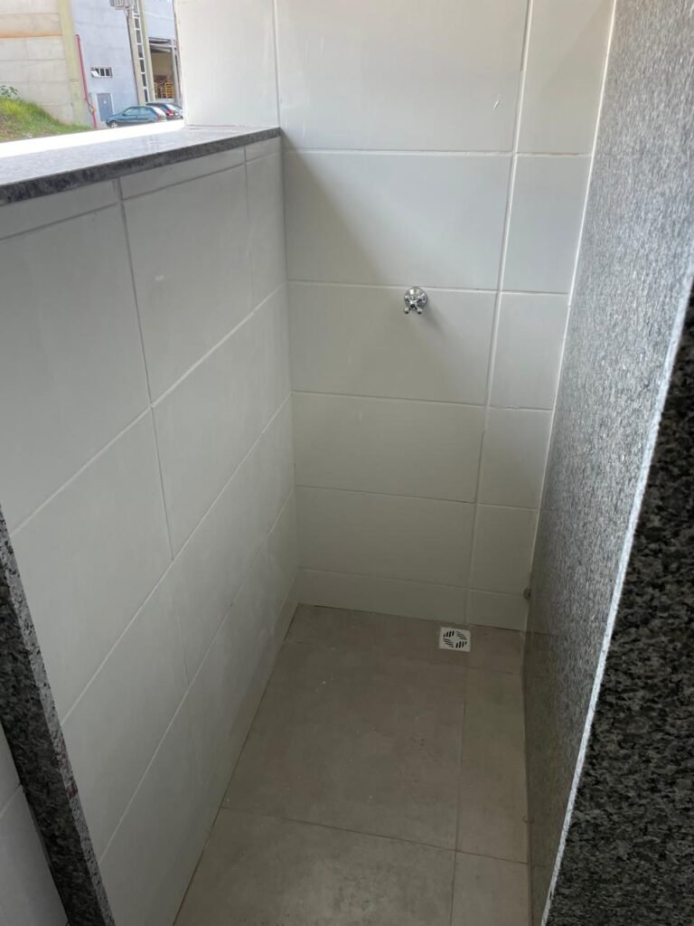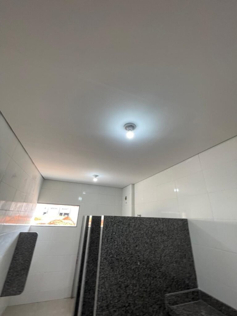 VESTIÁRIO FEMININO (05) -: 01 porta de madeira envernizada nova e em ordem, com maçaneta nova e em ordem e com chave embutida, pisos revestidos de porcelanato na cor cinza novos e em ordem, paredes revestidas de azulejos na cor branco até o teto, teto com forro de gesso e com pintura na cor branco neve nova e em ordem, 01 entrada para alçapão em ordem, 02 luminárias plafon com leds em ordem, 02 ralos de plástico cor branco novos em ordem, 01 bancada de granito cinza ocre nova e em ordem, 02 cubas de cerâmica na cor branco novas em ordem, 02 torneiras em inox novas em ordem, 02 sifões sanfonados novos em ordem, 03 divisórias de granito cinza ocre novas em ordem, com 03 portas venezianas de alumínio na cor branco novas em ordem, com fechaduras em ordem, 02 conjuntos sanitários de cerâmica na cor branco novos em ordem, com acento em ordem, tampa e descarga em ordem, 01 vitrô basculante com esquadrias na cor branco, com fechadura e com 01 vidro temperado marca Blindex, novos e em ordem, 02 canoplas em inox em ordem, 01 pré-instalação de chuveiro, 01 espelho de luz com 01 interruptor em ordem.