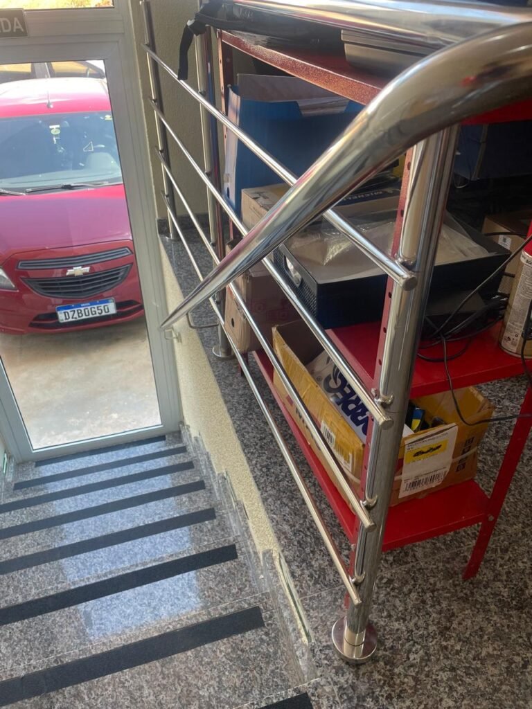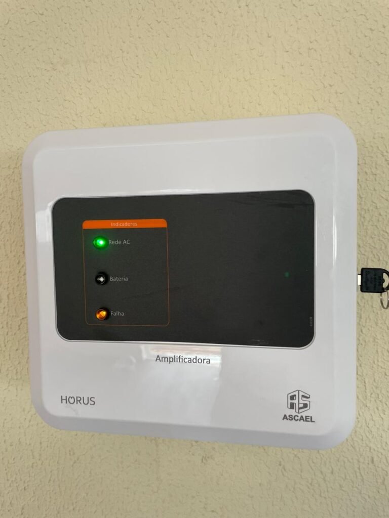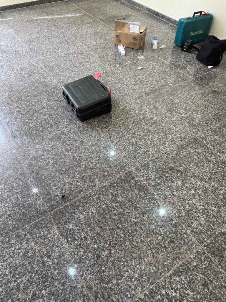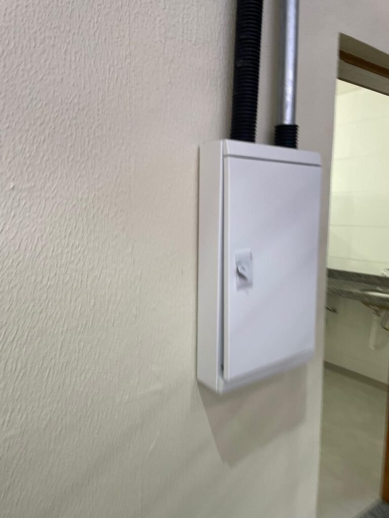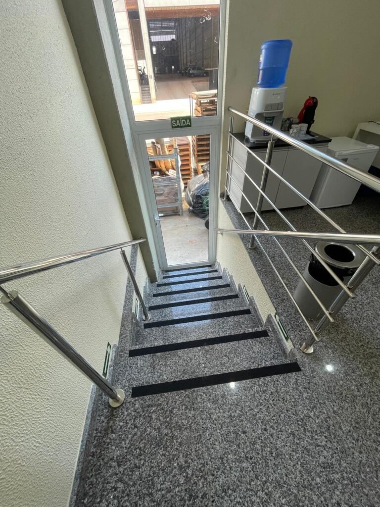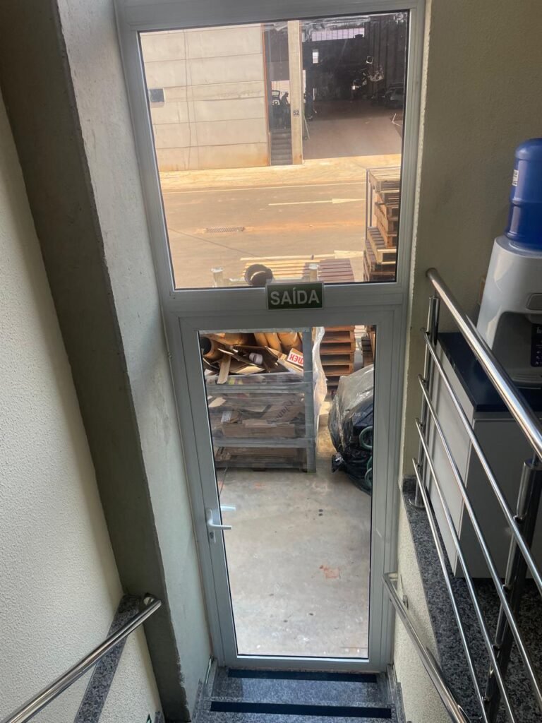 RECEPÇÃO (05)-: 01 porta de madeira envernizada nova e em ordem, com maçaneta nova e em ordem e com chaves, piso e rodapés revestidos de granito novo e em ordem na cor cinza ocre, paredes com grafiato e pintura na cor amarela nova e em ordem, 07 espelhos de luz sendo eles, 01 espelho com 01 interruptor, 03 espelhos com 02 tomadas e 03 espelhos cegos, todos em ordem, 01 caixa de distribuição de disjuntores com tampa e fechadura Marca Brum em ordem, disjuntores sendo eles, 01 marca Elitek ED10 C 80A 415v, 15 marca Elitek ED6 C20 240/415v, 05 marca Elitek ED6 C16 240/415v e 07 marca Elitek ED6 C32 415V em ordem. 4 luminárias plafon com led em ordem, 01 sensor de presença em ordem, guarda corpo em ordem de inox, 01 porta social com esquadrias de alumínio na cor branco, com 01 vidro temperado marca Blindex em ordem, com maçanetas novas em ordem, 02 vidros temperados fixos, marca Blindex novos e em ordem.