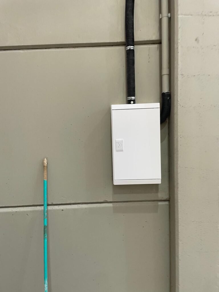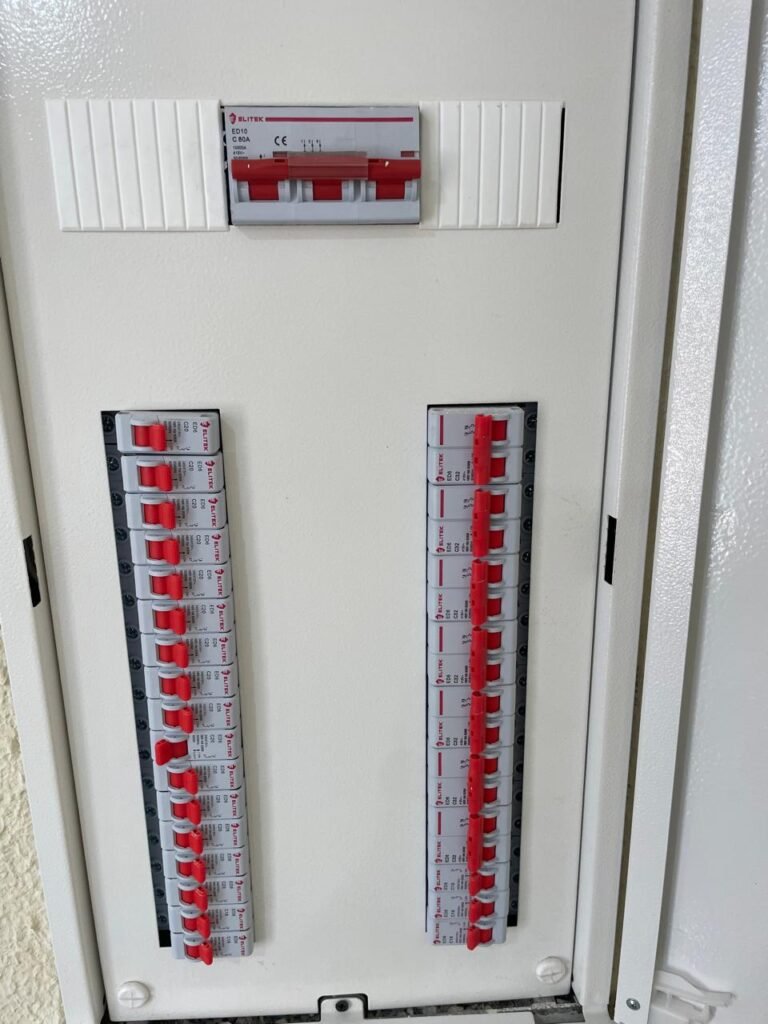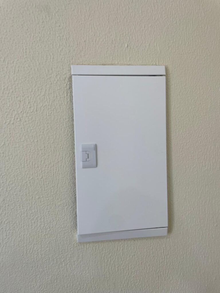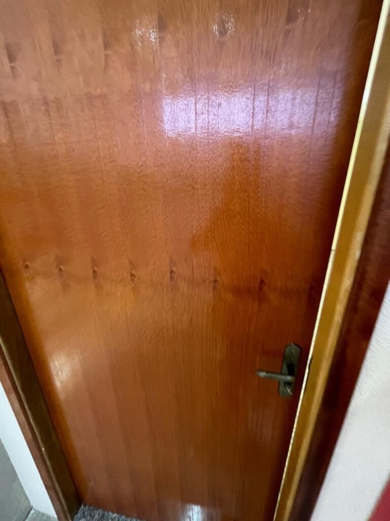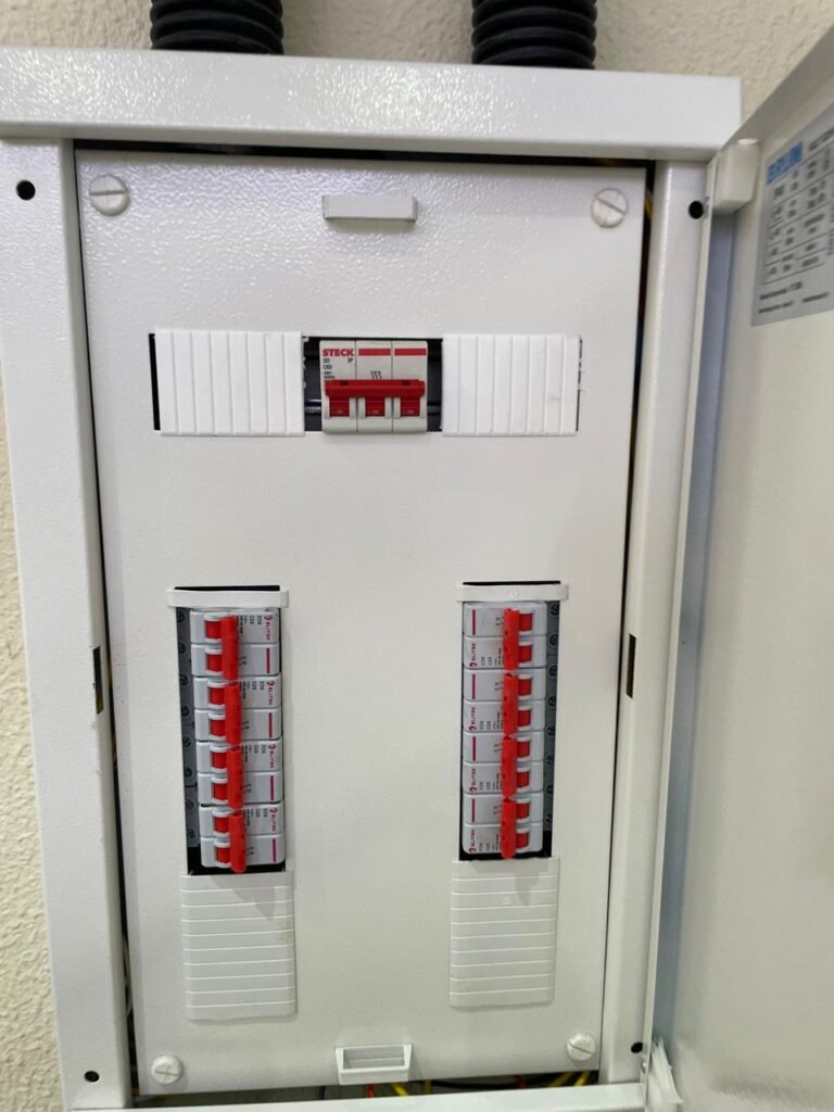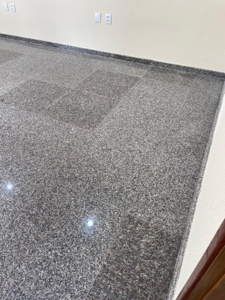 RECEPÇÃO (05)-: 01 porta de madeira envernizada nova e em ordem, com maçaneta nova e em ordem e com chaves, piso e rodapés revestidos de granito novo e em ordem na cor cinza ocre, paredes com grafiato e pintura na cor amarela nova e em ordem, 07 espelhos de luz sendo eles, 01 espelho com 01 interruptor, 03 espelhos com 02 tomadas e 03 espelhos cegos, todos em ordem, 01 caixa de distribuição de disjuntores com tampa e fechadura Marca Brum em ordem, disjuntores sendo eles, 01 marca Elitek ED10 C 80A 415v, 15 marca Elitek ED6 C20 240/415v, 05 marca Elitek ED6 C16 240/415v e 07 marca Elitek ED6 C32 415V em ordem. 4 luminárias plafon com led em ordem, 01 sensor de presença em ordem, guarda corpo em ordem de inox, 01 porta social com esquadrias de alumínio na cor branco, com 01 vidro temperado marca Blindex em ordem, com maçanetas novas em ordem, 02 vidros temperados fixos, marca Blindex novos e em ordem.