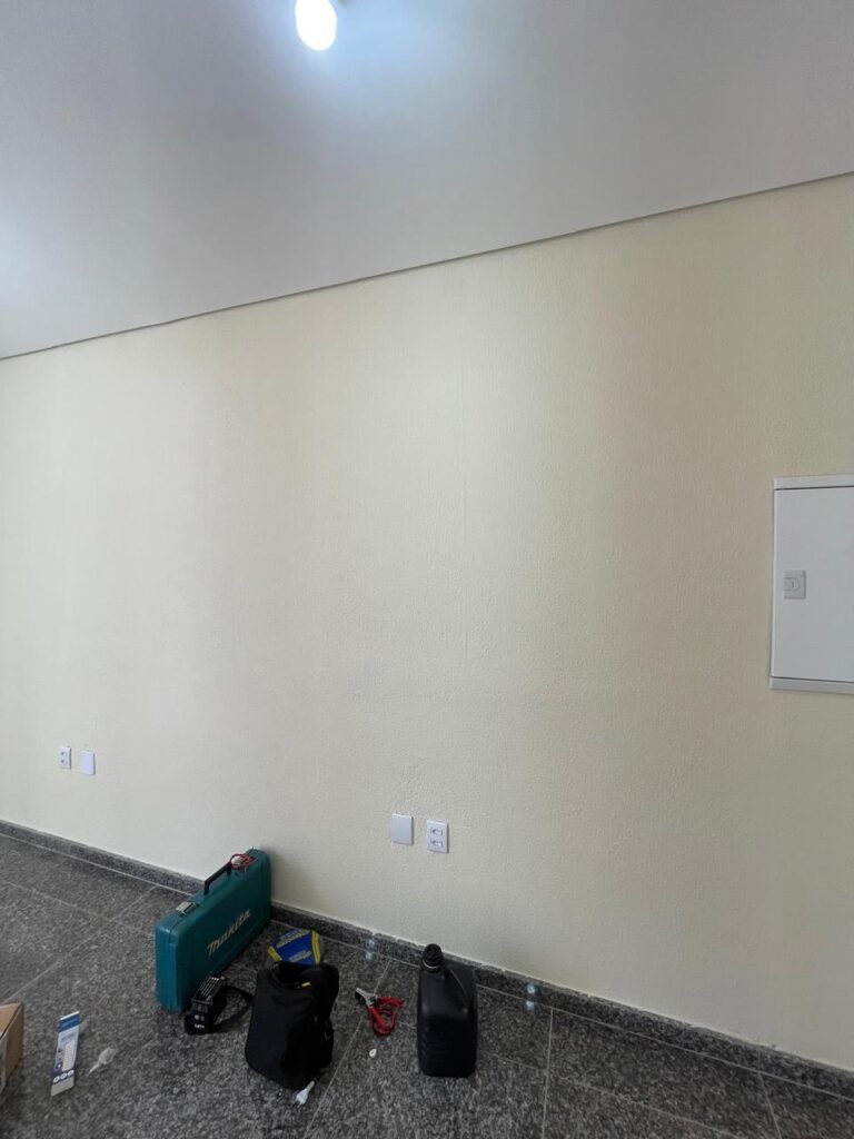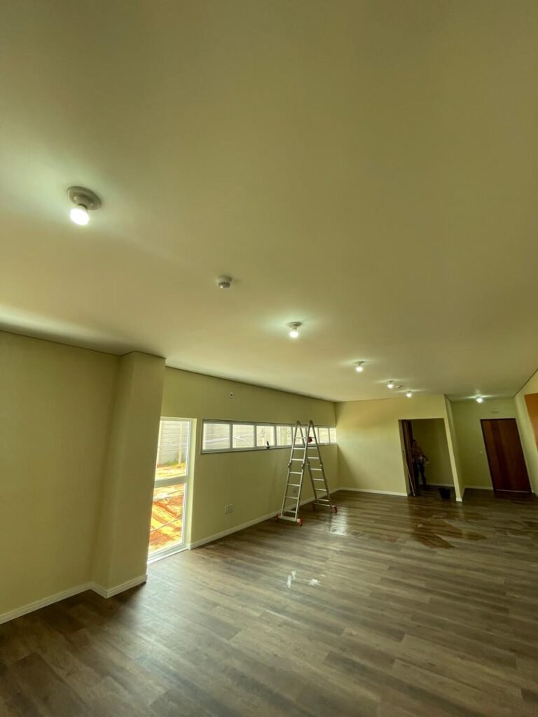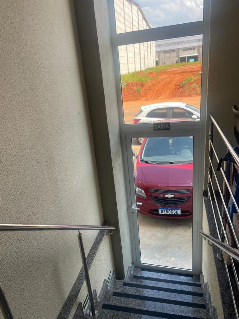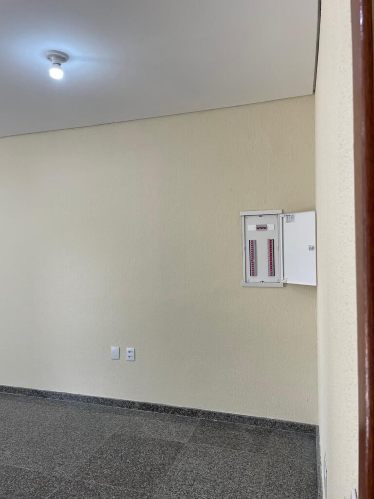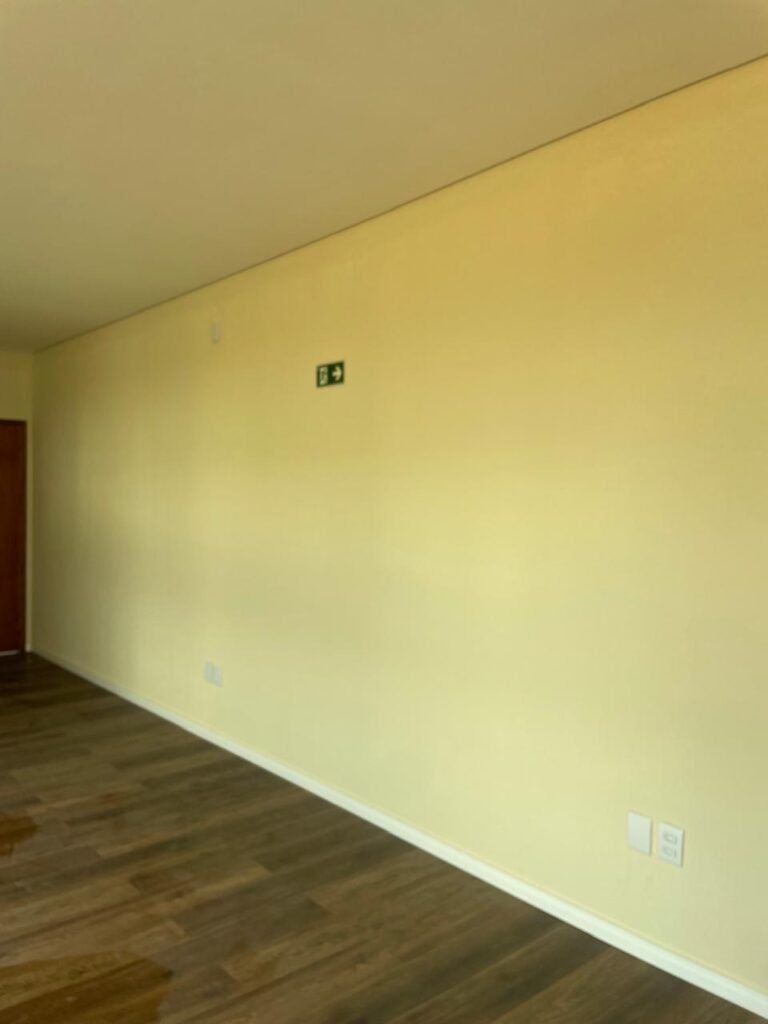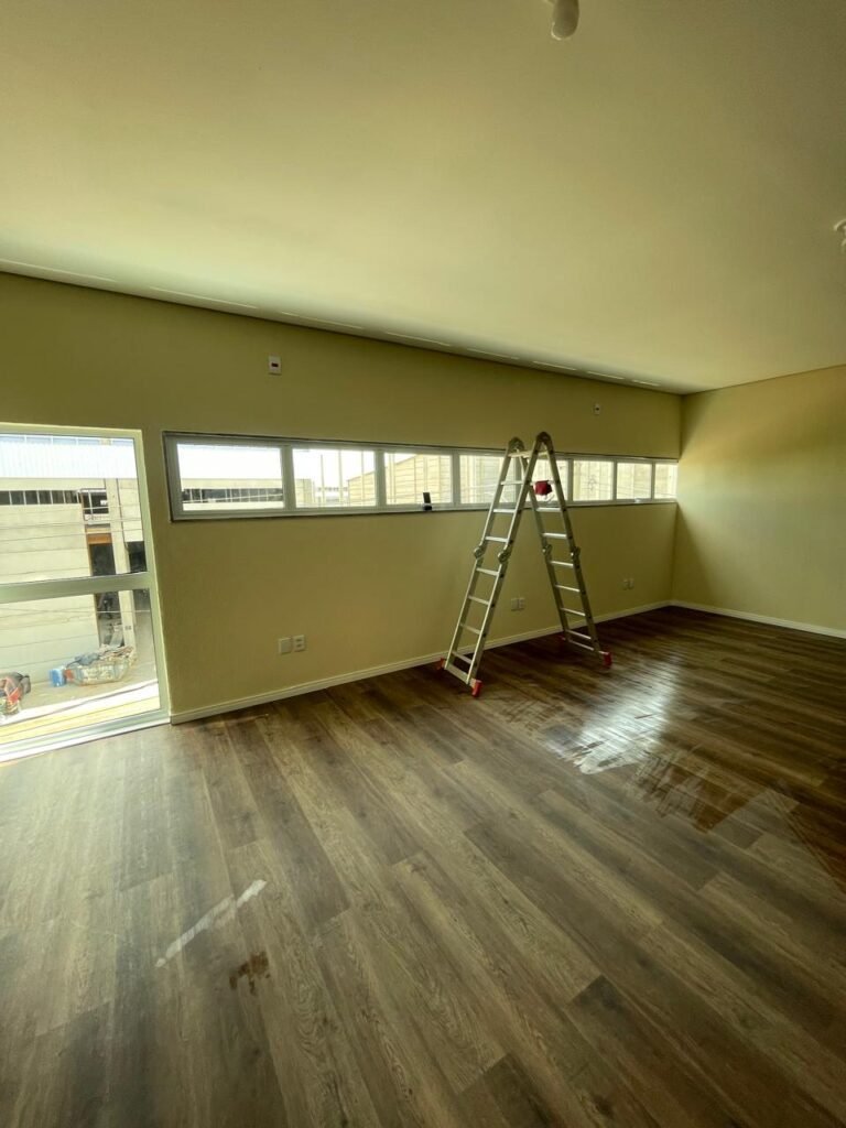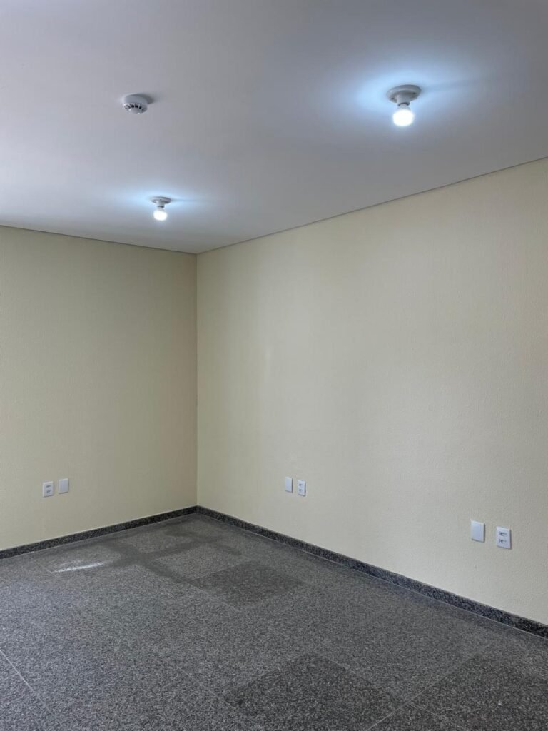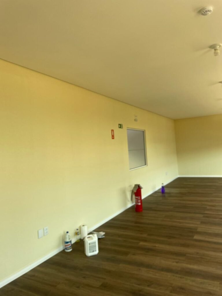 ESCRITÓRIO (05) -: Piso revestido de laminado novo e em ordem, rodapés revestidos de poliestireno na cor branco em ordem, paredes com grafiato e com pintura na cor palha nova em ordem, 36 espelhos de luz sendo eles, 03 espelhos com 01 interruptor, 04 espelhos com 01 tomada, 12 espelhos com 02 tomadas, 12 espelhos cegos, 05 tomadas 220, 01 vidro temperado fixo, marca Blindex, com esquadrias na cor branco em ordem, 07 vitrôs basculantes com 01 vidro temperado marca Blindex cada, com fechadura em ordem, 09 vidros temperados fixos, marca Blindex em ordem, 04 luminárias plafon com led em ordem, 01 central do alarme de incêndio em ordem, 01 porta fixa com 02 vidros temperados marca Blindex em ordem, 02 entradas para alçapão, teto com forro de gesso com pintura nova na cor branco.