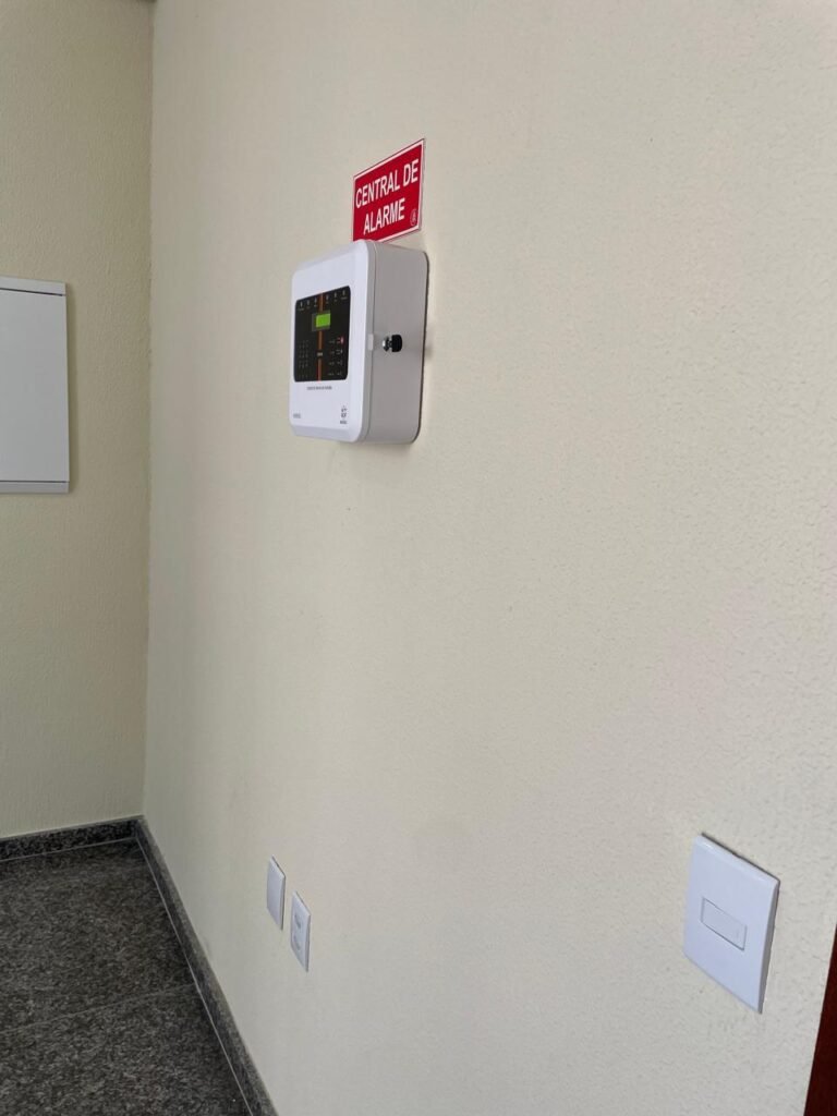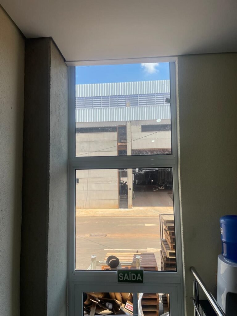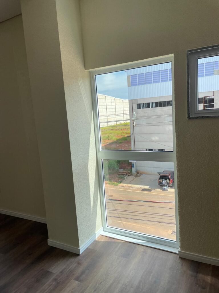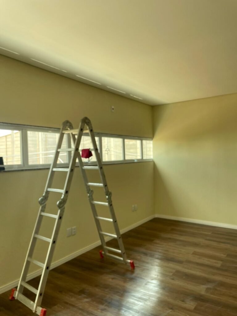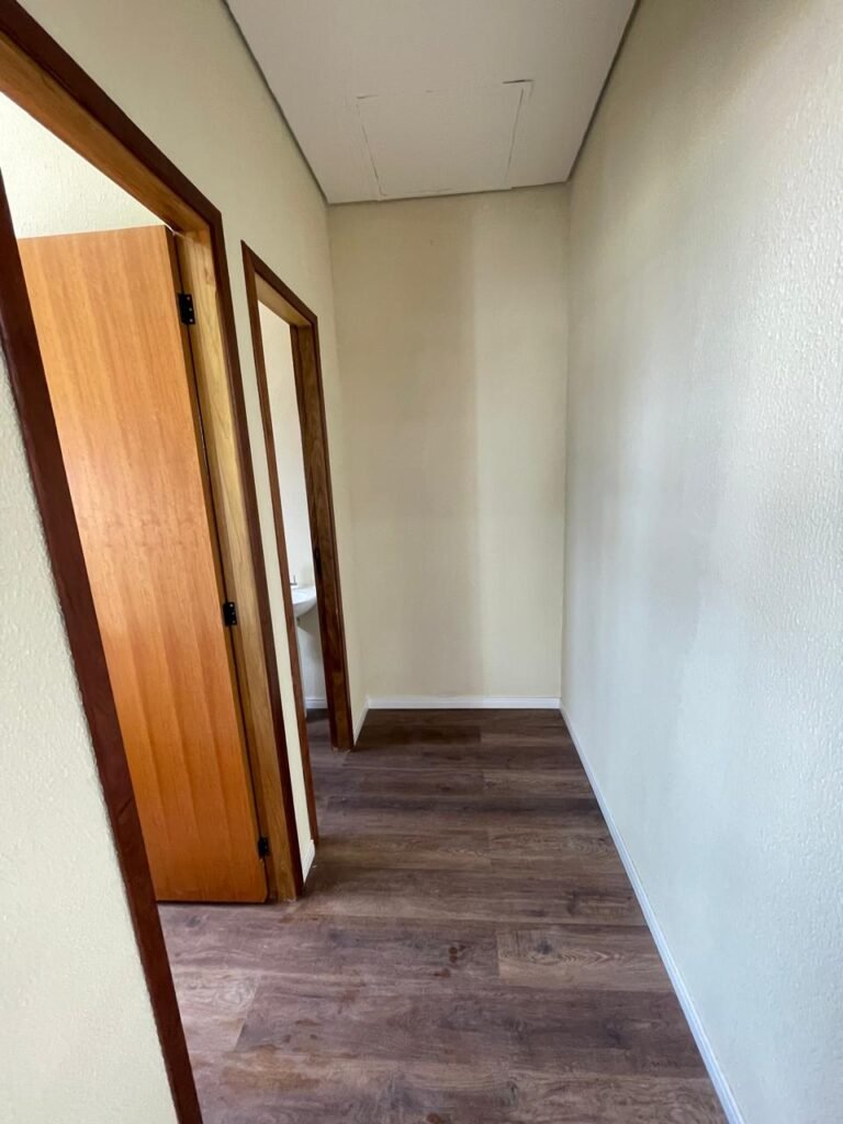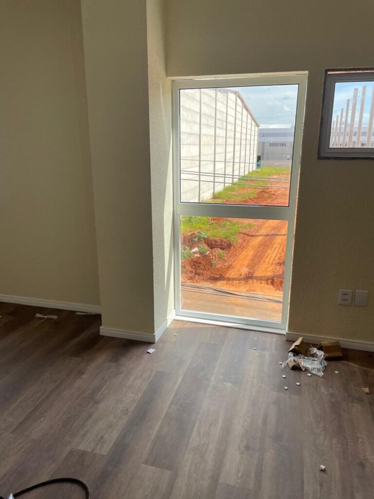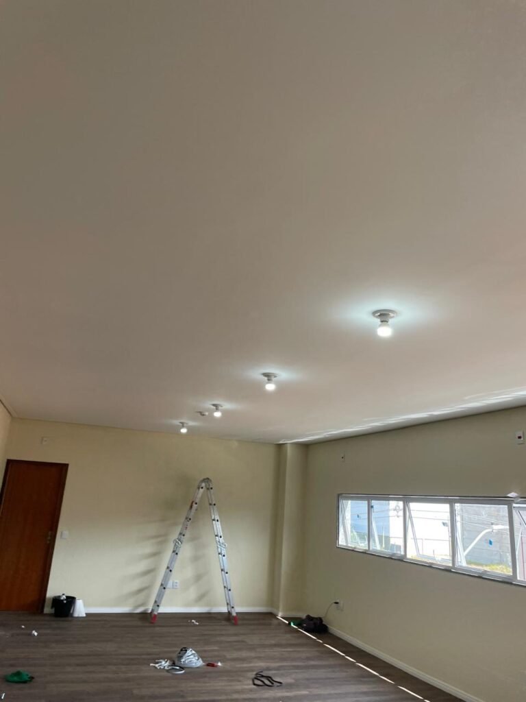 ESCRITÓRIO (05) -: Piso revestido de laminado novo e em ordem, rodapés revestidos de poliestireno na cor branco em ordem, paredes com grafiato e com pintura na cor palha nova em ordem, 36 espelhos de luz sendo eles, 03 espelhos com 01 interruptor, 04 espelhos com 01 tomada, 12 espelhos com 02 tomadas, 12 espelhos cegos, 05 tomadas 220, 01 vidro temperado fixo, marca Blindex, com esquadrias na cor branco em ordem, 07 vitrôs basculantes com 01 vidro temperado marca Blindex cada, com fechadura em ordem, 09 vidros temperados fixos, marca Blindex em ordem, 04 luminárias plafon com led em ordem, 01 central do alarme de incêndio em ordem, 01 porta fixa com 02 vidros temperados marca Blindex em ordem, 02 entradas para alçapão, teto com forro de gesso com pintura nova na cor branco.