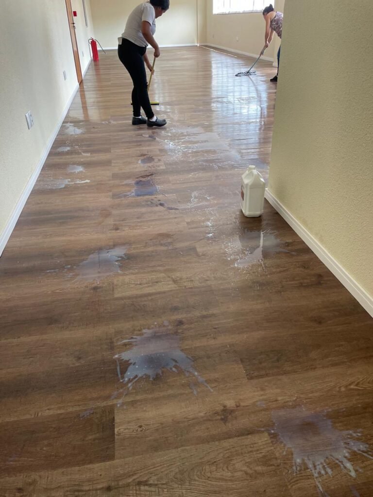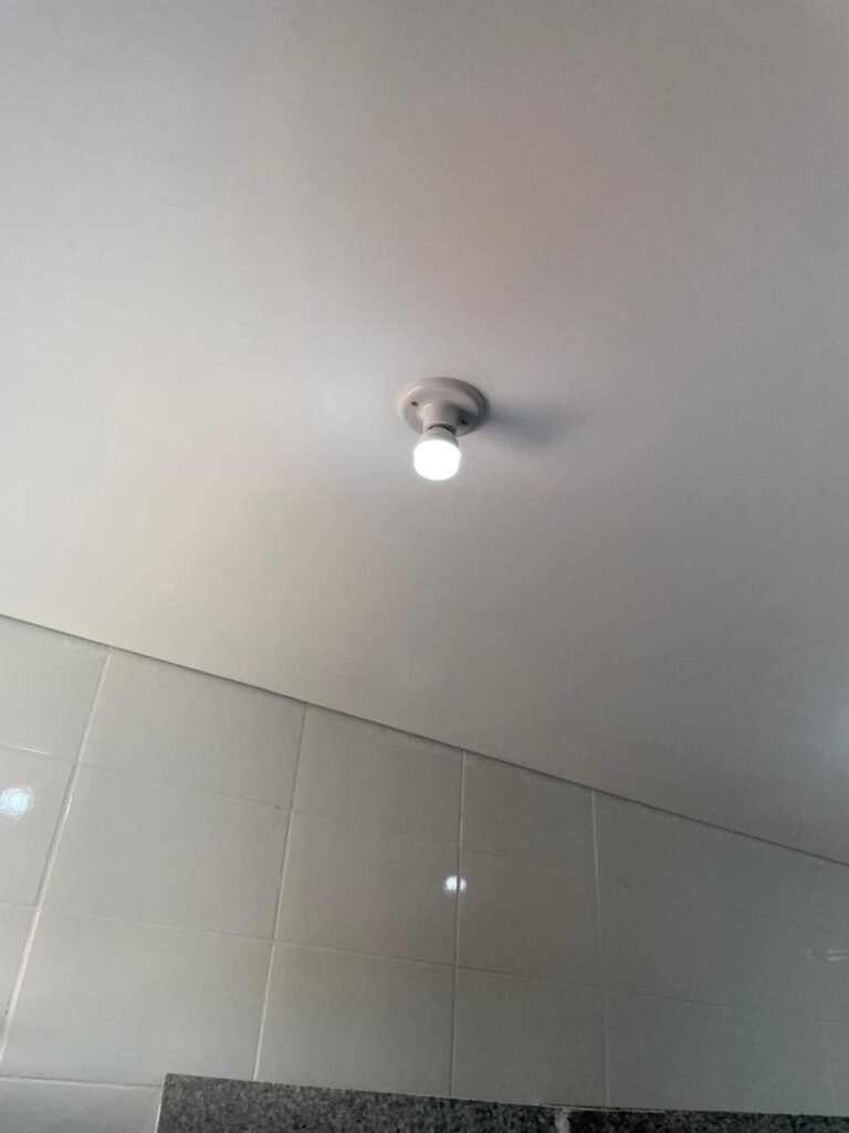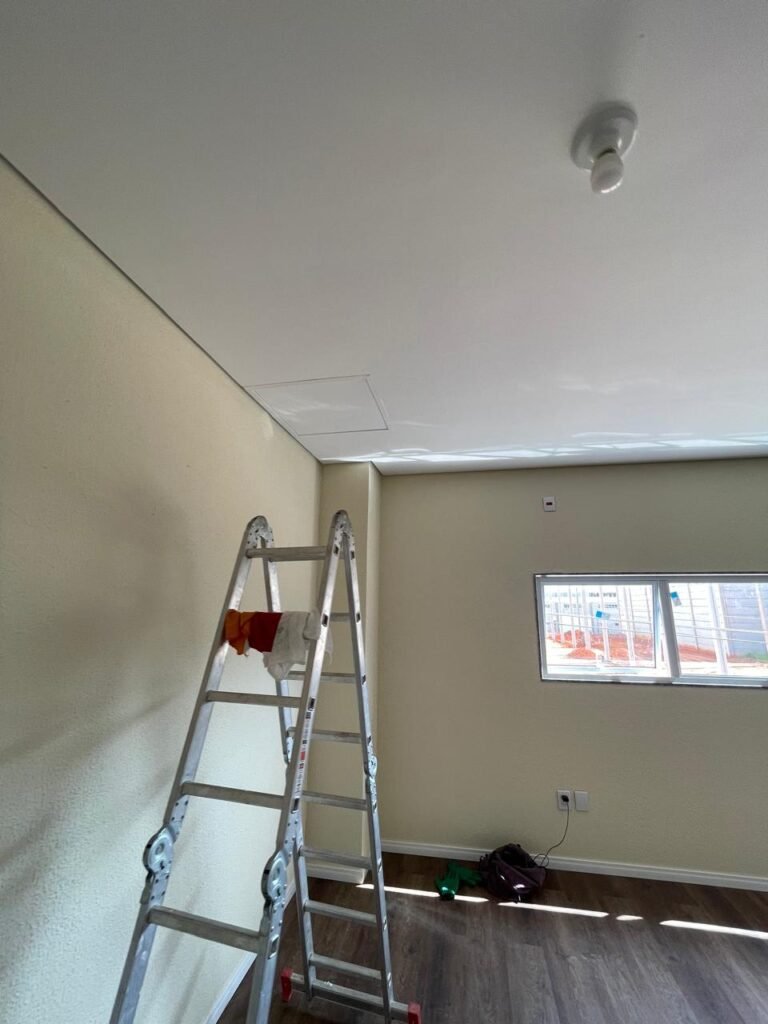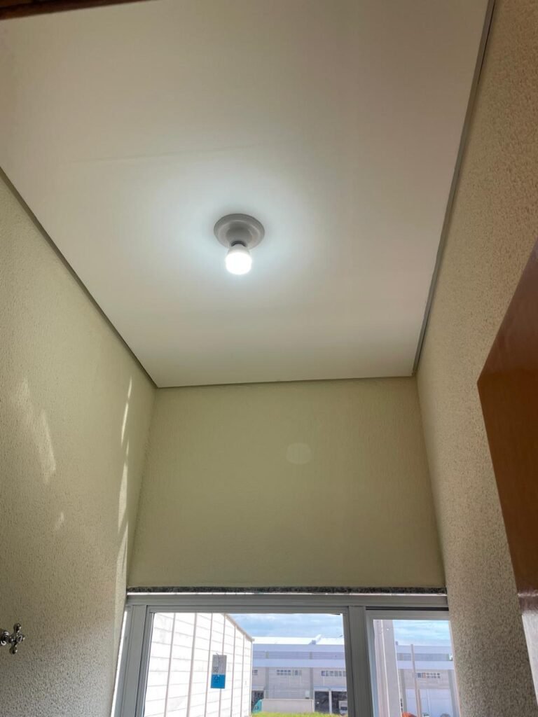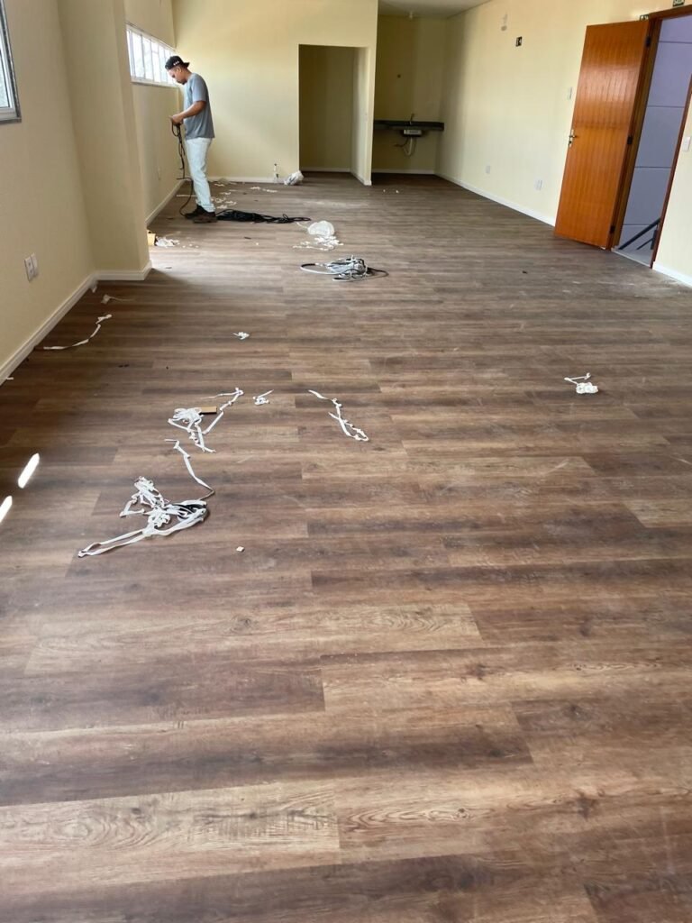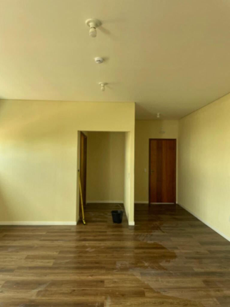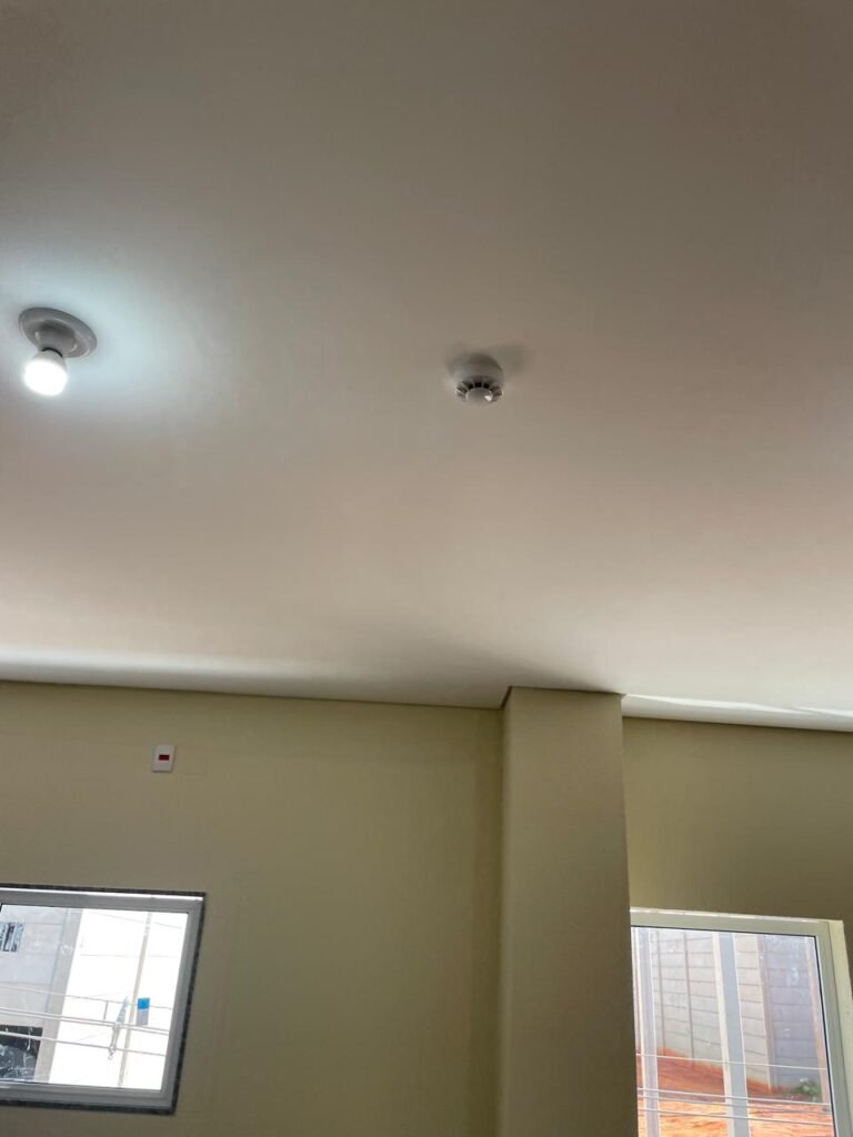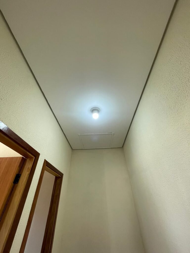 ESCRITÓRIO (05) -: Piso revestido de laminado novo e em ordem, rodapés revestidos de poliestireno na cor branco em ordem, paredes com grafiato e com pintura na cor palha nova em ordem, 36 espelhos de luz sendo eles, 03 espelhos com 01 interruptor, 04 espelhos com 01 tomada, 12 espelhos com 02 tomadas, 12 espelhos cegos, 05 tomadas 220, 01 vidro temperado fixo, marca Blindex, com esquadrias na cor branco em ordem, 07 vitrôs basculantes com 01 vidro temperado marca Blindex cada, com fechadura em ordem, 09 vidros temperados fixos, marca Blindex em ordem, 04 luminárias plafon com led em ordem, 01 central do alarme de incêndio em ordem, 01 porta fixa com 02 vidros temperados marca Blindex em ordem, 02 entradas para alçapão, teto com forro de gesso com pintura nova na cor branco.