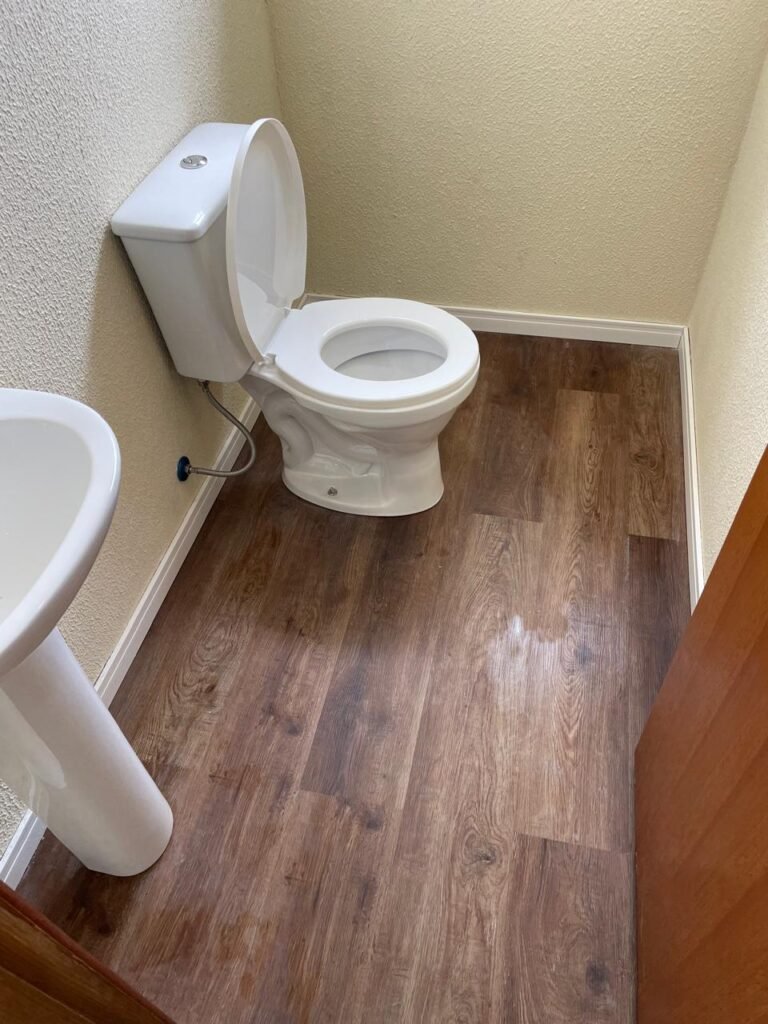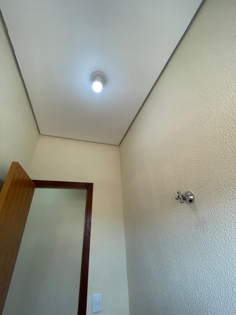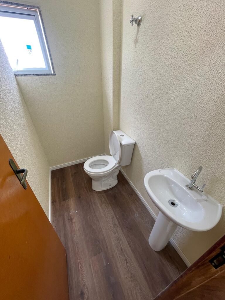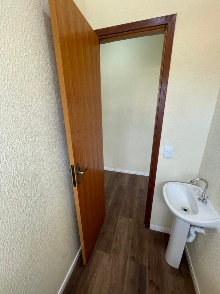 W.C 01 (05) -: 01 porta de madeira envernizada nova em ordem, com maçanetas em ordem e chave embutida, piso revestido de laminado novo e em ordem, rodapés revestidos de poliestireno na cor branco em ordem, paredes com grafiato na cor palha nova em ordem, 01 pia com coluna de cerâmica na cor branco em ordem, 01 torneira em inox nova e em ordem, 01 conjunto sanitário marca Icasa, novo e em ordem, 01 interruptor em ordem, 01 vitrô basculante em ordem, com 01 vidro temperado marca Blindex novo em ordem, com 01 fechadura em ordem, 01 luminária plafon com led em ordem, 01 canopla em inox de registro em ordem.