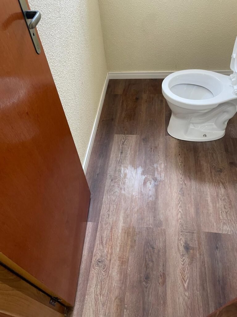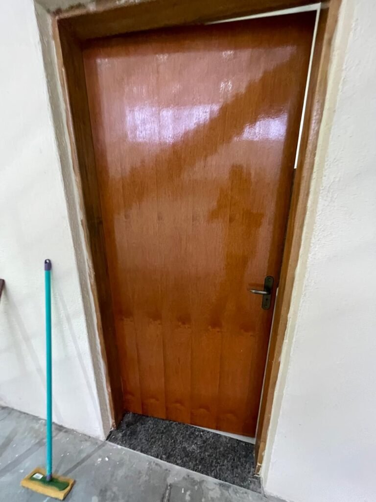 W.C 01 ESCRITÓRIO (GALPÃO 06) -: 01 porta de madeira envernizada nova em ordem, com maçanetas em ordem e chave embutida, piso revestido de laminado novo e em ordem, rodapés revestidos de poliestireno na cor branco em ordem, paredes com grafiato na cor palha nova em ordem, 01 pia com coluna de cerâmica na cor branco em ordem, 01 torneira em inox nova e em ordem, 01 conjunto sanitário marca Icasa, novo e em ordem, 01 interruptor em ordem, 01 vitrô basculante em ordem, com 01 vidro temperado marca Blindex novo em ordem, com 01 fechadura em ordem, 01 luminária plafon com led em ordem, 01 canopla em inox de registro em ordem.