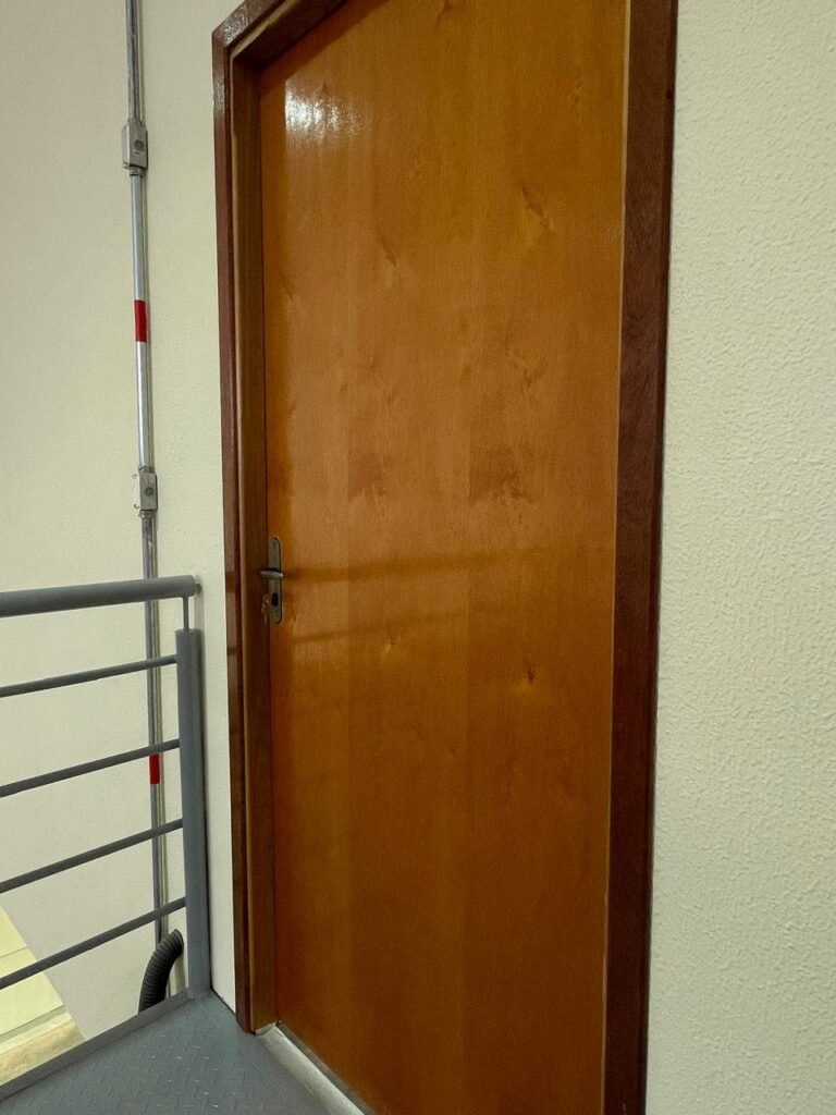 RECEPÇÃO (GALPÃO 06) -: 01 porta de madeira envernizada nova e em ordem, com maçaneta nova e em ordem e com chaves, piso e rodapés revestidos de granito novo e em ordem na cor cinza ocre, paredes com grafiato e pintura na cor amarela nova e em ordem, 07 espelhos de luz sendo eles, 01 espelho com 01 interruptor, 03 espelhos com 02 tomadas e 03 espelhos cegos, todos em ordem, 01 caixa de distribuição de disjuntores com tampa e fechadura Marca Brum em ordem, disjuntores sendo eles, 01 marca Elitek ED10 C 80A 415v, 15 marca Elitek ED6 C20 240/415v, 05 marca Elitek ED6 C16 240/415v e 07 marca Elitek ED6 C32 415V em ordem. 4 luminárias plafon com led em ordem, 01 sensor de presença em ordem, guarda corpo em ordem de inox, 01 porta social com esquadrias de alumínio na cor branco, com 01 vidro temperado marca Blindex em ordem, com maçanetas novas em ordem, 02 vidros temperados fixos, marca Blindex novos e em ordem.