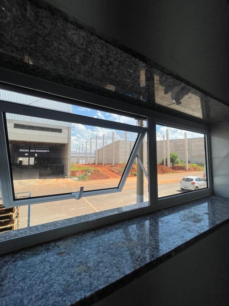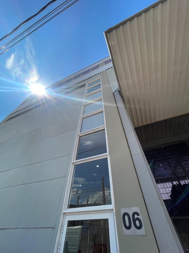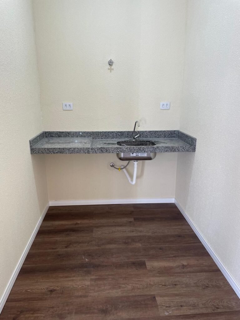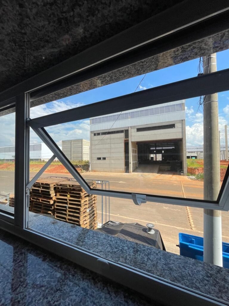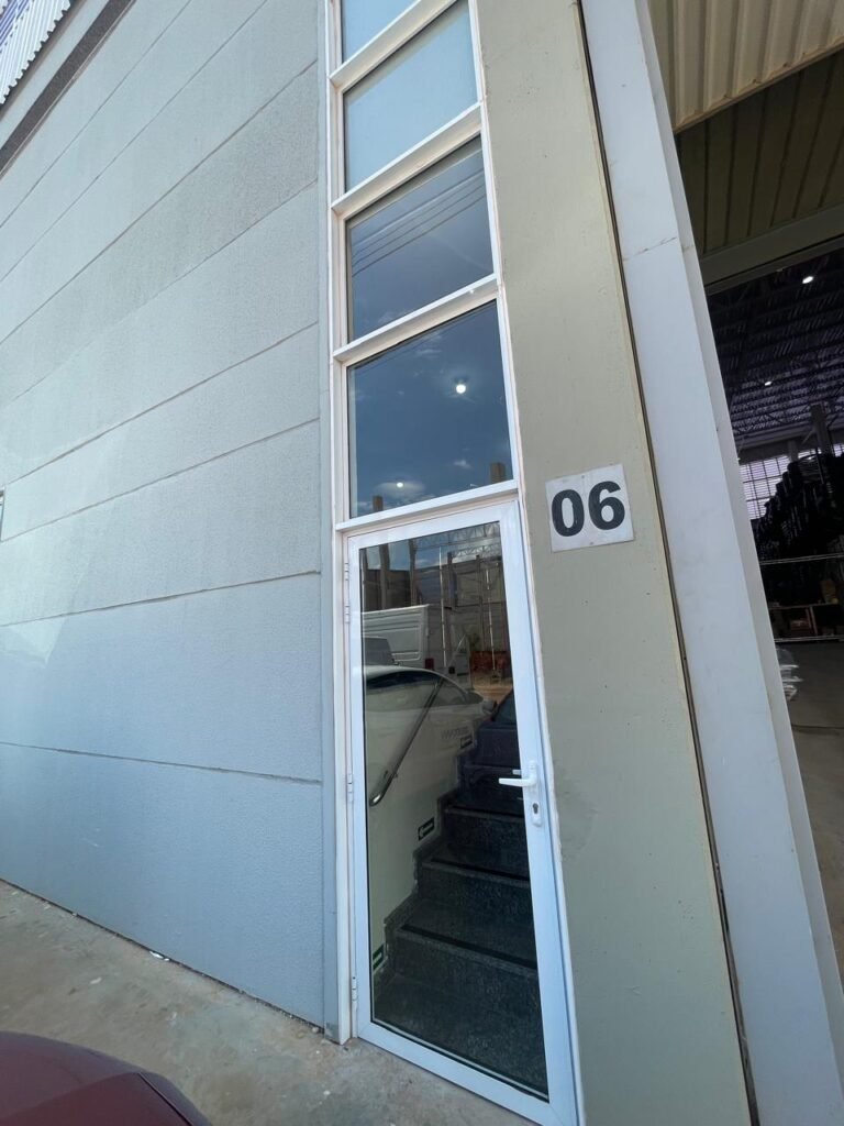ESCRITÓRIO (GALPÃO 06) -: Piso revestido de laminado novo e em ordem, rodapés revestidos de poliestireno na cor branco em ordem, paredes com grafiato e com pintura na cor palha nova em ordem, 01 central geral de Dvr em ordem, 36 espelhos de luz sendo eles, 03 espelhos com 01 interruptor, 04 espelhos com 01 tomada, 14 espelhos com 02 tomadas, 12 espelhos cegos, 05 tomadas 220, 01 vidro temperado fixo, marca Blindex, com esquadrias na cor branco em ordem, 07 vitrôs basculantes com 01 vidro temperado marca Blindex cada, com fechadura em ordem, 09 vidros temperados fixos, marca Blindex em ordem, 04 luminárias plafon com led em ordem, 01 central do alarme de incêndio em ordem, 01 porta fixa com 02 vidros temperados marca Blindex em ordem, 02 entradas para alçapão, teto com forro de gesso com pintura nova na cor branco, 01 pia revestida de granito na cor cinza ocre novo e em ordem, com cuba em inox em ordem, com sifão sanfonado em ordem, 01 torneira em ordem, 01 canopla de registro em ordem.