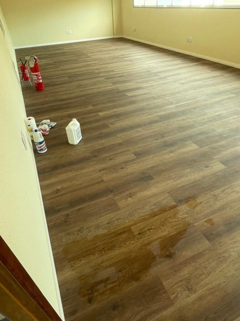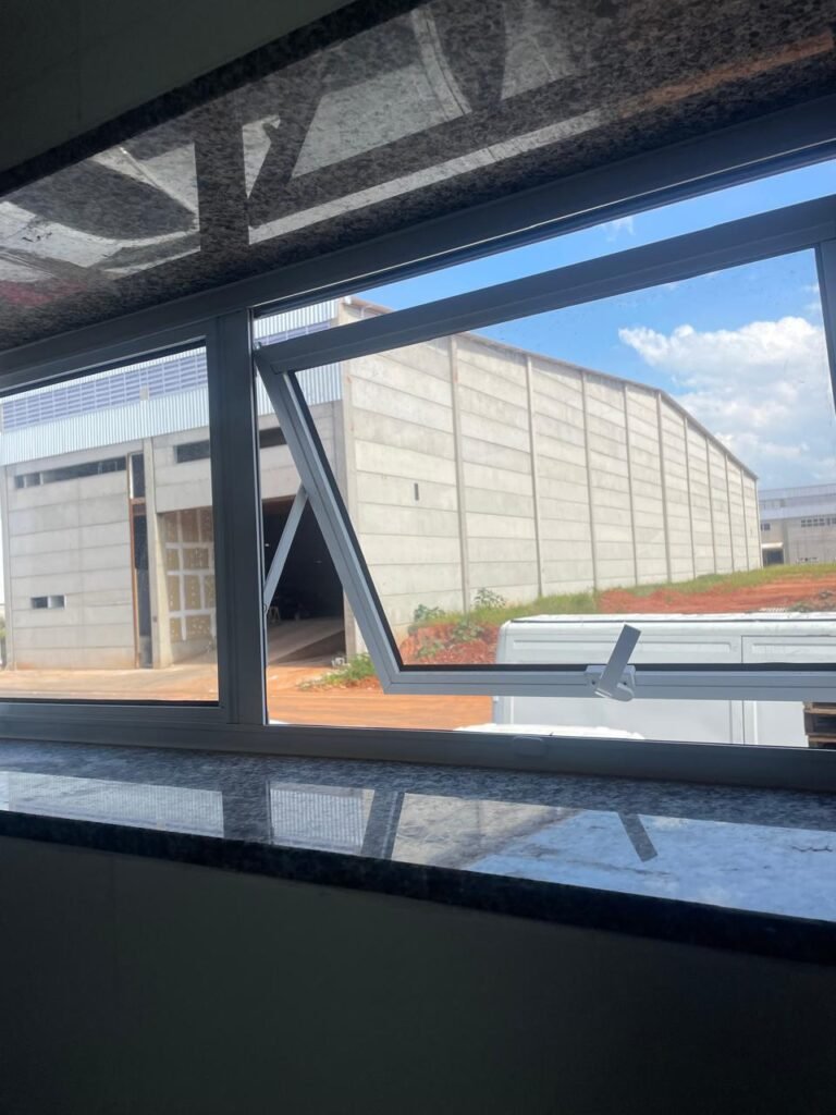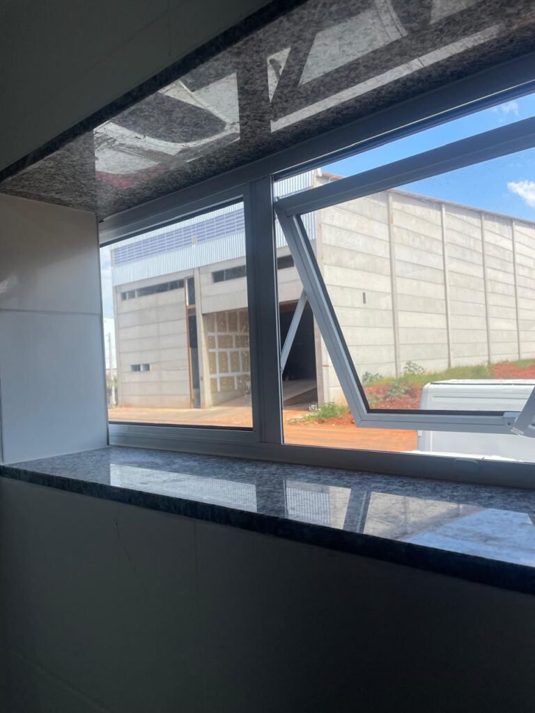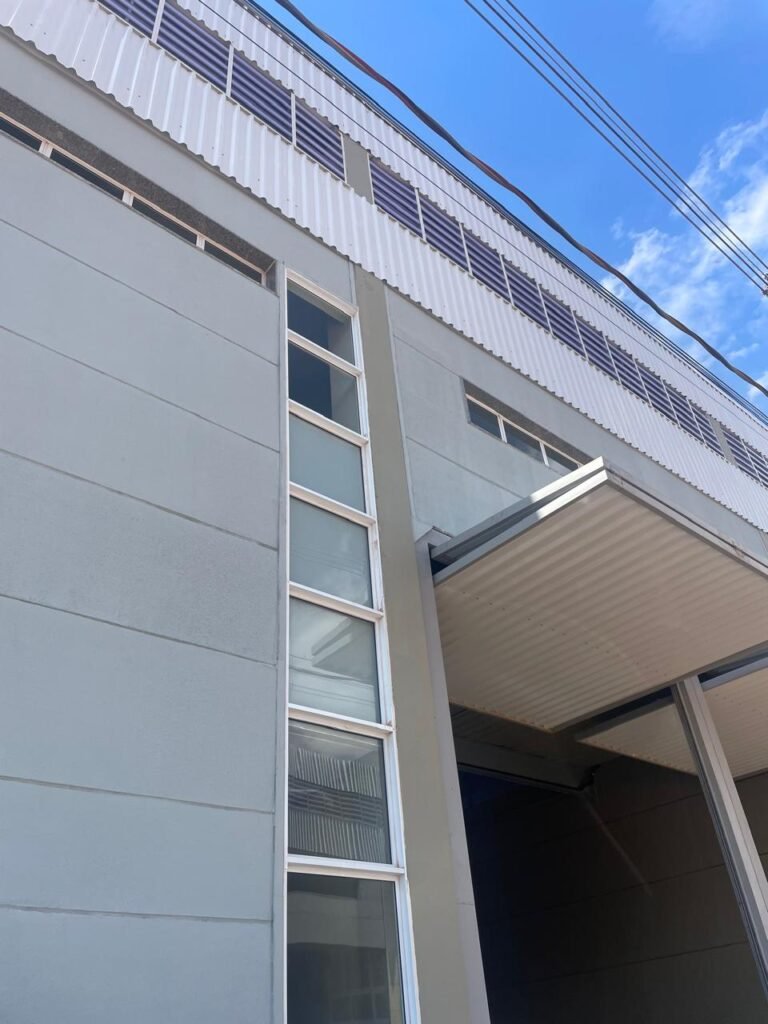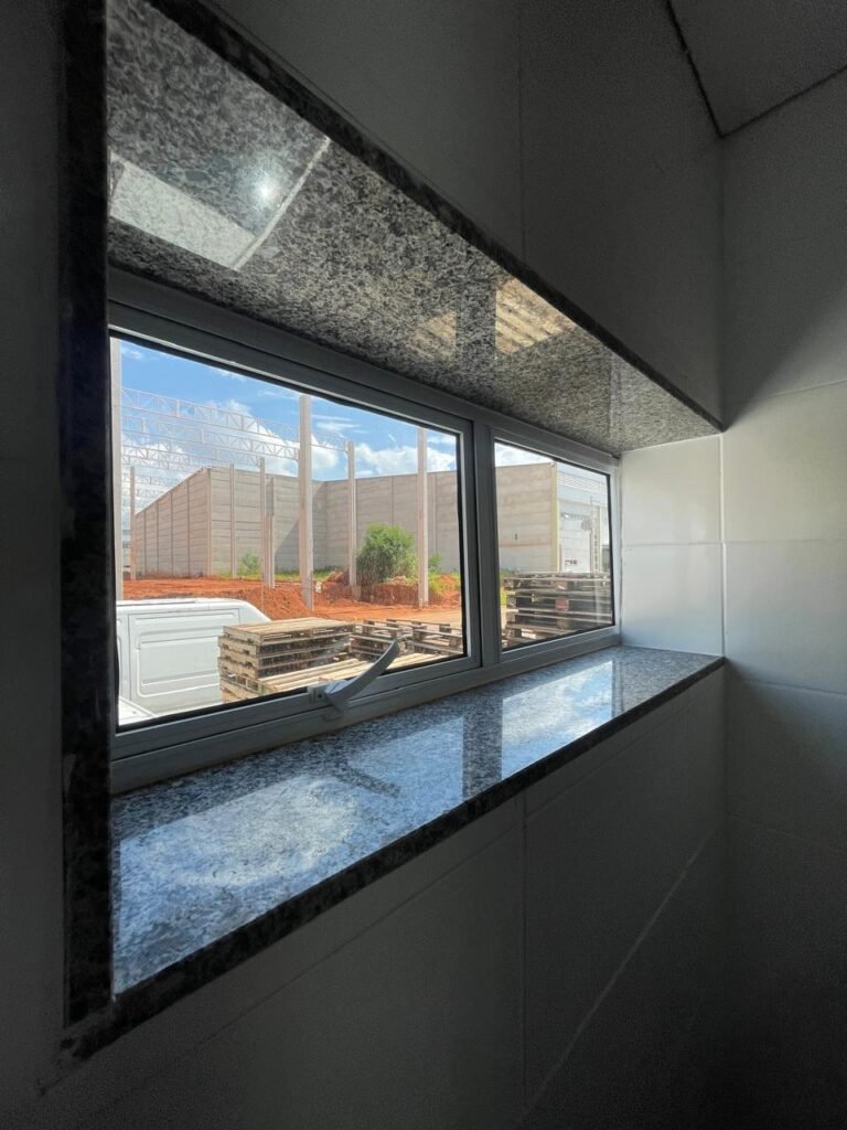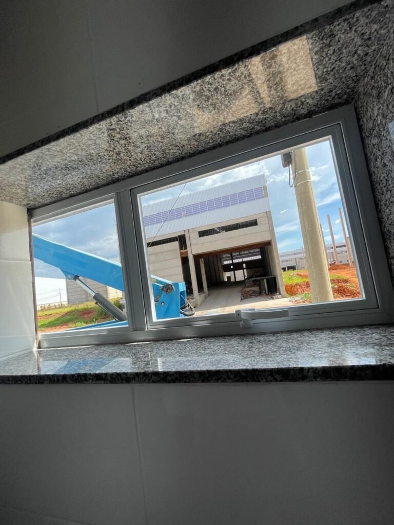 ESCRITÓRIO (GALPÃO 06) -: Piso revestido de laminado novo e em ordem, rodapés revestidos de poliestireno na cor branco em ordem, paredes com grafiato e com pintura na cor palha nova em ordem, 01 central geral de Dvr em ordem, 36 espelhos de luz sendo eles, 03 espelhos com 01 interruptor, 04 espelhos com 01 tomada, 14 espelhos com 02 tomadas, 12 espelhos cegos, 05 tomadas 220, 01 vidro temperado fixo, marca Blindex, com esquadrias na cor branco em ordem, 07 vitrôs basculantes com 01 vidro temperado marca Blindex cada, com fechadura em ordem, 09 vidros temperados fixos, marca Blindex em ordem, 04 luminárias plafon com led em ordem, 01 central do alarme de incêndio em ordem, 01 porta fixa com 02 vidros temperados marca Blindex em ordem, 02 entradas para alçapão, teto com forro de gesso com pintura nova na cor branco, 01 pia revestida de granito na cor cinza ocre novo e em ordem, com cuba em inox em ordem, com sifão sanfonado em ordem, 01 torneira em ordem, 01 canopla de registro em ordem.