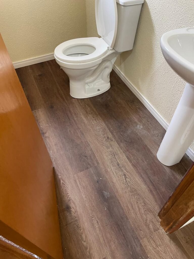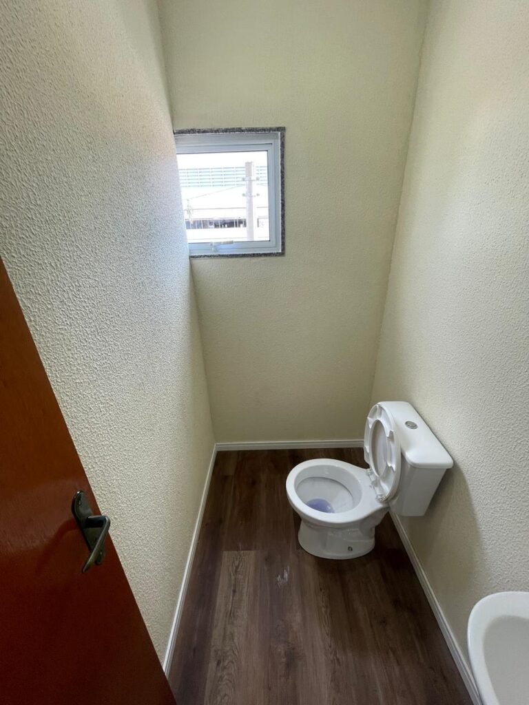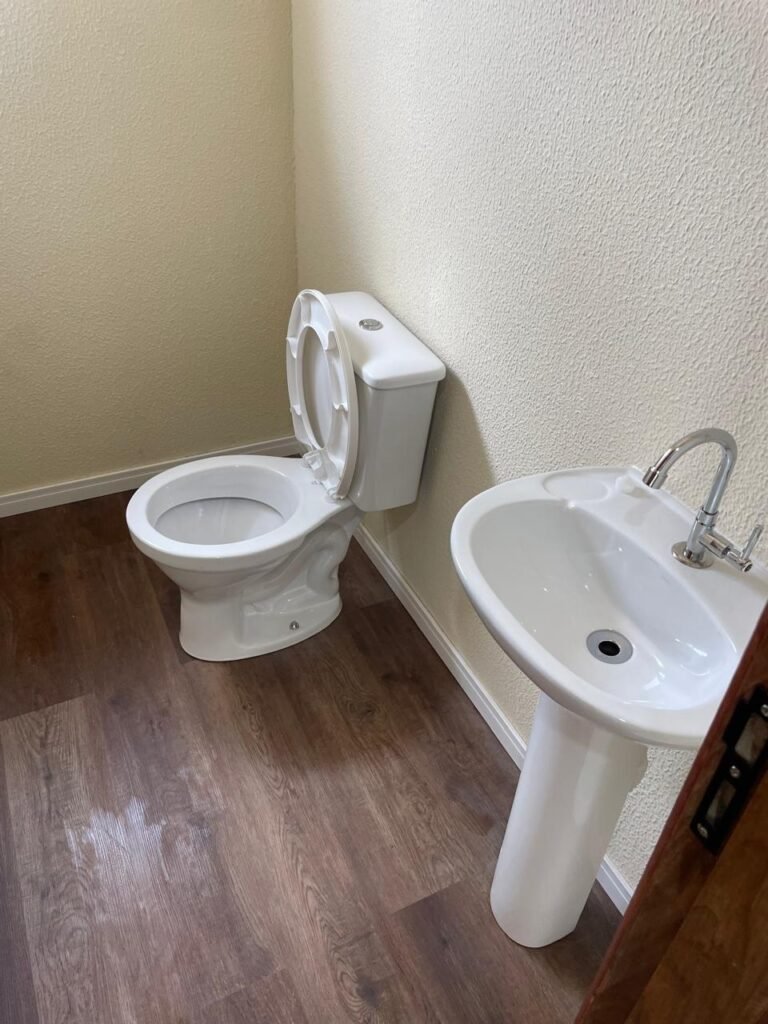 W.C 02 ESCRITÓRIO (GALPÃO 06) -: 01 porta de madeira envernizada nova em ordem, com maçanetas em ordem e chave embutida, piso revestido de laminado novo e em ordem, rodapés revestidos de poliestireno na cor branco em ordem, paredes com grafiato na cor palha nova em ordem, 01 pia com coluna de cerâmica na cor branco em ordem, 01 torneira em inox nova e em ordem, 01 conjunto sanitário marca Icasa, novo e em ordem, 01 interruptor em ordem, 01 vitrô basculante em ordem, com 01 vidro temperado marca Blindex novo em ordem, com 01 fechadura em ordem, 01 luminária plafon com led em ordem, 01 canopla em inox de registro em ordem.
