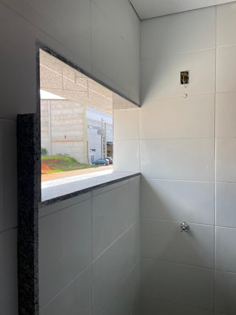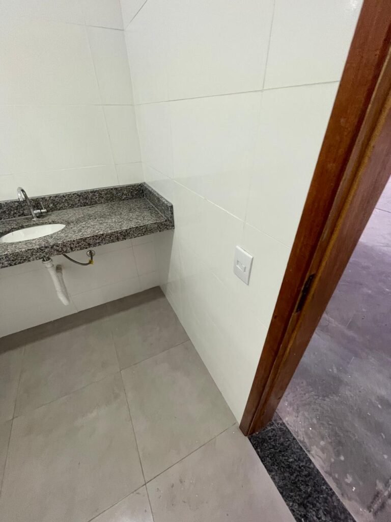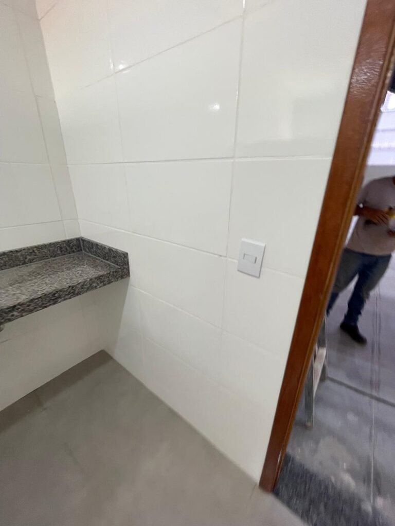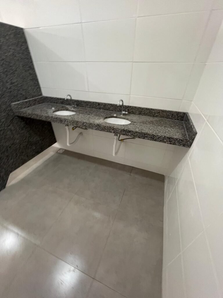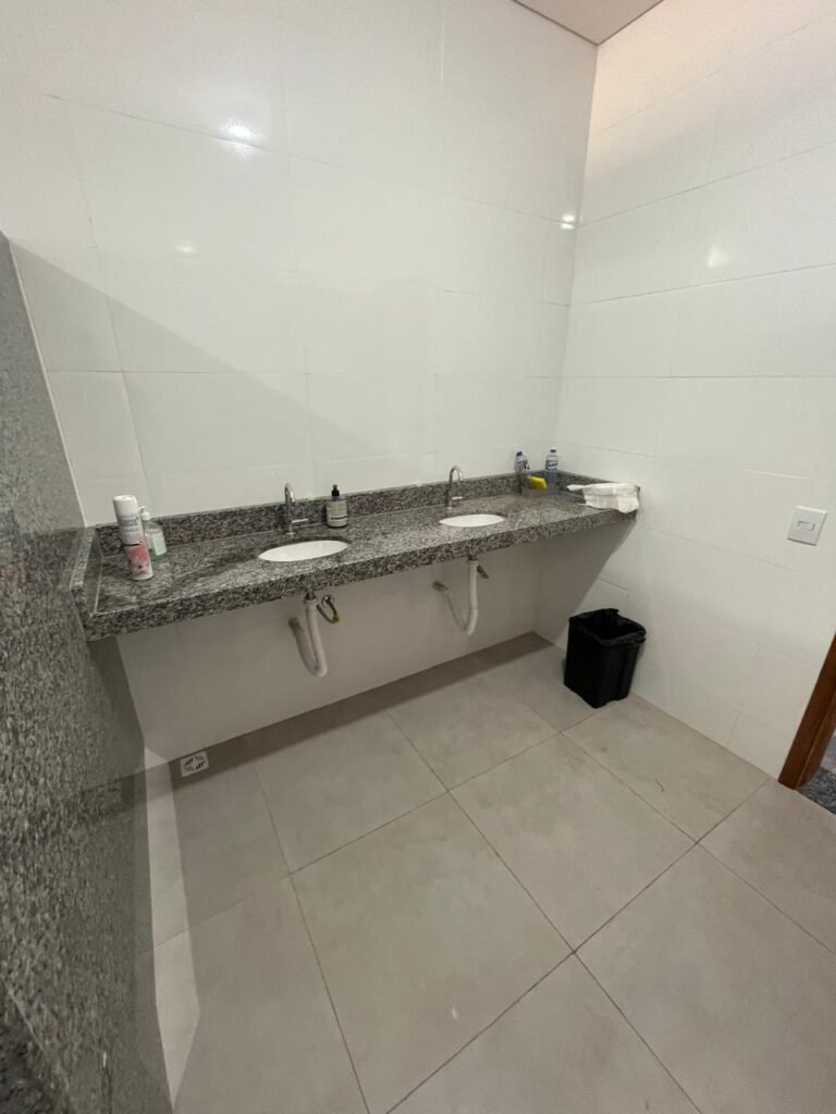 VESTIÁRIO FEMININO (GALPÃO 06) -: 01 porta de madeira envernizada nova e em ordem, com maçaneta nova e em ordem e com chave embutida, pisos revestidos de porcelanato na cor cinza novos e em ordem, paredes revestidas de azulejos na cor branco até o teto, teto com forro de gesso e com pintura na cor branco neve nova e em ordem, 01 entrada para alçapão em ordem, 02 luminárias plafon com leds em ordem, 02 ralos de plástico cor branco novos em ordem, 01 bancada de granito cinza ocre nova e em ordem, 02 cubas de cerâmica na cor branco novas em ordem, 02 torneiras em inox novas em ordem, 02 sifões sanfonados novos em ordem, 03 divisórias de granito cinza ocre novas em ordem, com 03 portas venezianas de alumínio na cor branco novas em ordem, com fechaduras em ordem, 02 conjuntos sanitários de cerâmica na cor branco novos em ordem, com acento em ordem, tampa e descarga em ordem, 01 vitrô basculante com esquadrias na cor branco, com fechadura e com 01 vidro temperado marca Blindex, novos e em ordem, 02 canoplas em inox em ordem, 01 pré-instalação de chuveiro, 01 espelho de luz com 01 interruptor em ordem.