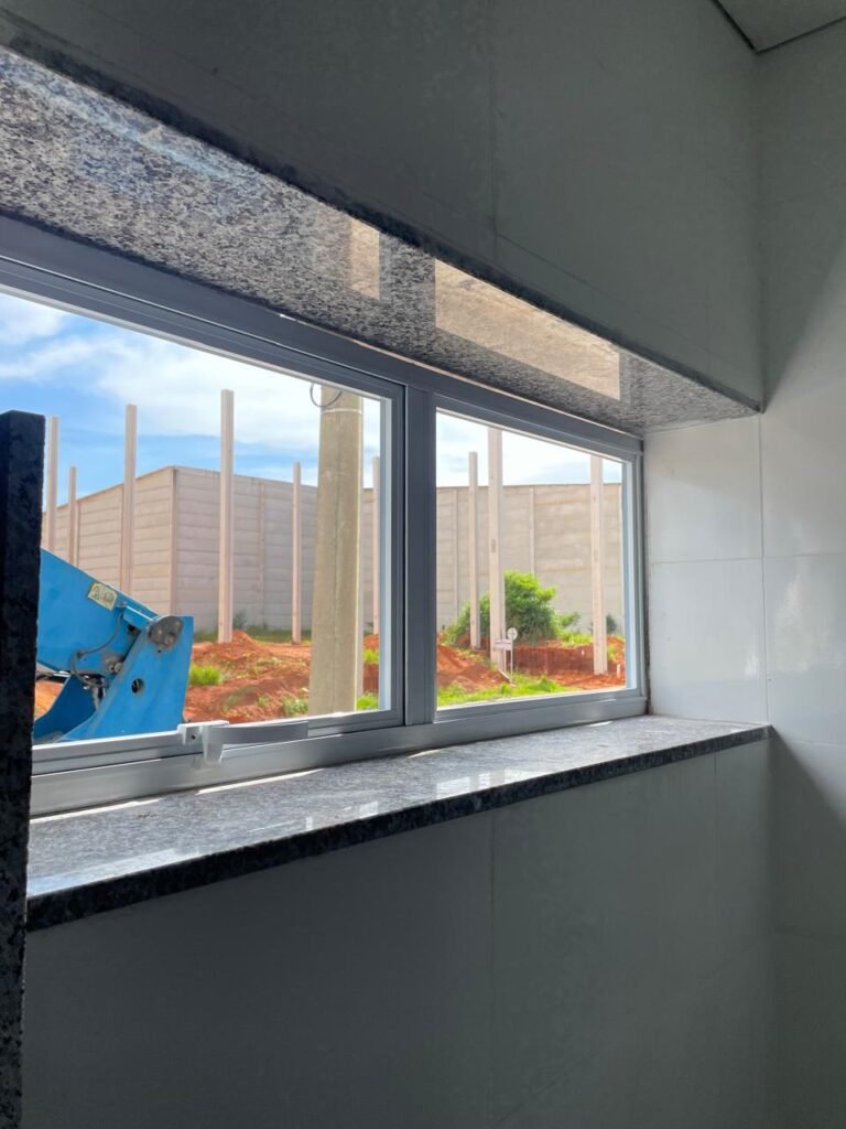 FACHADA -: Calçada de concreto usinado, em pré moldados texturizados novos e em ordem, pintura na cor platina nova e em ordem, venezianas comoventes novas e em ordem, 04 portões de chapa dobrada com fechamento em telhas galvanizadas cor branco novas e em ordem, com 02 fechaduras cada em ordem, esquadrias em alumínio branco com, 01 porta social com esquadrias na cor branco em ordem, com 01 folha de vidro temperado marca Blindex em ordem e com maçanetas em ordem, 07 vidros temperados marca Blindex fixos novos e em ordem, 01 poste padrão com 02 relógios em ordem, porém só um está ligado, tubulação de bombeiros com registro em ordem, 02 hidrômetros em ordem.