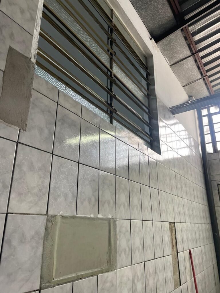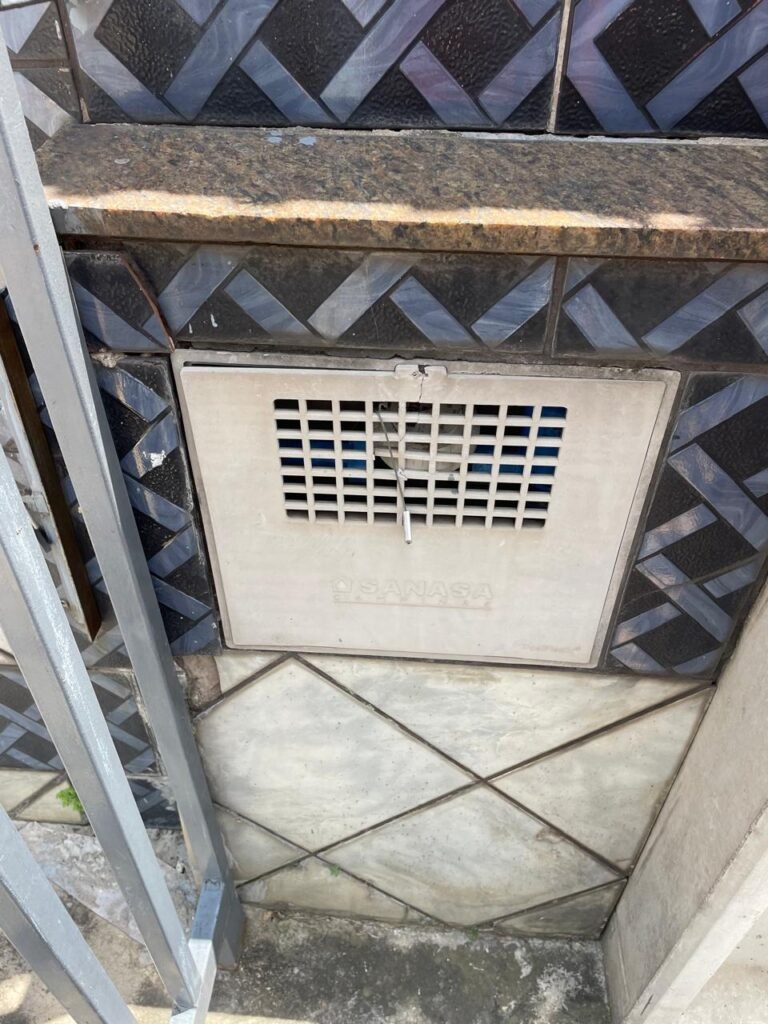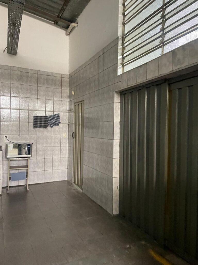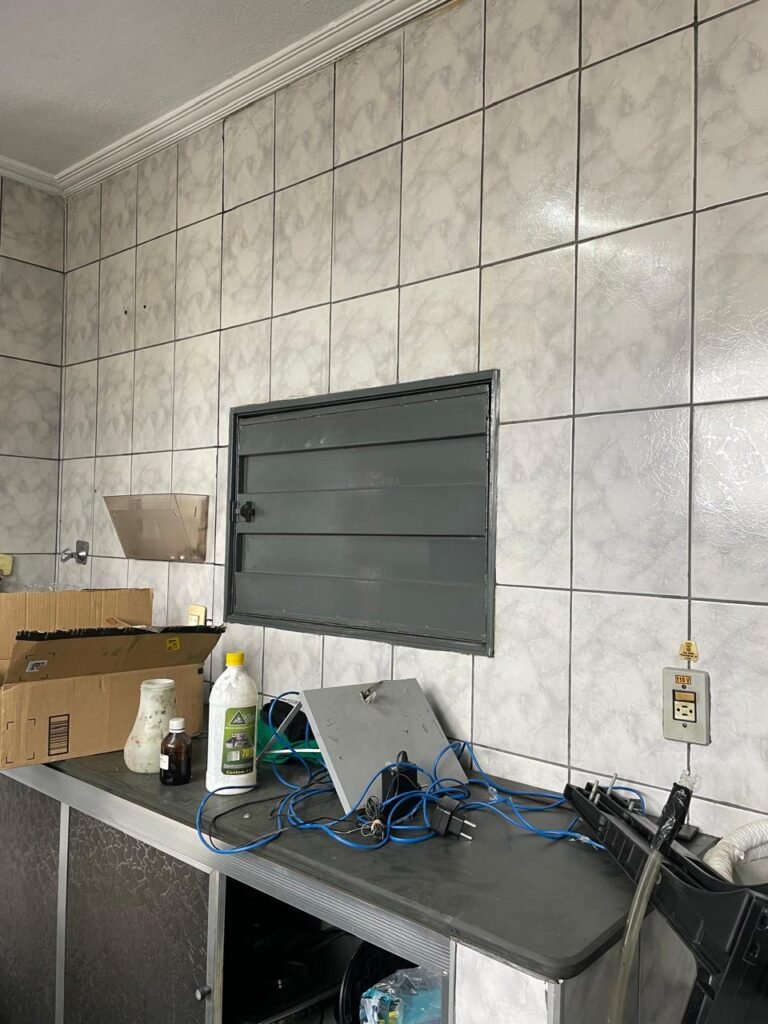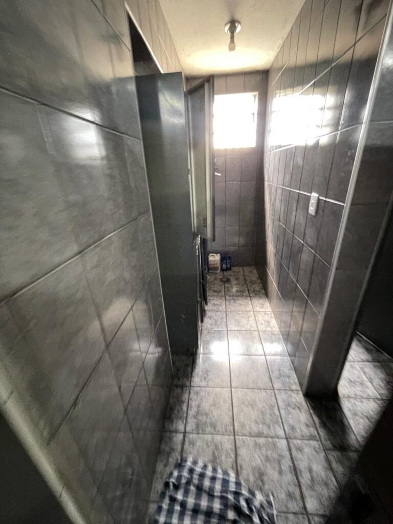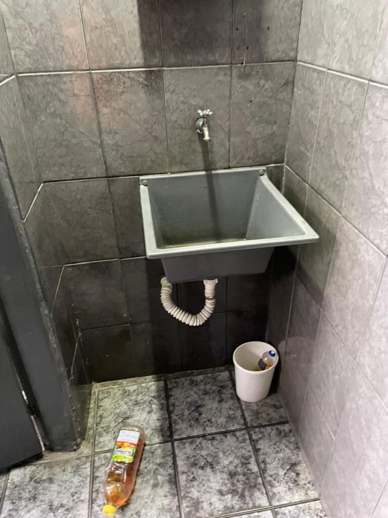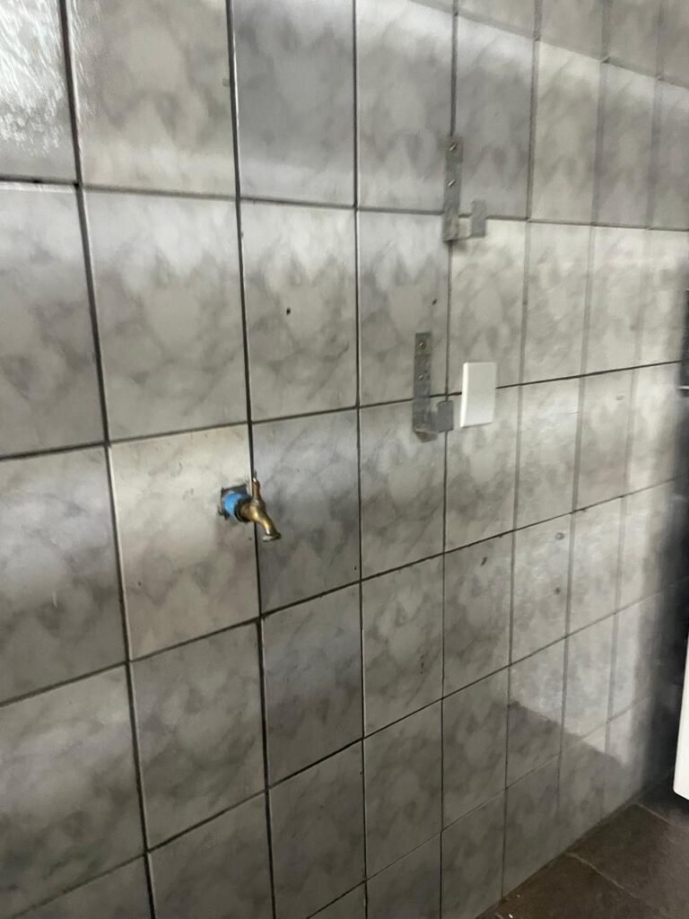 FUNDOS -: Piso revestido de pisos frios cerâmicos com partes danificadas e com desgaste natural, paredes revestidas na metade de pisos frios cerâmicos com desgaste natural, restante de parede com pintura na cor branco neve em ordem, estrutura de ferro com 02 luminárias com 05 Luminárias Led florescente em ordem, 12 espelhos de luz sendo, 06 tomadas, 02 interruptores e 05 espelho cegos, 02 sensor de presença, 01 varal com 04 fios em ordem, 01 cabide de inox com ganchos cinco, 01 pia de alvenaria com pedra de mármore cor preto com Cuba de inox em ordem com 01 torneira dupla com chuveiro e minha em ordem, 02 portas de PVC em ordem, 01 sifão sanfonado em ordem, 01 ralo de inox em ordem, 01 janela basculante com 70 vidros em ordem 01 fechadura em ordem, 01 porta social de ferro com tela e grade de proteção, 02 chaves tetra e sem fechadura, 03 ralos e 01 torneira.