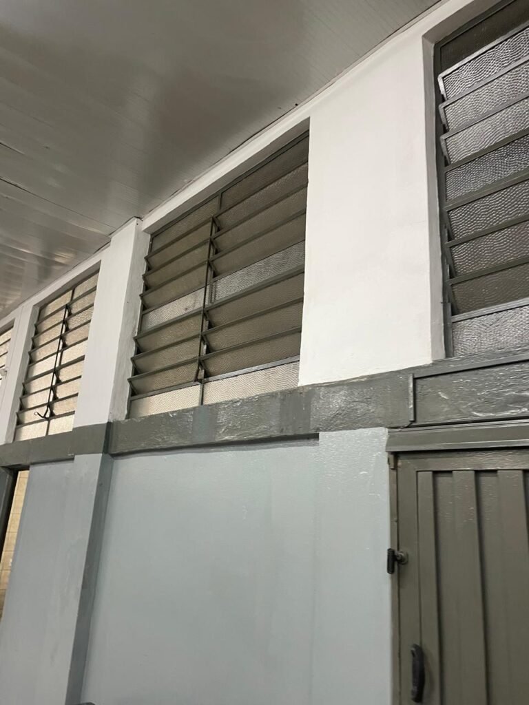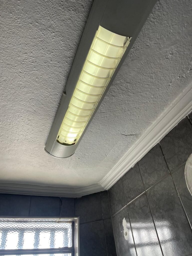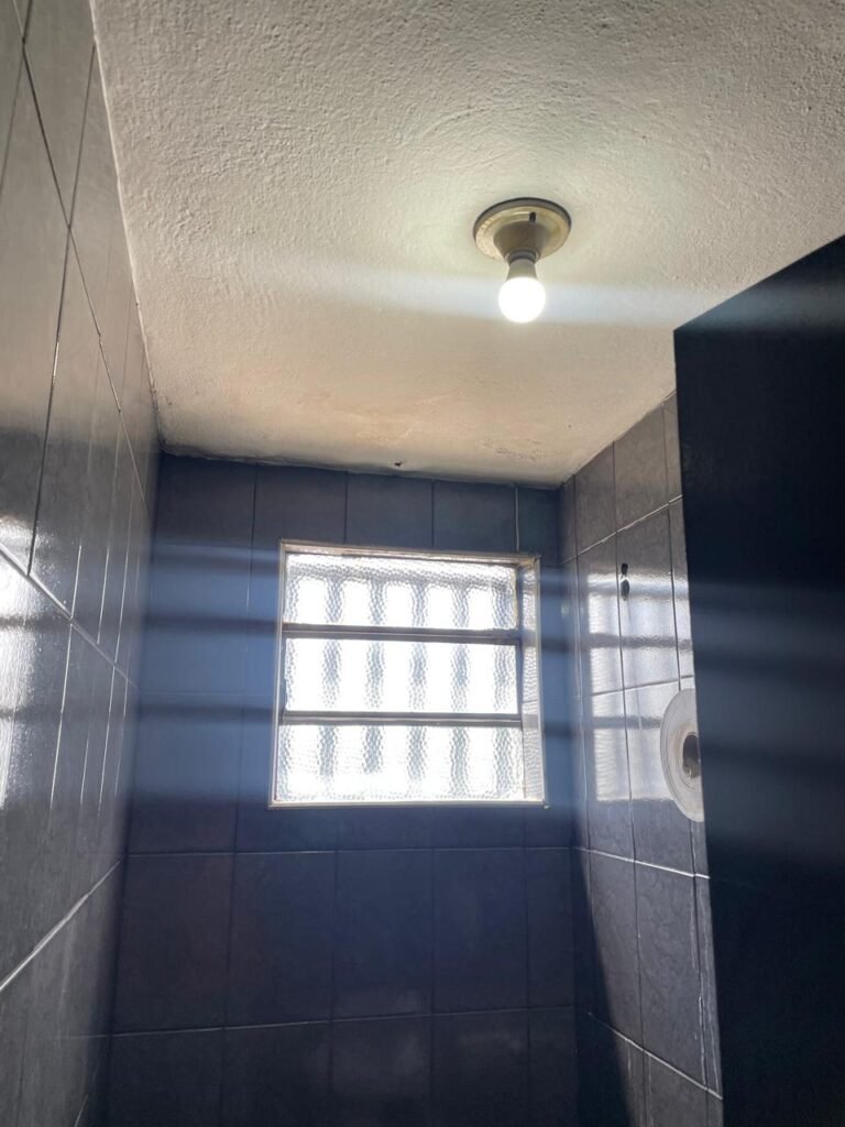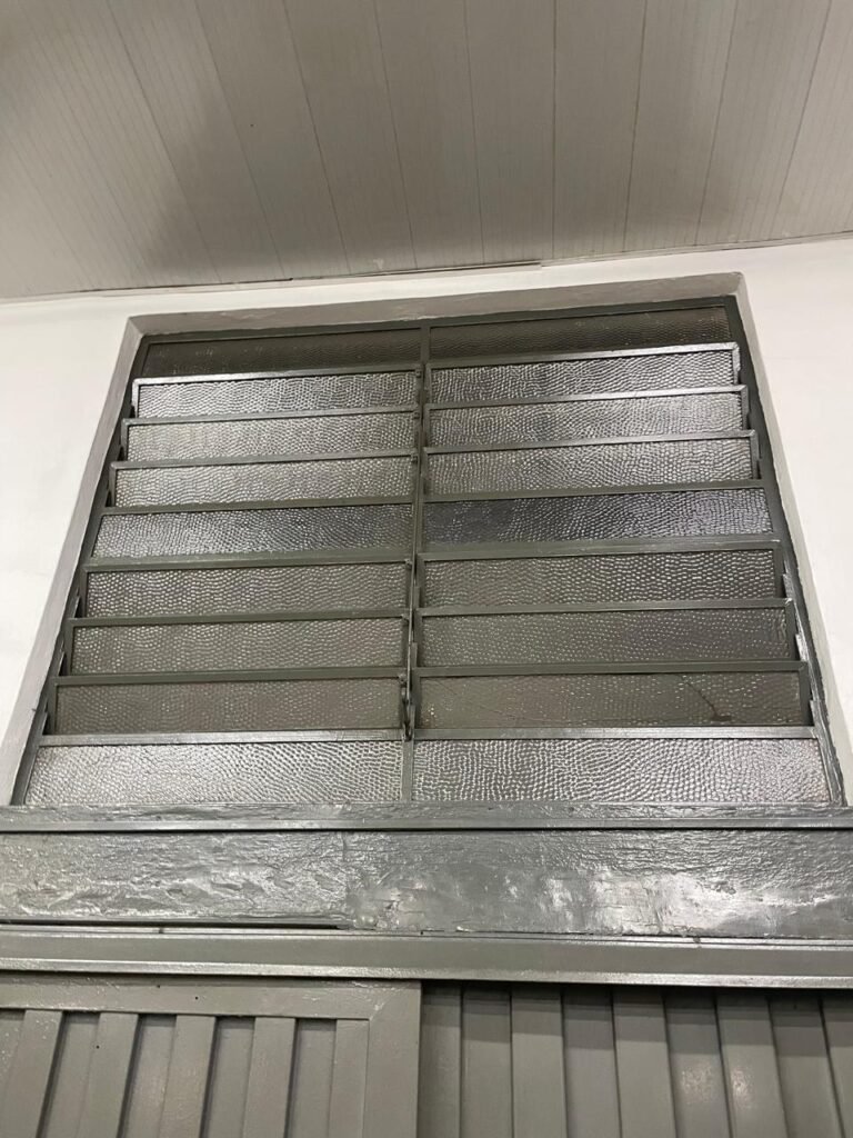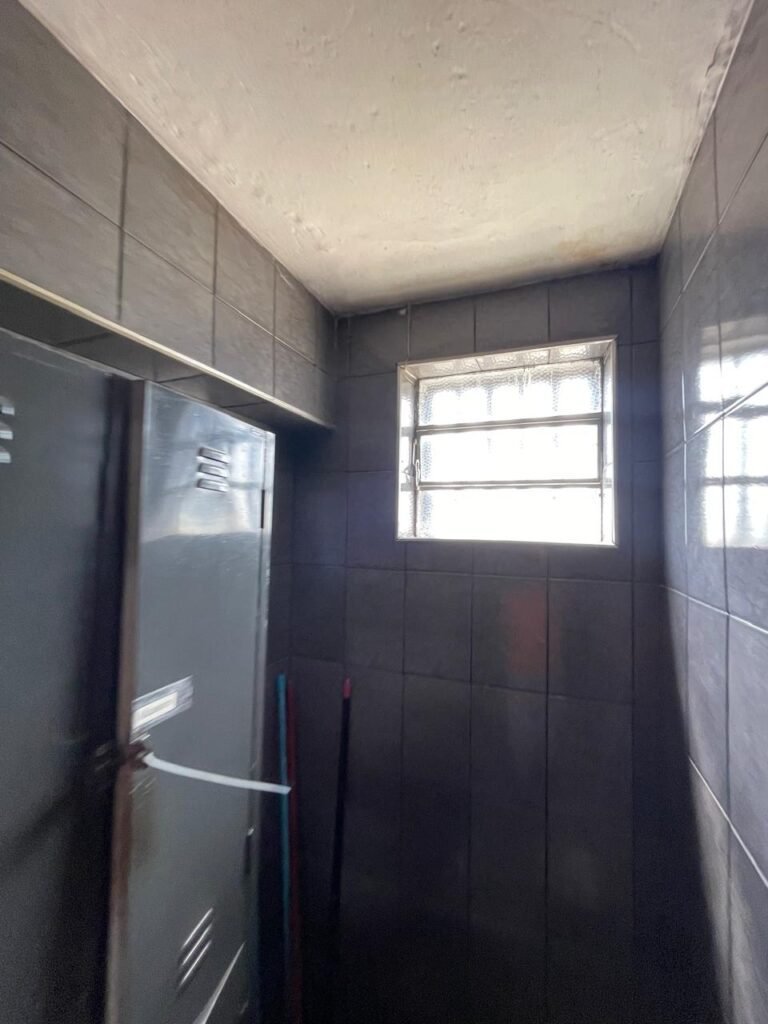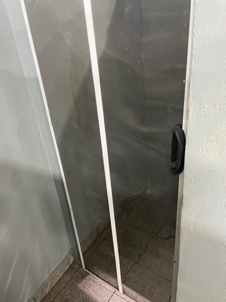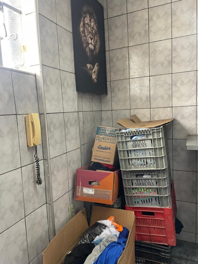 FUNDOS -: Piso revestido de pisos frios cerâmicos com partes danificadas e com desgaste natural, paredes revestidas na metade de pisos frios cerâmicos com desgaste natural, restante de parede com pintura na cor branco neve em ordem, estrutura de ferro com 02 luminárias com 05 Luminárias Led florescente em ordem, 12 espelhos de luz sendo, 06 tomadas, 02 interruptores e 05 espelho cegos, 02 sensor de presença, 01 varal com 04 fios em ordem, 01 cabide de inox com ganchos cinco, 01 pia de alvenaria com pedra de mármore cor preto com Cuba de inox em ordem com 01 torneira dupla com chuveiro e minha em ordem, 02 portas de PVC em ordem, 01 sifão sanfonado em ordem, 01 ralo de inox em ordem, 01 janela basculante com 70 vidros em ordem 01 fechadura em ordem, 01 porta social de ferro com tela e grade de proteção, 02 chaves tetra e sem fechadura, 03 ralos e 01 torneira.