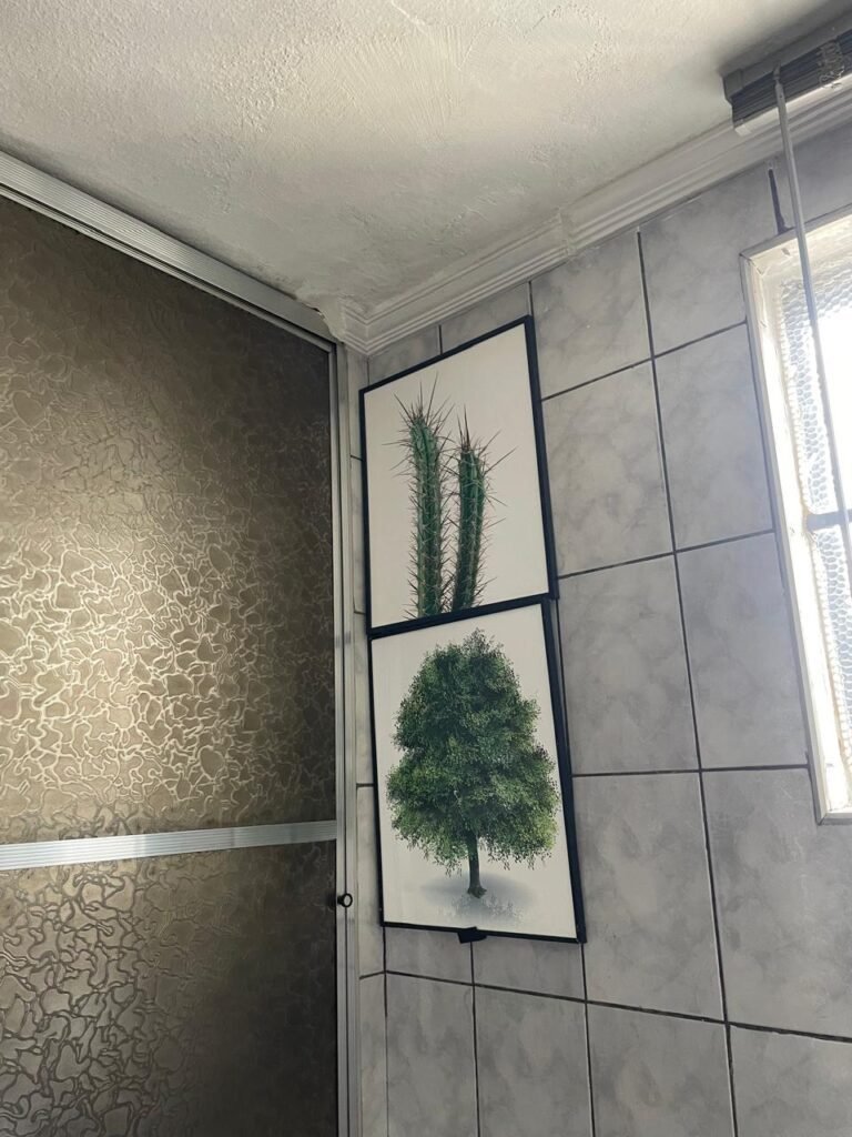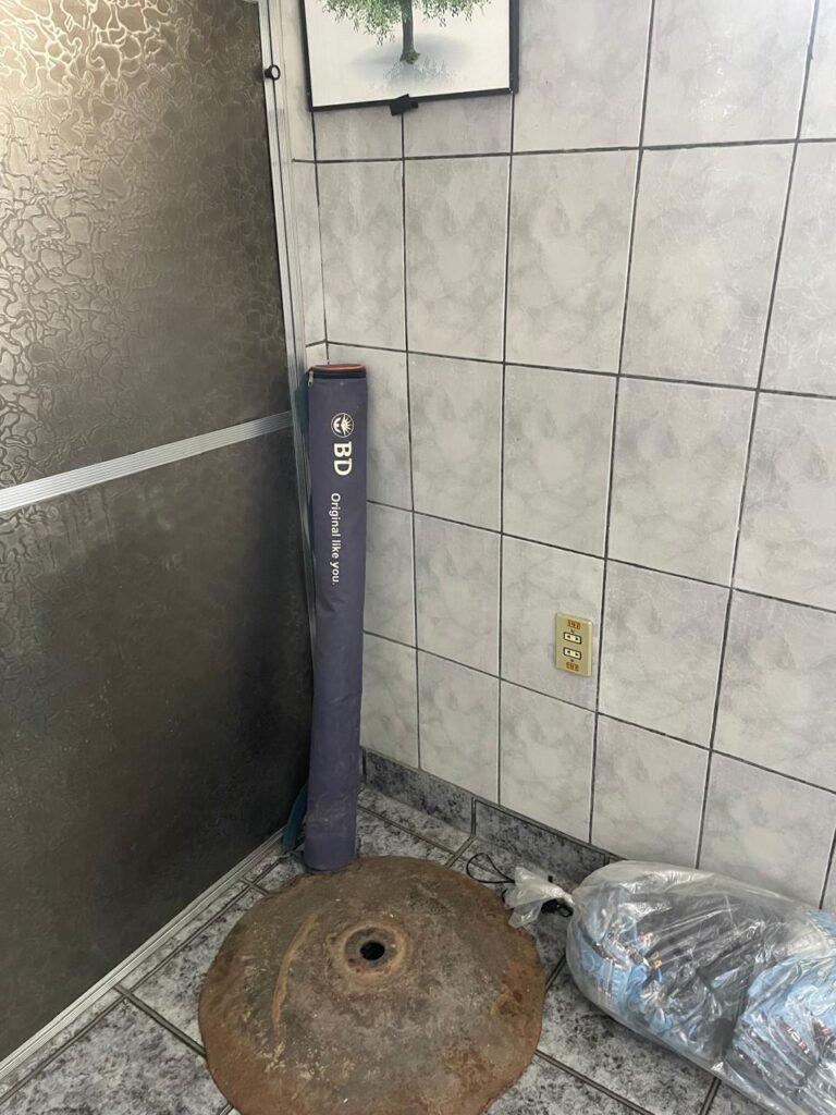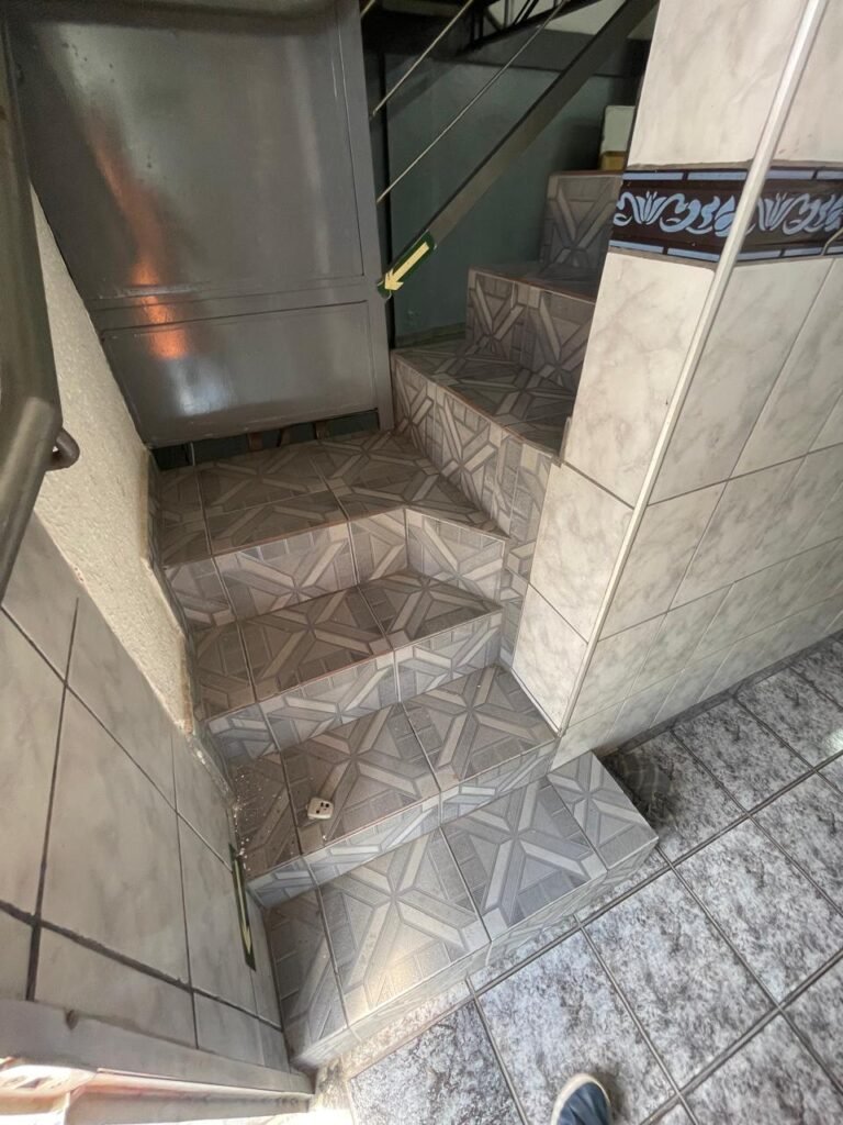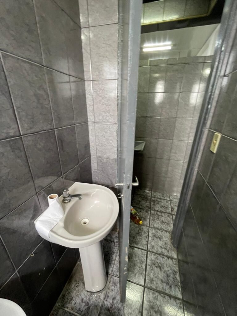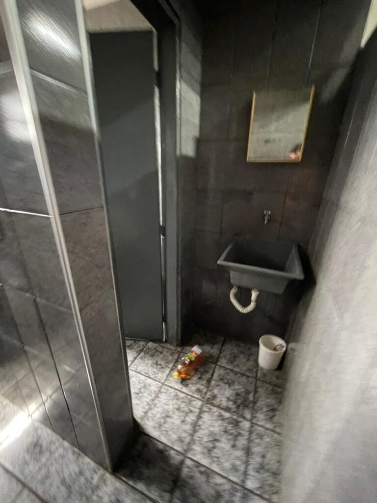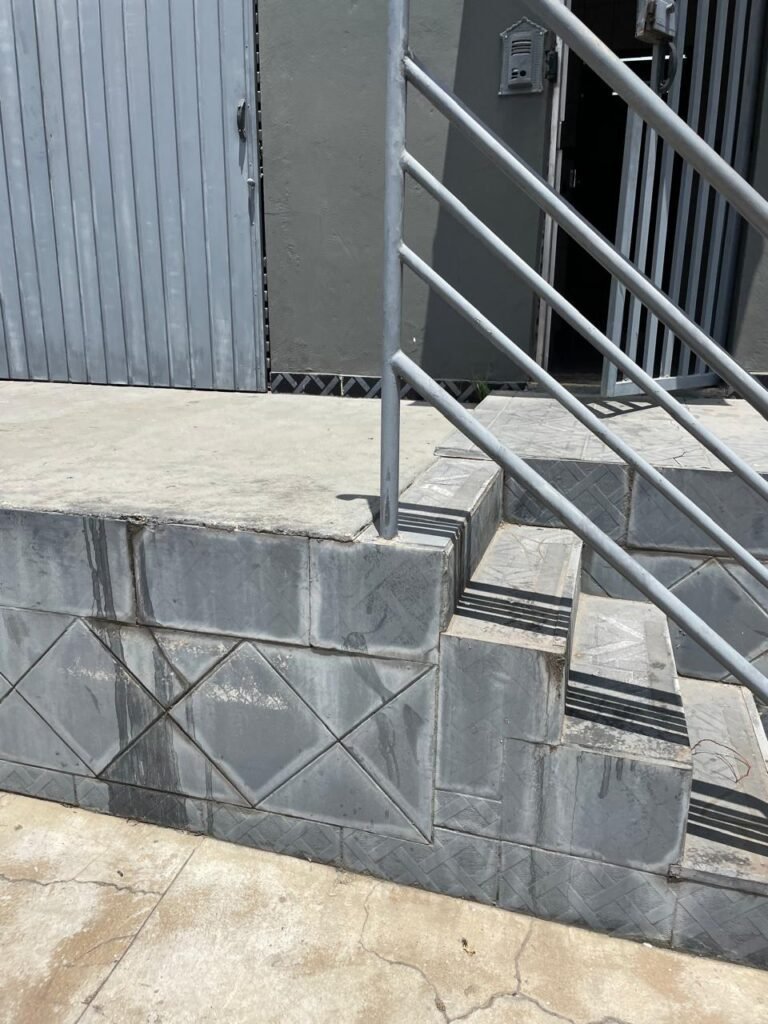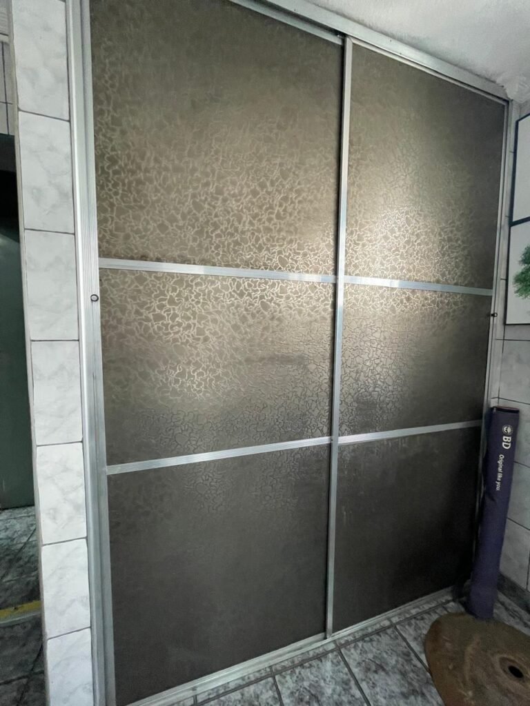 FUNDOS -: Piso revestido de pisos frios cerâmicos com partes danificadas e com desgaste natural, paredes revestidas na metade de pisos frios cerâmicos com desgaste natural, restante de parede com pintura na cor branco neve em ordem, estrutura de ferro com 02 luminárias com 05 Luminárias Led florescente em ordem, 12 espelhos de luz sendo, 06 tomadas, 02 interruptores e 05 espelho cegos, 02 sensor de presença, 01 varal com 04 fios em ordem, 01 cabide de inox com ganchos cinco, 01 pia de alvenaria com pedra de mármore cor preto com Cuba de inox em ordem com 01 torneira dupla com chuveiro e minha em ordem, 02 portas de PVC em ordem, 01 sifão sanfonado em ordem, 01 ralo de inox em ordem, 01 janela basculante com 70 vidros em ordem 01 fechadura em ordem, 01 porta social de ferro com tela e grade de proteção, 02 chaves tetra e sem fechadura, 03 ralos e 01 torneira.