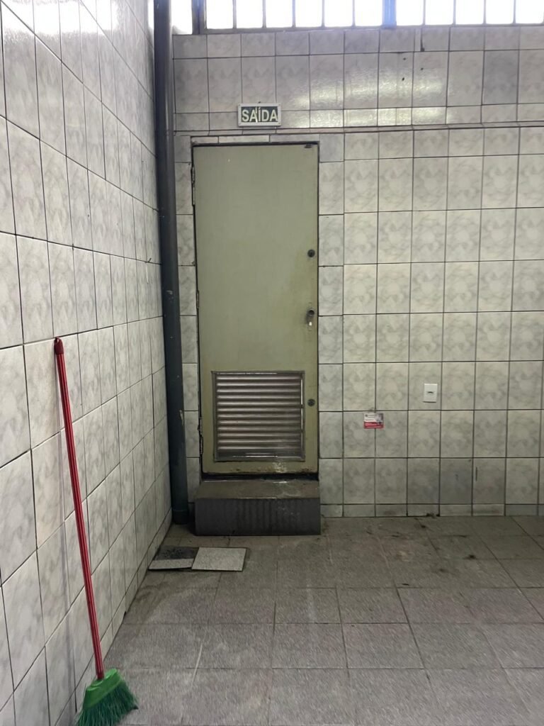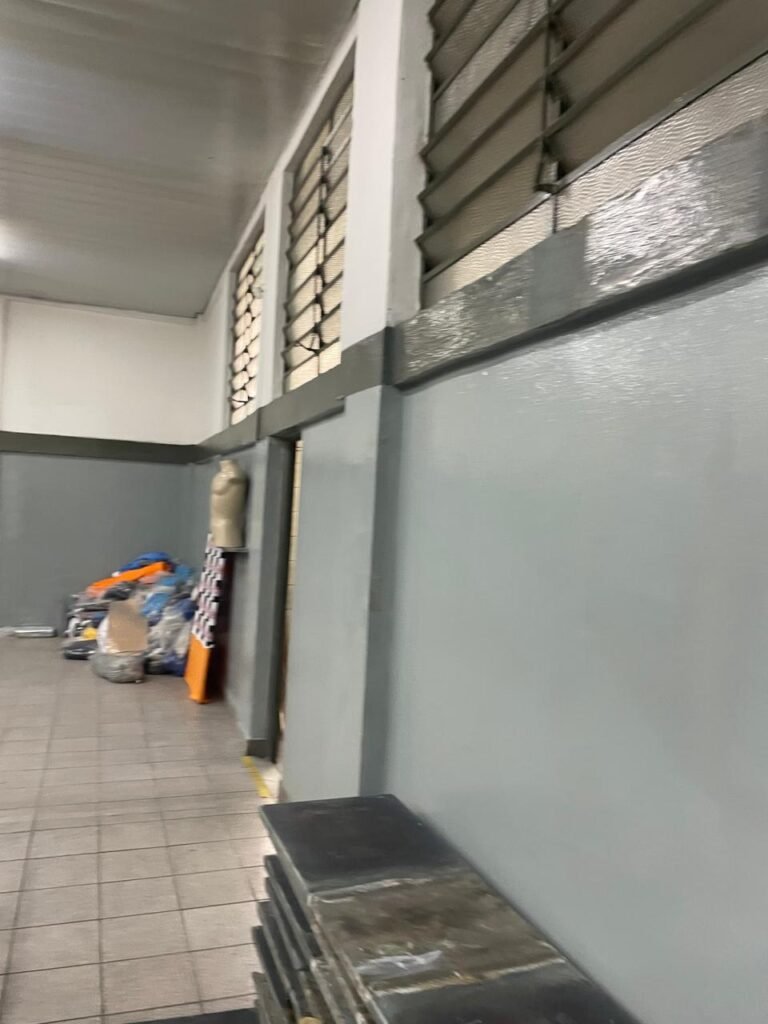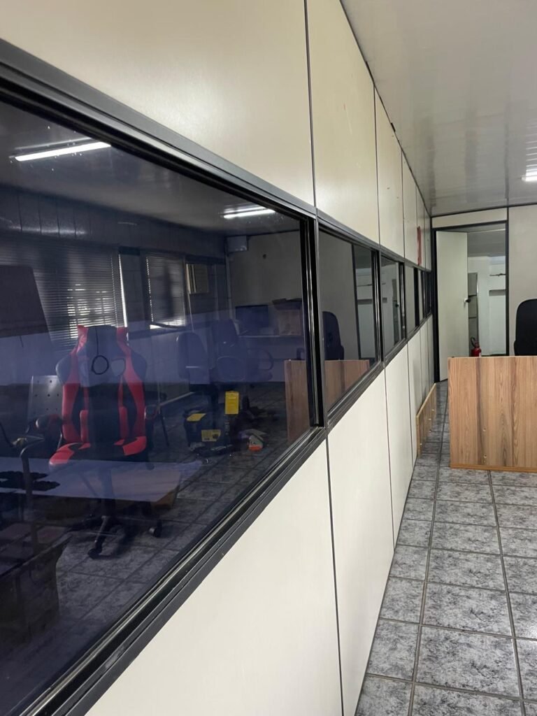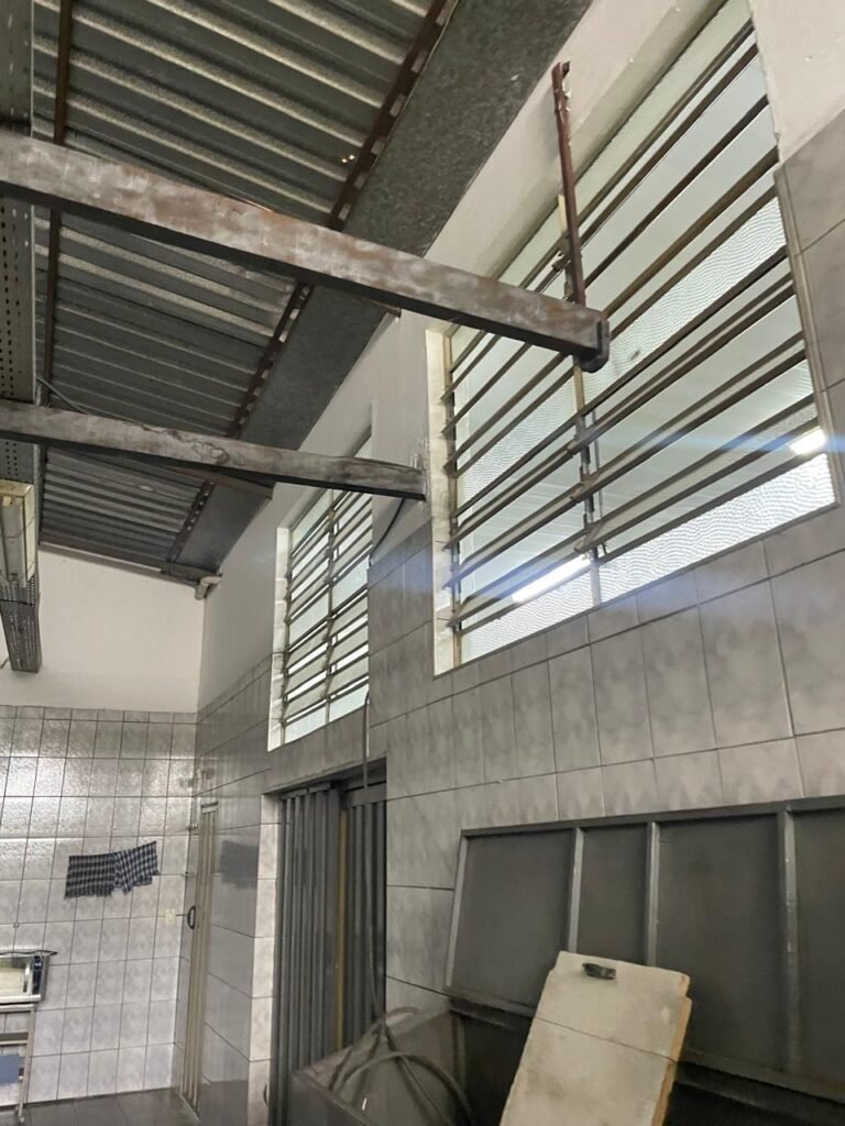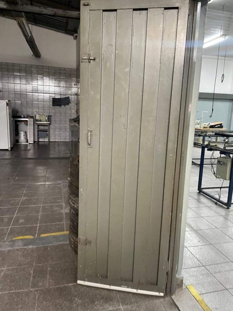 BARRACÃO INTERIOR -: 01 porta social de vidro liso blindex, com 02 puxadores em ordem, 01 fechadura yale em ordem, pisos e rodapés revestidos de frio cerâmico com desgaste natural e restante em ordem, paredes com pintura 1/2 na cor cinza em ordem, faixa de pintura na cor preto em ordem, e restante com pintura na cor branco neve em ordem, , teto com forro de pvc com desgaste natural e buracos por extensão, 16 luminárias tubulares, com 41 lâmpadas florescentes em ordem, 01 luminária de emergência, 02 sensores de presença em ordem, 04 vitrôs basculantes com 18 vidros temperados cada, sendo que 01 deles estão trincados, 01 maçaneta cada, sendo que 01 deles estão faltando. 02 portas sociais de ferro, com 04 fechaduras cada, sendo que 01 delas está com trinco solto, 01 portão de ferro deslizante, com fechadura yale em ordem, com 01 puxador em ordem e com pintura cinza com desgaste natural, 01 porta social de ferro com 02 puxadores em ordem, 02 trincos em ordem e com pintura na cor cinza com desgaste natural, 10 tomadas em ordem, 02 extintores sendo pó químico BC 20B:C 4Kg, 01 caixa de distribuição de disjuntores, com tampa de proteção em ordem, com disjuntores sendo, 01 SD 3P 100A, 02 SD C32 1P, e 01 SD C50 2P. 01 parede divisória de dry wall, 01 porta social de ferro com 02 fechaduras em ordem, 02 puxadores em ordem e com pintura na cor cinza com desgaste natural e restante em ordem, 02 portas de ferro de enrolar, com pintura na cor cinza com desgaste natural, com 04 trincos em ordem cada.