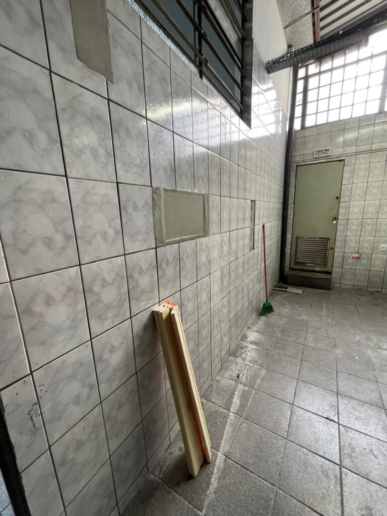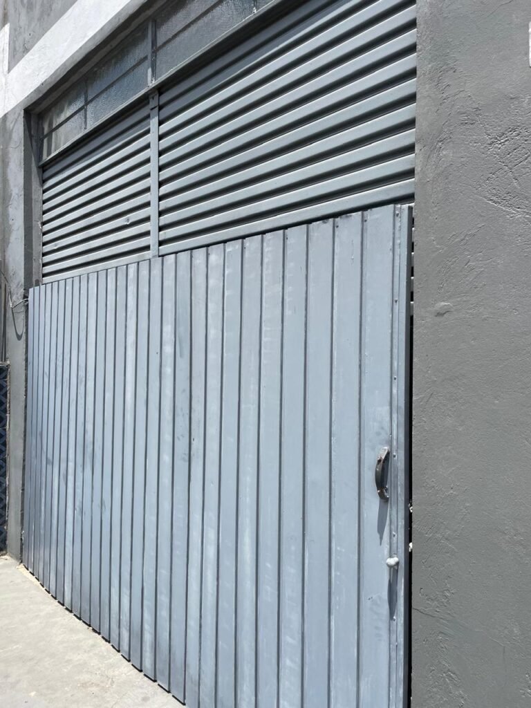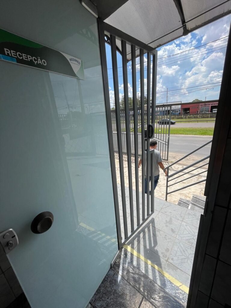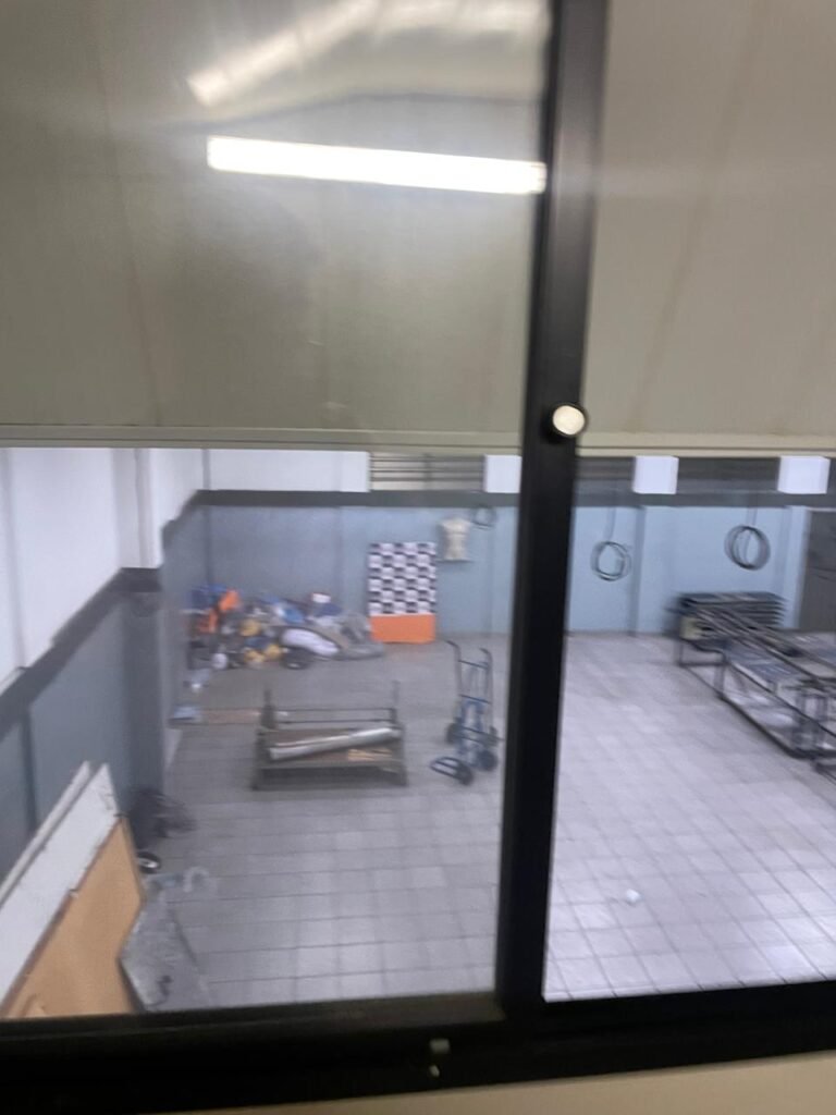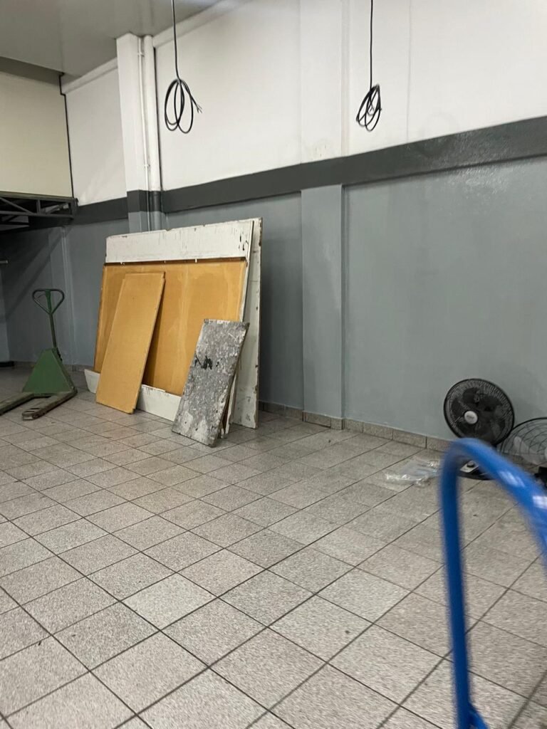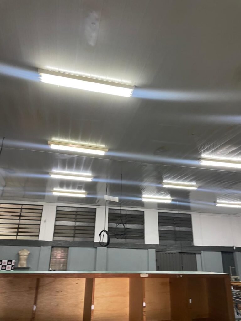 BARRACÃO INTERIOR -: 01 porta social de vidro liso blindex, com 02 puxadores em ordem, 01 fechadura yale em ordem, pisos e rodapés revestidos de frio cerâmico com desgaste natural e restante em ordem, paredes com pintura 1/2 na cor cinza em ordem, faixa de pintura na cor preto em ordem, e restante com pintura na cor branco neve em ordem, , teto com forro de pvc com desgaste natural e buracos por extensão, 16 luminárias tubulares, com 41 lâmpadas florescentes em ordem, 01 luminária de emergência, 02 sensores de presença em ordem, 04 vitrôs basculantes com 18 vidros temperados cada, sendo que 01 deles estão trincados, 01 maçaneta cada, sendo que 01 deles estão faltando. 02 portas sociais de ferro, com 04 fechaduras cada, sendo que 01 delas está com trinco solto, 01 portão de ferro deslizante, com fechadura yale em ordem, com 01 puxador em ordem e com pintura cinza com desgaste natural, 01 porta social de ferro com 02 puxadores em ordem, 02 trincos em ordem e com pintura na cor cinza com desgaste natural, 10 tomadas em ordem, 02 extintores sendo pó químico BC 20B:C 4Kg, 01 caixa de distribuição de disjuntores, com tampa de proteção em ordem, com disjuntores sendo, 01 SD 3P 100A, 02 SD C32 1P, e 01 SD C50 2P. 01 parede divisória de dry wall, 01 porta social de ferro com 02 fechaduras em ordem, 02 puxadores em ordem e com pintura na cor cinza com desgaste natural e restante em ordem, 02 portas de ferro de enrolar, com pintura na cor cinza com desgaste natural, com 04 trincos em ordem cada.