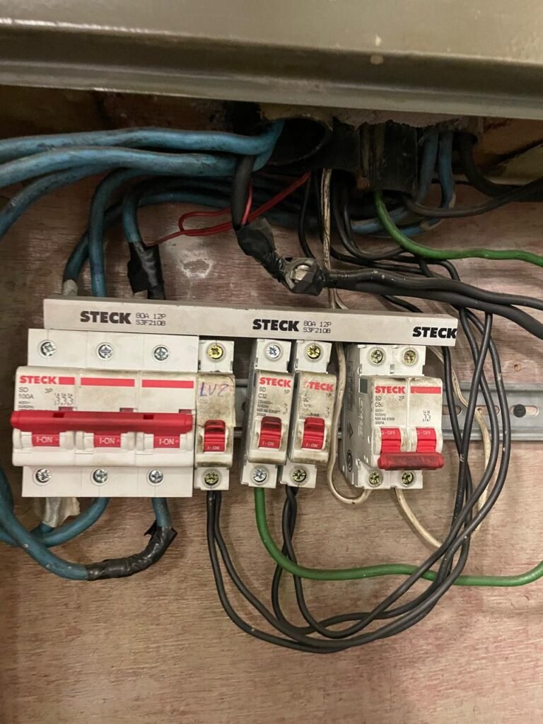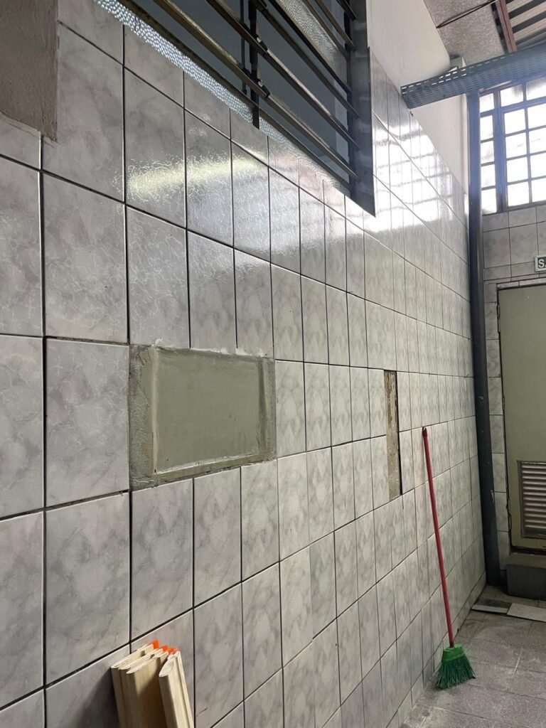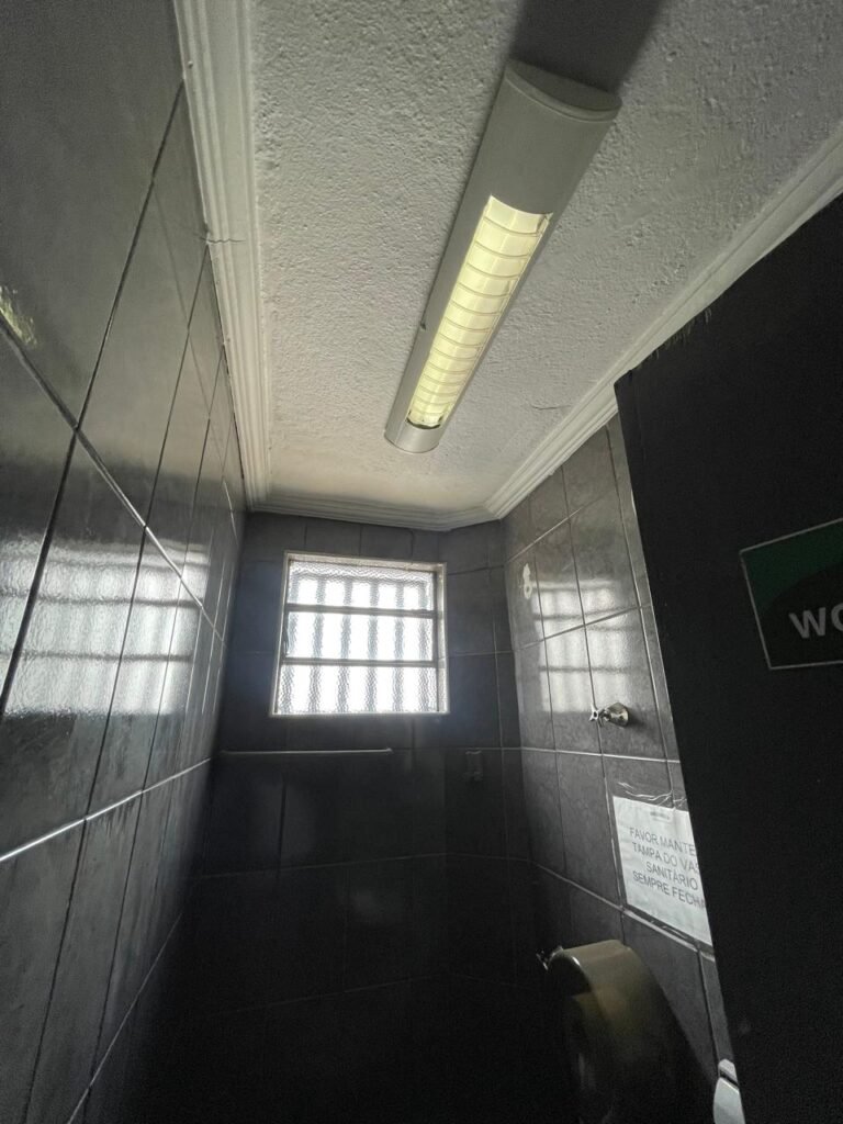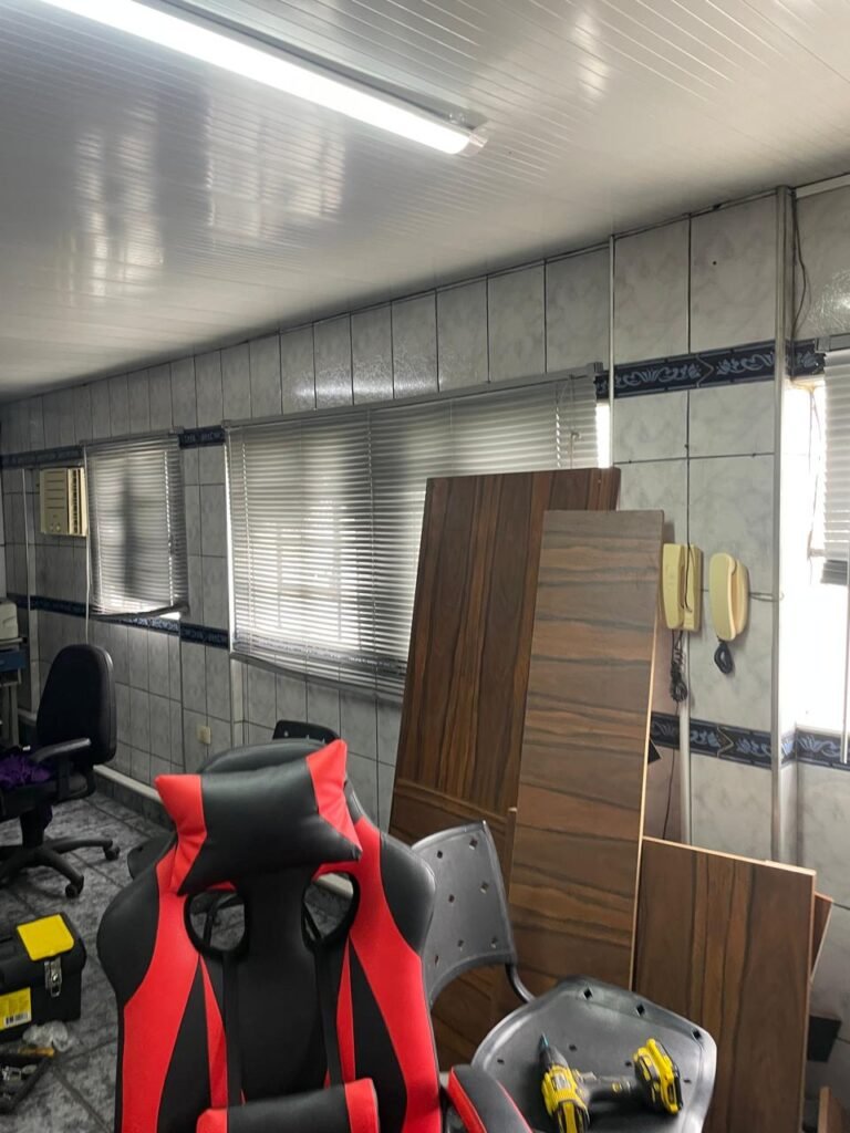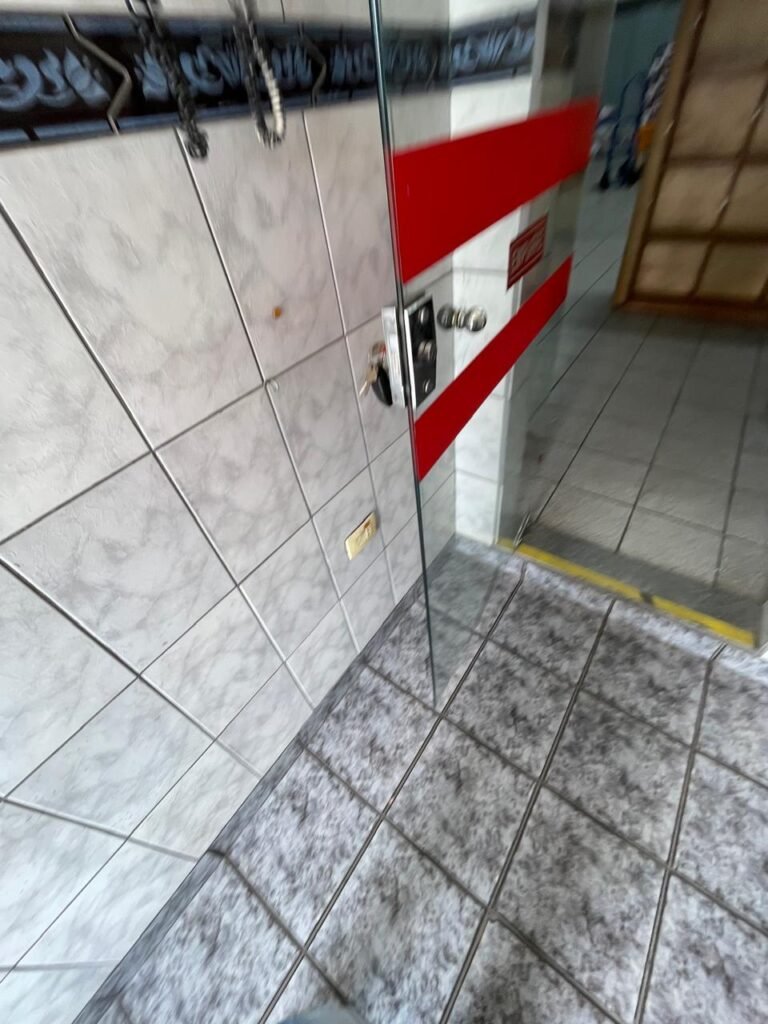 BARRACÃO INTERIOR -: 01 porta social de vidro liso blindex, com 02 puxadores em ordem, 01 fechadura yale em ordem, pisos e rodapés revestidos de frio cerâmico com desgaste natural e restante em ordem, paredes com pintura 1/2 na cor cinza em ordem, faixa de pintura na cor preto em ordem, e restante com pintura na cor branco neve em ordem, , teto com forro de pvc com desgaste natural e buracos por extensão, 16 luminárias tubulares, com 41 lâmpadas florescentes em ordem, 01 luminária de emergência, 02 sensores de presença em ordem, 04 vitrôs basculantes com 18 vidros temperados cada, sendo que 01 deles estão trincados, 01 maçaneta cada, sendo que 01 deles estão faltando. 02 portas sociais de ferro, com 04 fechaduras cada, sendo que 01 delas está com trinco solto, 01 portão de ferro deslizante, com fechadura yale em ordem, com 01 puxador em ordem e com pintura cinza com desgaste natural, 01 porta social de ferro com 02 puxadores em ordem, 02 trincos em ordem e com pintura na cor cinza com desgaste natural, 10 tomadas em ordem, 02 extintores sendo pó químico BC 20B:C 4Kg, 01 caixa de distribuição de disjuntores, com tampa de proteção em ordem, com disjuntores sendo, 01 SD 3P 100A, 02 SD C32 1P, e 01 SD C50 2P. 01 parede divisória de dry wall, 01 porta social de ferro com 02 fechaduras em ordem, 02 puxadores em ordem e com pintura na cor cinza com desgaste natural e restante em ordem, 02 portas de ferro de enrolar, com pintura na cor cinza com desgaste natural, com 04 trincos em ordem cada.
