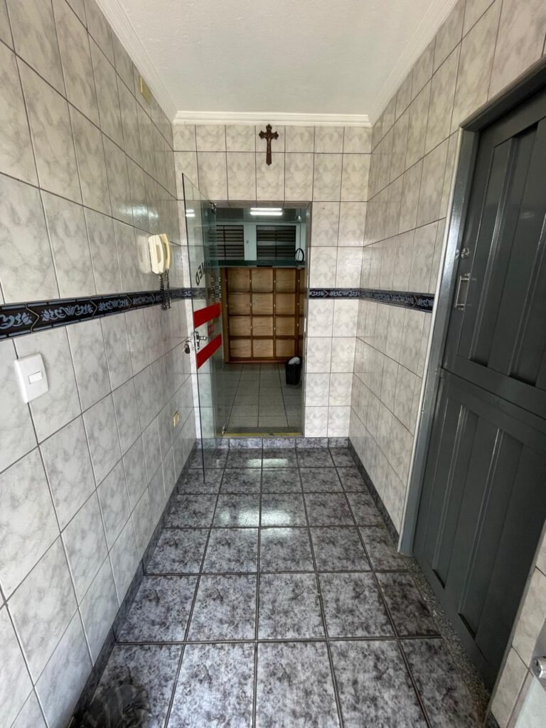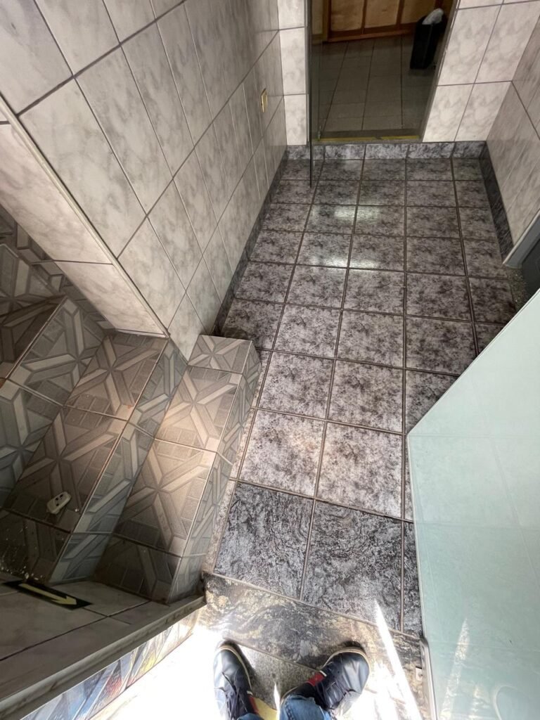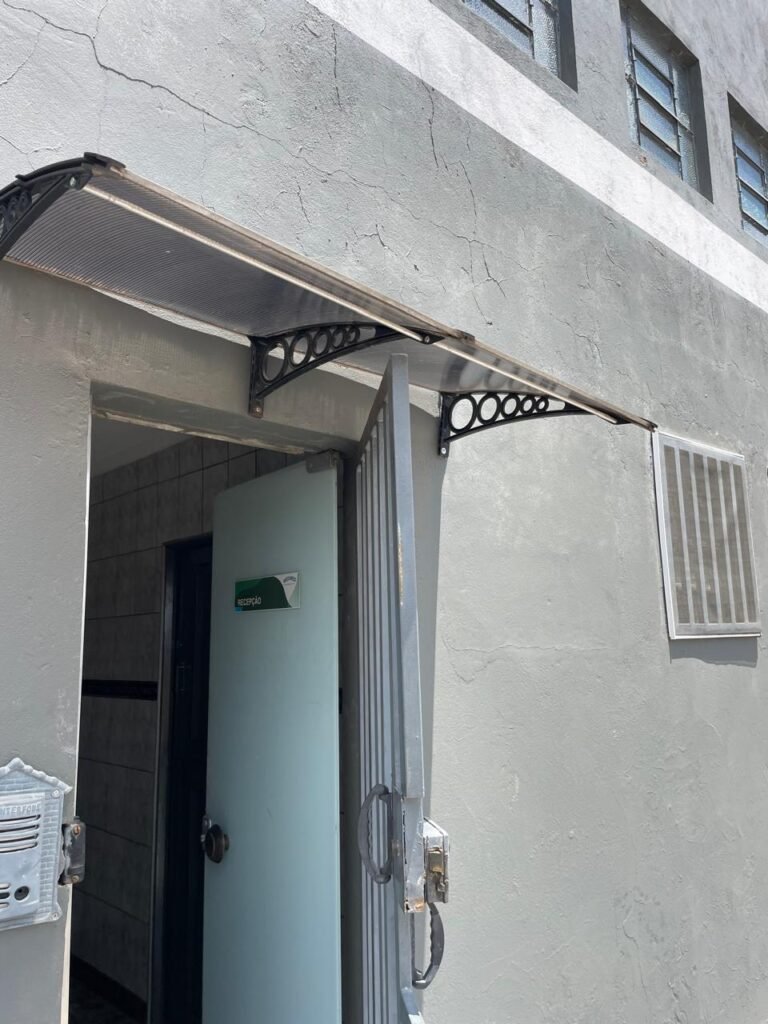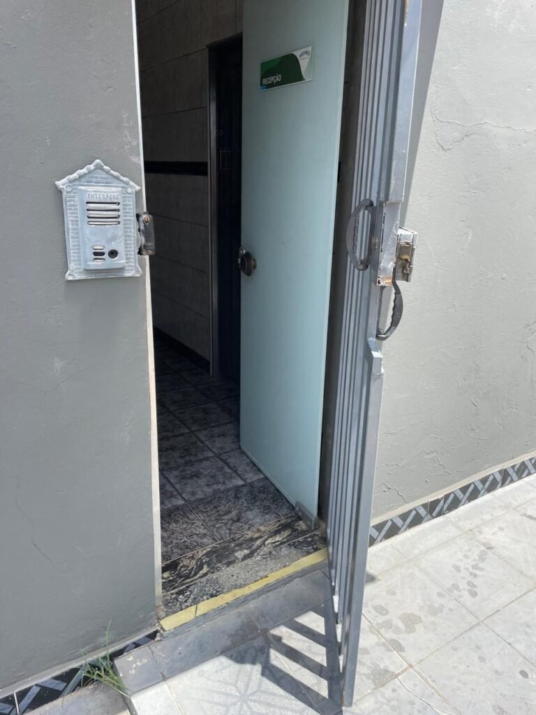 RECEPÇÃO -: 01 porta social em barras de ferro com pintura na cor cinza, com desgastes naturais, 02 puxadores e 01 fechadura start em ordem. 01 porta social de vidro blindex com insulfilme branco, com 02 puxadores em ordem, e com 01 fechadura yale em ordem. Pisos, rodapés e paredes revestidos de pisos frio cerâmico com desgastes naturais e restante em ordem, teto com gola de gesso e com pintura nova na cor branco neve em ordem, 05 espelhos de luz sendo 01 interruptor, 02 espelho cego e 01 tomada com 01 conector de fio de dados, 02 interfones padrão marca HDL, 01 luminária de sobrepor com Led em ordem, 01 sensor de presença em ordem.