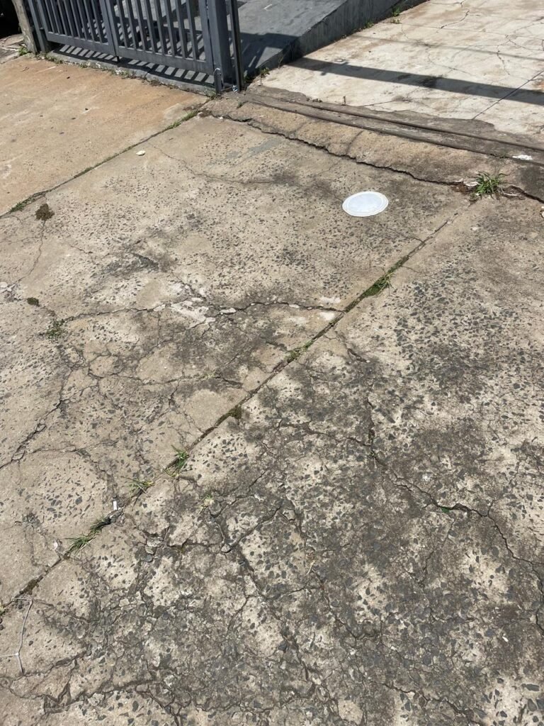 FACHADA-: Calçada de concreto usinado com desgaste natural, rachaduras pela extensão e restante em ordem.