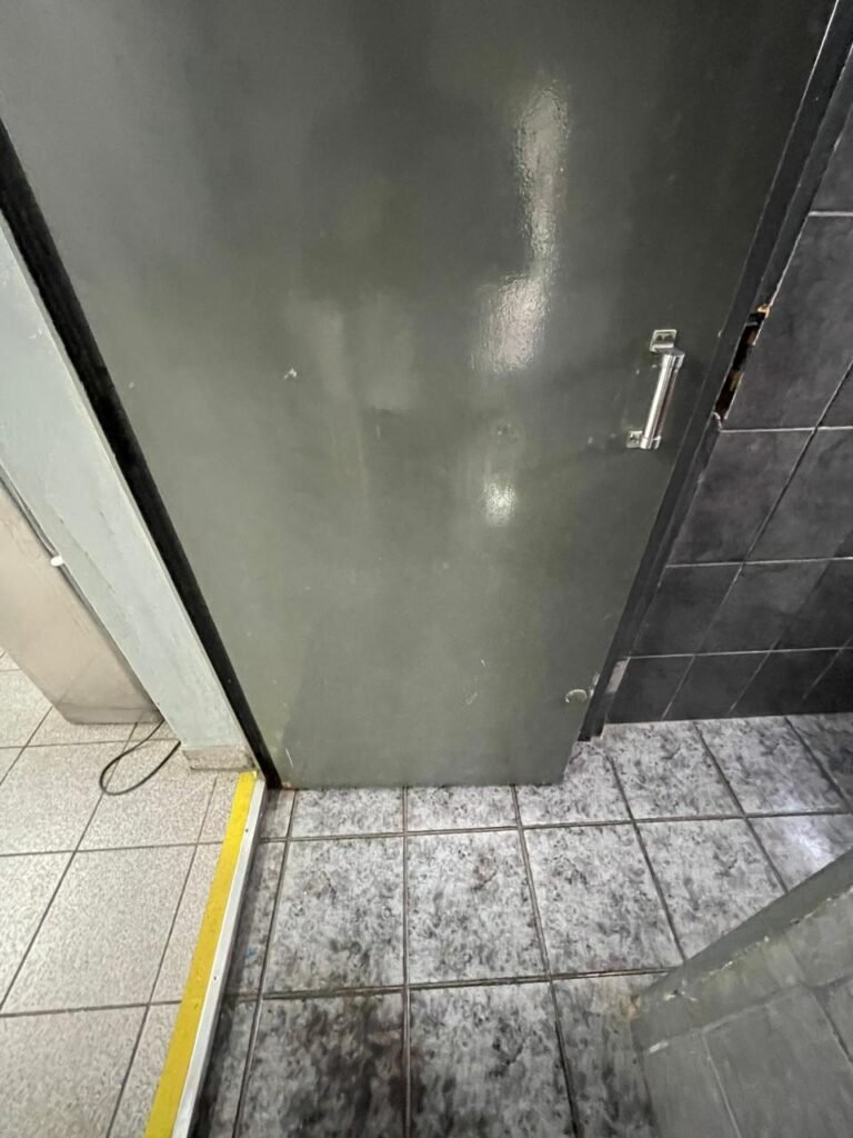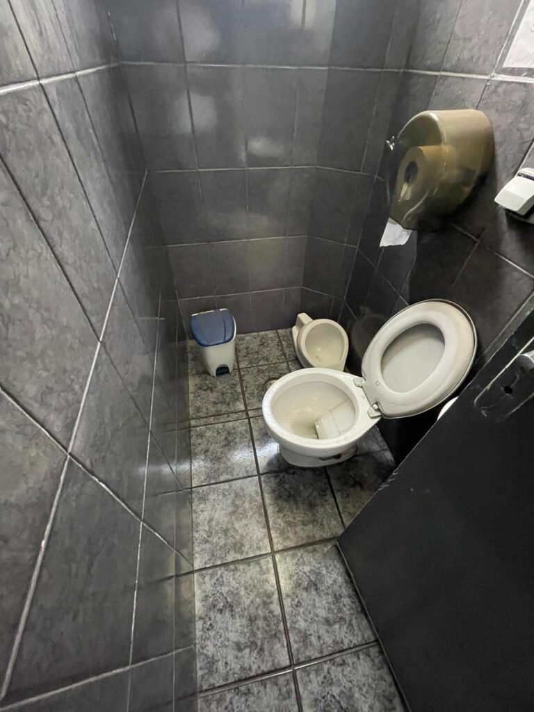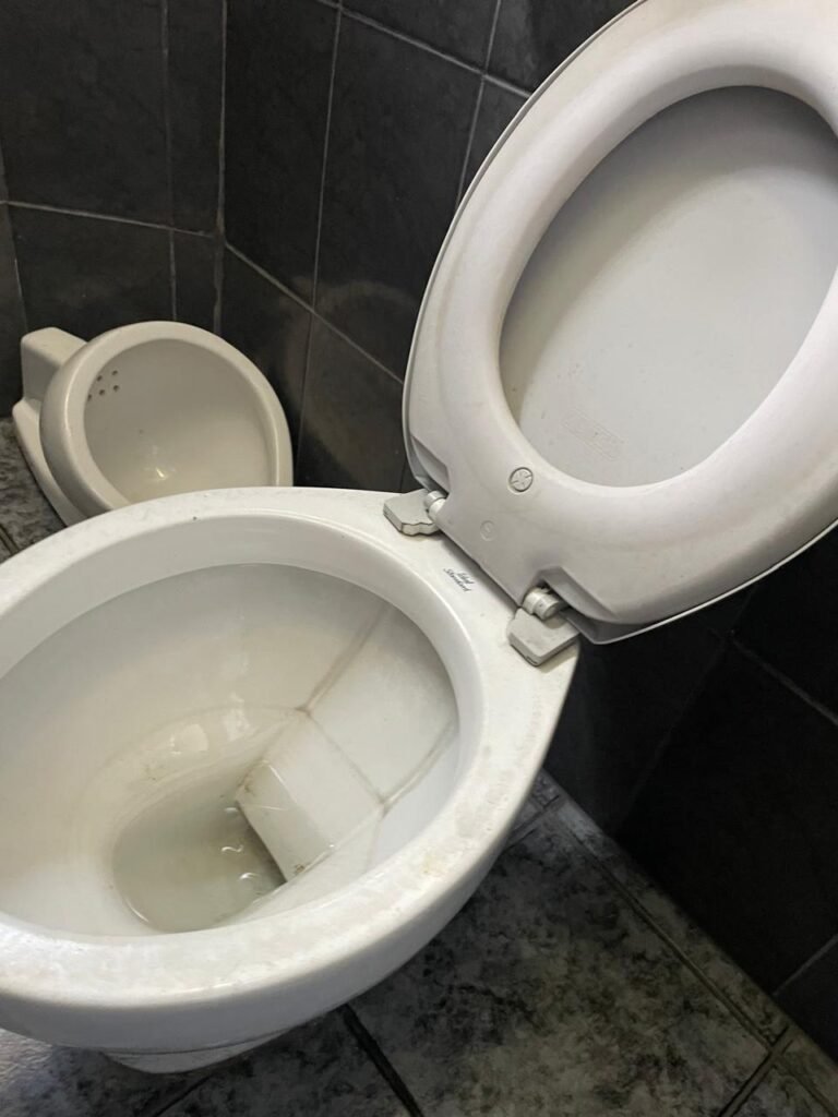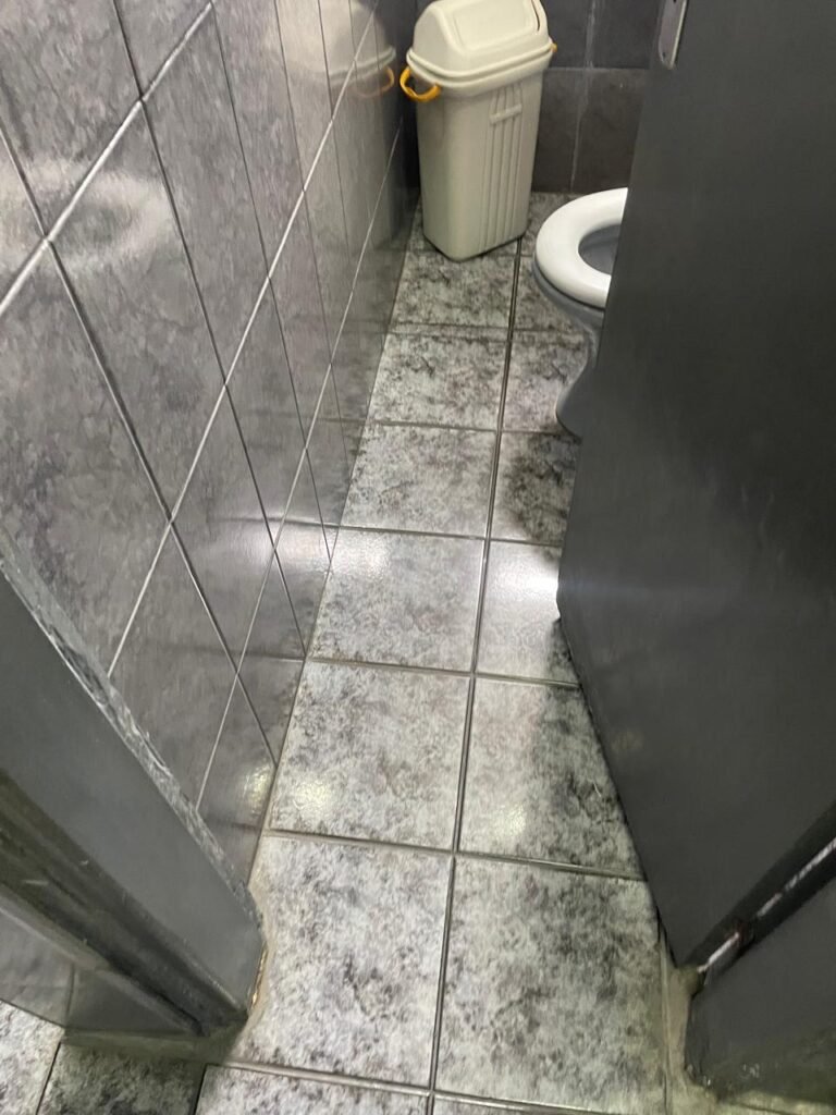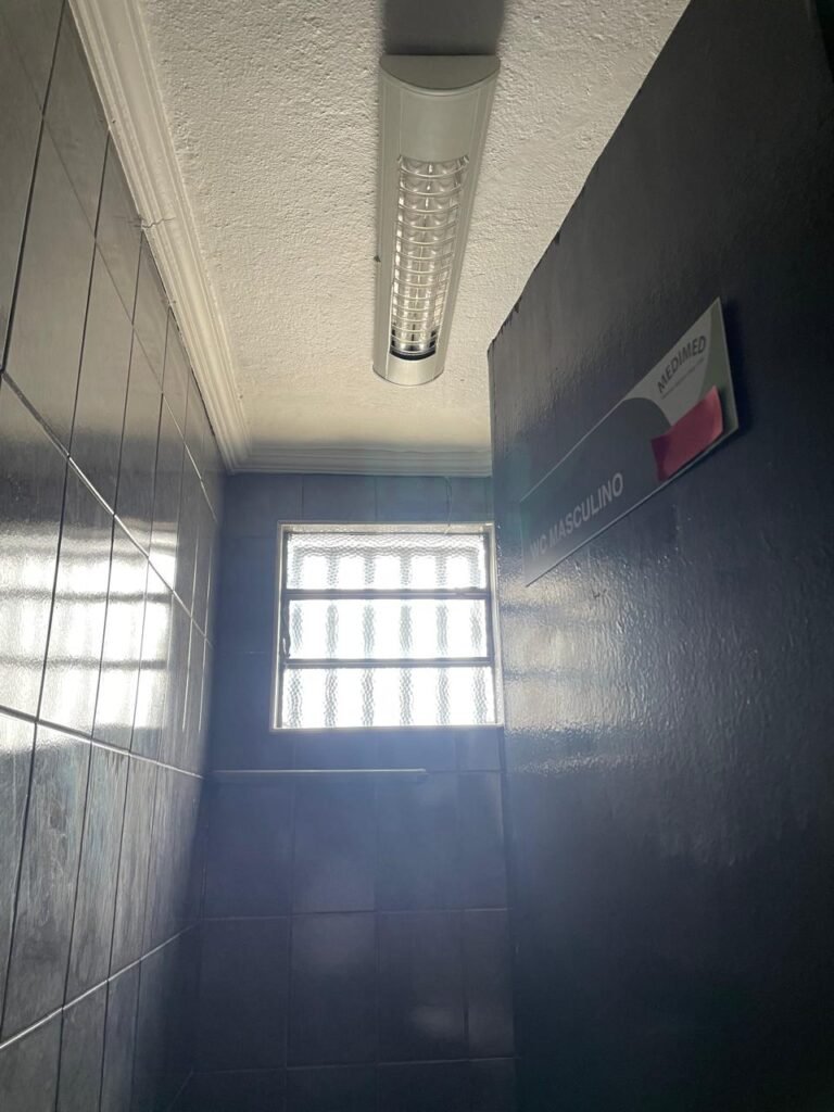 WC 01-:01 porta de madeira com pintura na cor cinza em ordem, 01 maçaneta e fechadura em ordem, piso e paredes revestidas de frio cerâmico em ordem, 01 porta papel higiênico em ordem, 01 conjunto sanitário na cor branco com acento em ordem, 01 mictório não instalado, 01 lâmpada led com acabamento em ordem, sendo que apenas 01 lâmpada está em ordem, 01 vitrô com esquadrias de ferro com pintura na cor cinza em ordem, 03 vidros com textura em ordem, 01 ralo em ordem, 01 descarga em ordem.