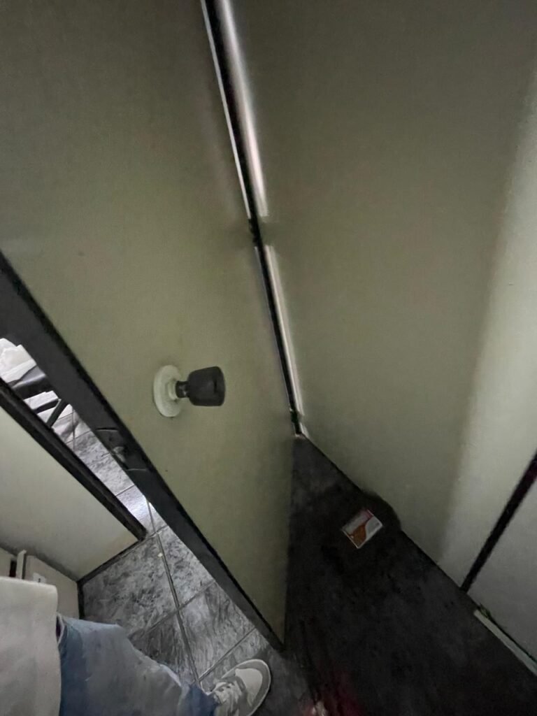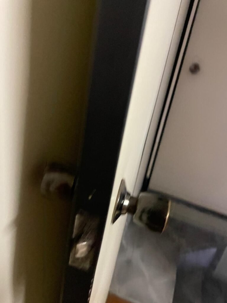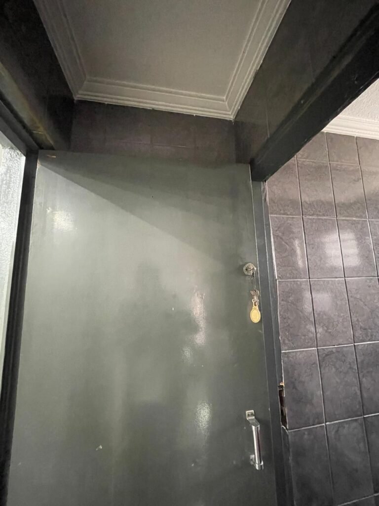 HALL BANHEIRO-:01 Porta de madeira com pintura na cor cinza em ordem, 02 puxadores em ordem, 02 fechaduras tipo tetra sendo que apenas 01 tem miolo e chaves em ordem.