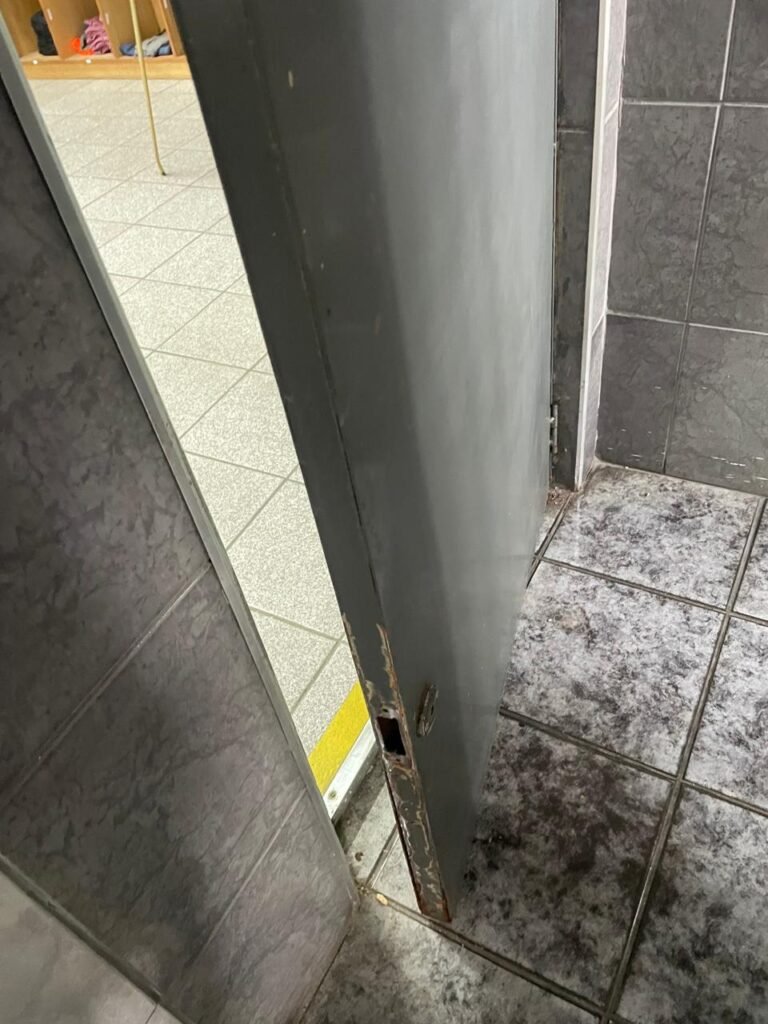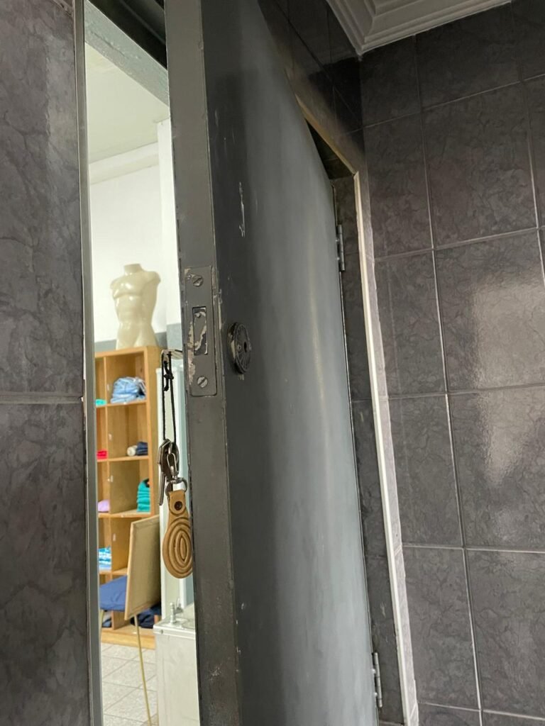 VESTIÁRIO -: 01 porta de ferro com 02 puxadores em ordem com acabamento branco em ordem, piso e paredes revestidas de pisos frio cerâmicos com alguns trincos e restante em ordem teto com pintura na cor branco neve em ordem, 01 lâmpada Led em ordem, 01 Led retangular em ordem, 01 cabo de inox em ordem, 01 vitrô basculante com 03 vidros e um puxador em ordem, 01 tanque de cerâmica com pintura na cor cinza com desgaste natural, com 01 torneira de inox em ordem, 01 armário com espelho com desgaste natural, banheiro 01 porta de madeira com pintura na cor cinza com desgaste natural com feno na base, maçanetas de inox com desgaste natural, e chave embutida com acabamento danificado, pisos e paredes revestidas de pisos frios cerâmicos com desgaste natural e restante em ordem 01 vitro com maçaneta em ordem e com 03 vidros blindex sendo que um deles está trincado, 01 conjunto sanitário com vaso de cerâmica e acento e tampa nas cores cinza em ordem, com descarga em ordem, 01 ralo de inox cor pigmentos de ferrugem restante em ordem, 01 pia com coluna de cerâmica na cor cinza claro com 01 sifão embutido em ordem, 01 torneira bica móvel de inox em ordem, 01 suporte de papel higiênico de plástico em ordem, 01 cano de inox com desgaste natural, 01 cano do registro de inox com desgaste natural, 01 interruptor, 01 lâmpada Led em ordem.