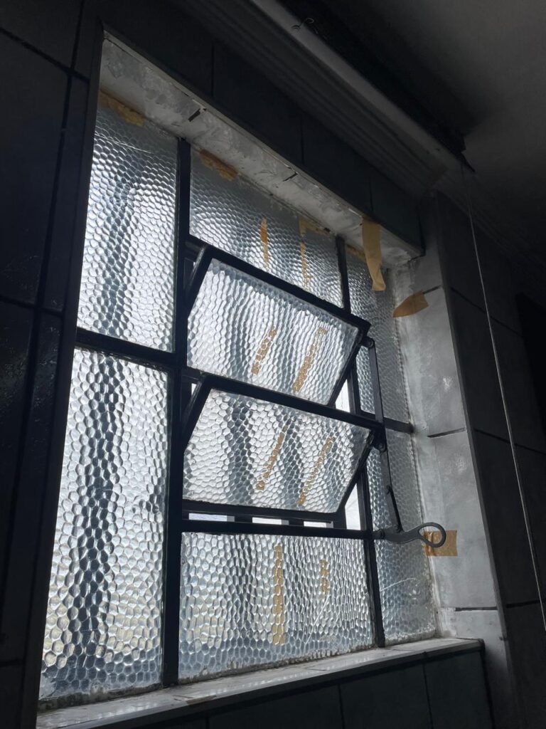 SALA 01- 01 Porta holandesa de ferro com pintura na cor cinza em ordem, 01 puxador de ferro em ordem, 01 fechadura não testada, paredes e pisos revestidos de frio cerâmico em ordem, 01 portinha de ferro com pintura na cor cinza em ordem, 01 trinco fecho chato em ordem, 01 bancada revestida de ardósia em ordem, 01 armário de concreto com 02 portas de acrílico com esquadrias de ferro em ordem, 04 espelhos de luz sendo que 03 tem 02 tomadas e o outro com 01 tomada e 01 interruptor, 01 interfone não testado, 01 vitrô com esquadrias de ferro com pintura na cor cinza e com 08 vidros texturizados em ordem, 01 armário com portas de esquadrias de ferro e com acrílico na porta em ordem, 01 luminária led tubular com acabamento em ordem e apenas 01 das lâmpadas led em ordem.