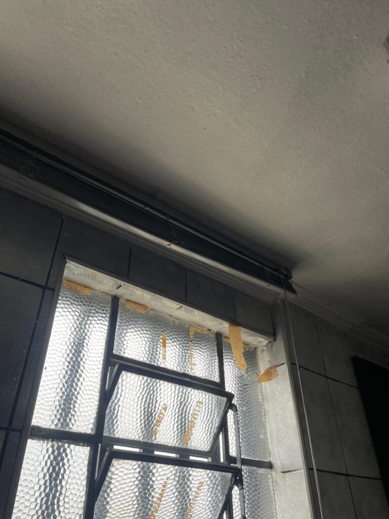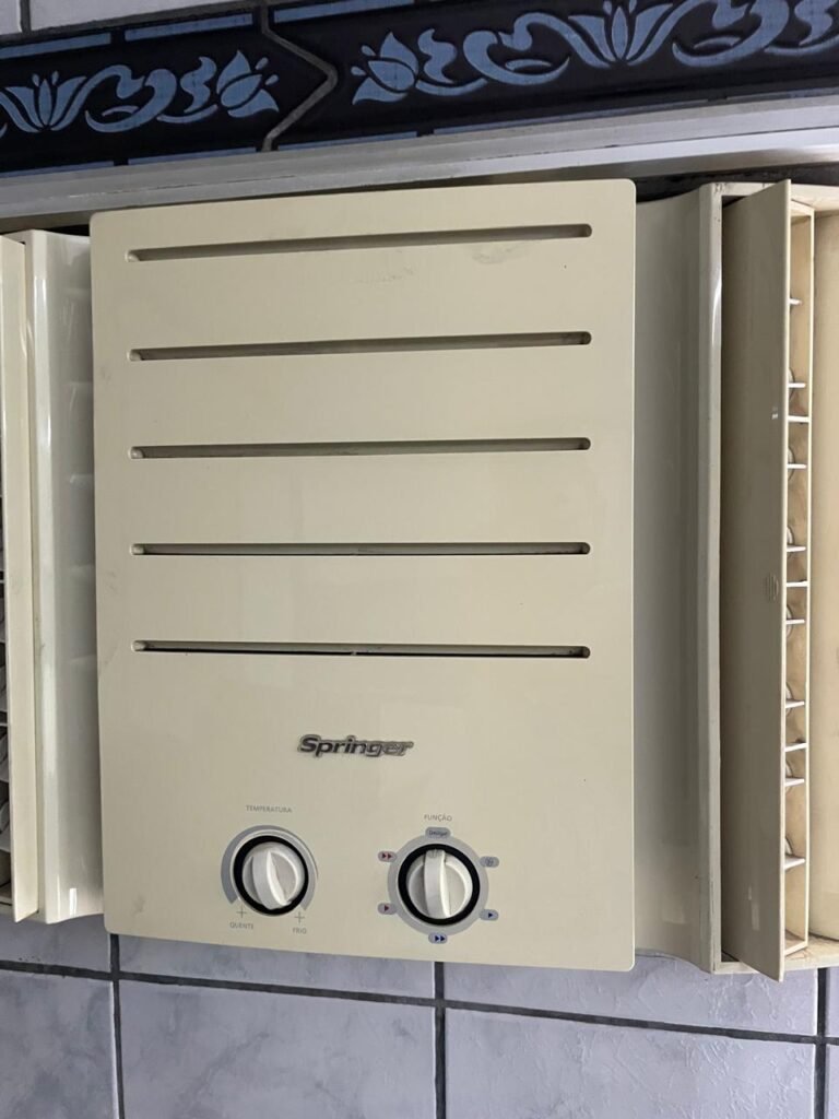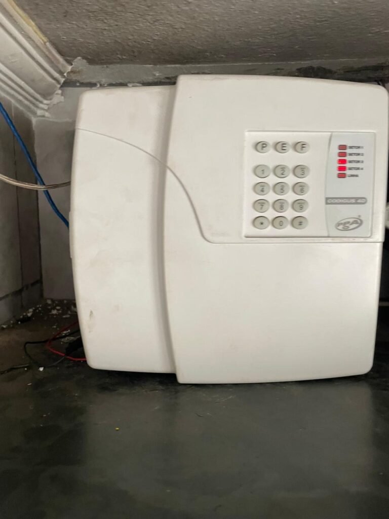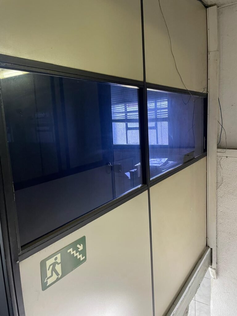 SALA SUPERIOR 02-: 01 Caixa de alarme não testada, 01 porta com maçaneta em ordem, piso revestido de frio cerâmico em ordem, 04 vidros fixz blindex com insufilm em ordem 02 vitrôs com 08 vidros texturizados sendo que 01 dos vitrôs está com 0 vidro quebrado e restante em ordem, 02 persianas não testadas, 01 ar-condicionado Springer não testado, 01 espelho de luz com 01 interruptor e 01 tomada, 01 espelho de luz com 02 tomadas, 01 caixa de cerca elétrica não testada.