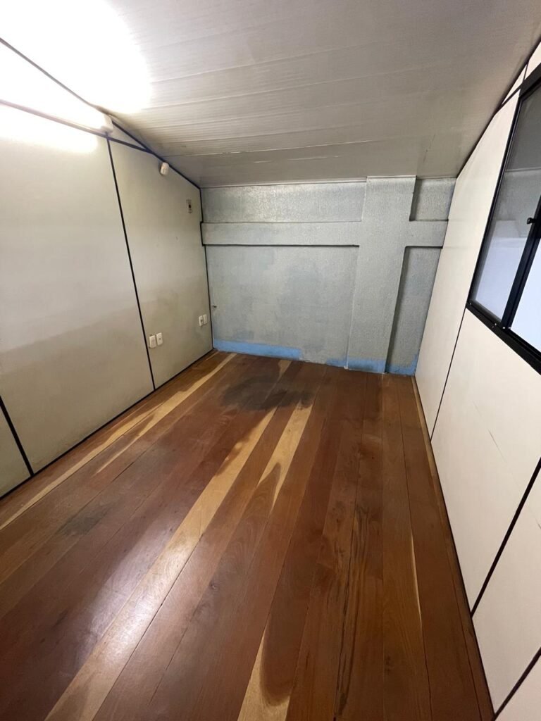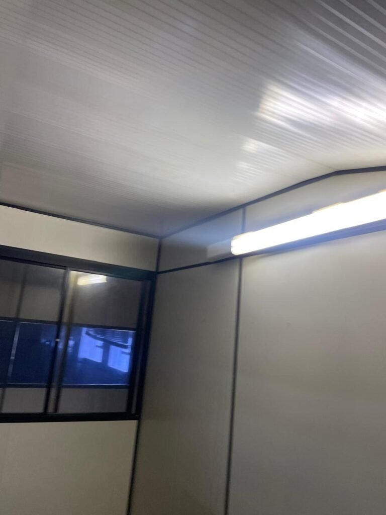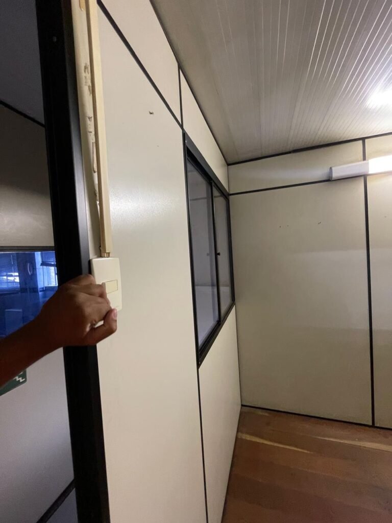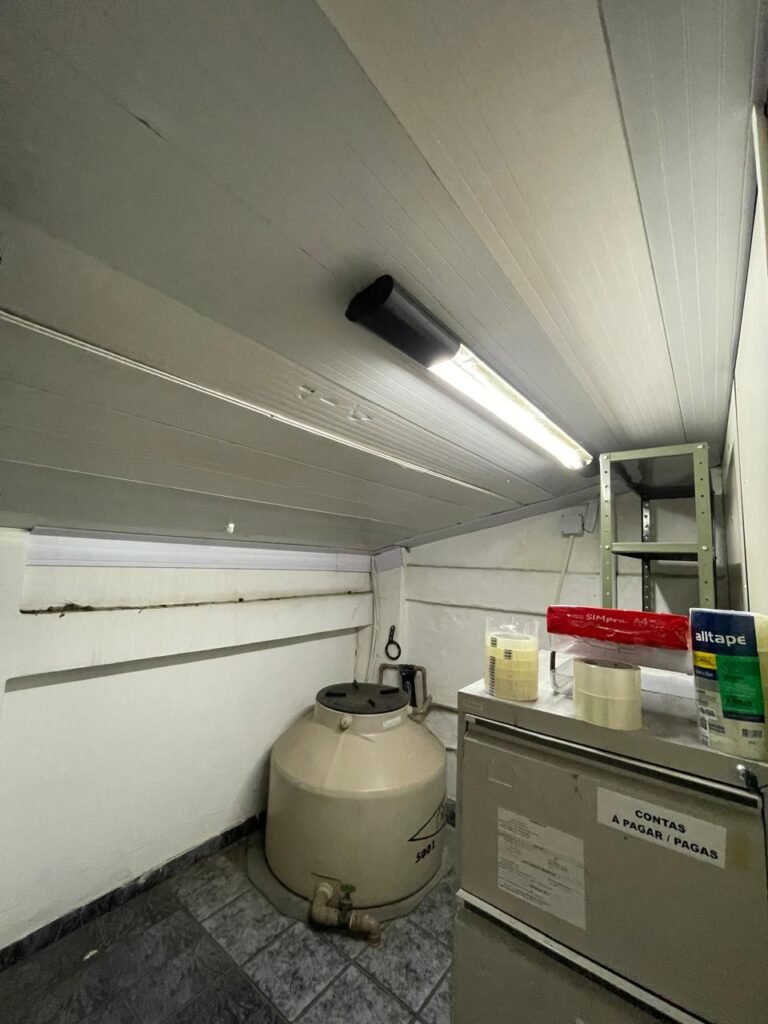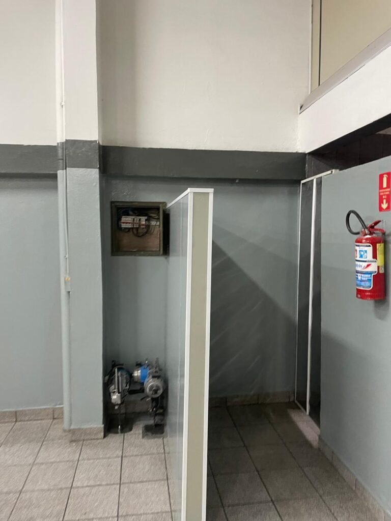 SALA SUPERIOR 3-: 01 Porta de divisória com maçaneta em ordem, 01 lâmpada led com acabamento e lâmpadas em ordem, piso revestido de frio cerâmico, paredes com pintura na cor branco , 01 caixa d’água de 500l em ordem, 01 extintor de pó em ordem.