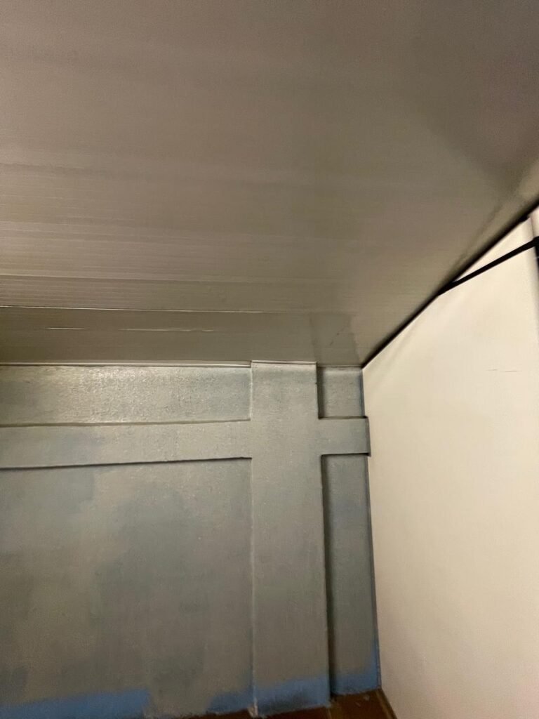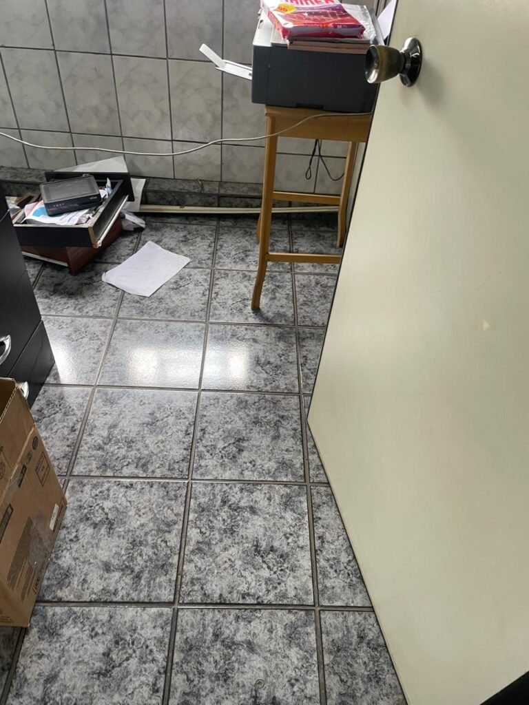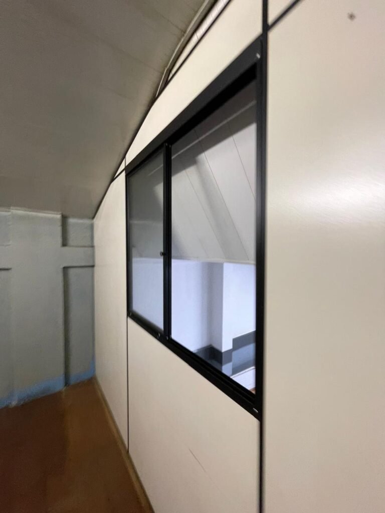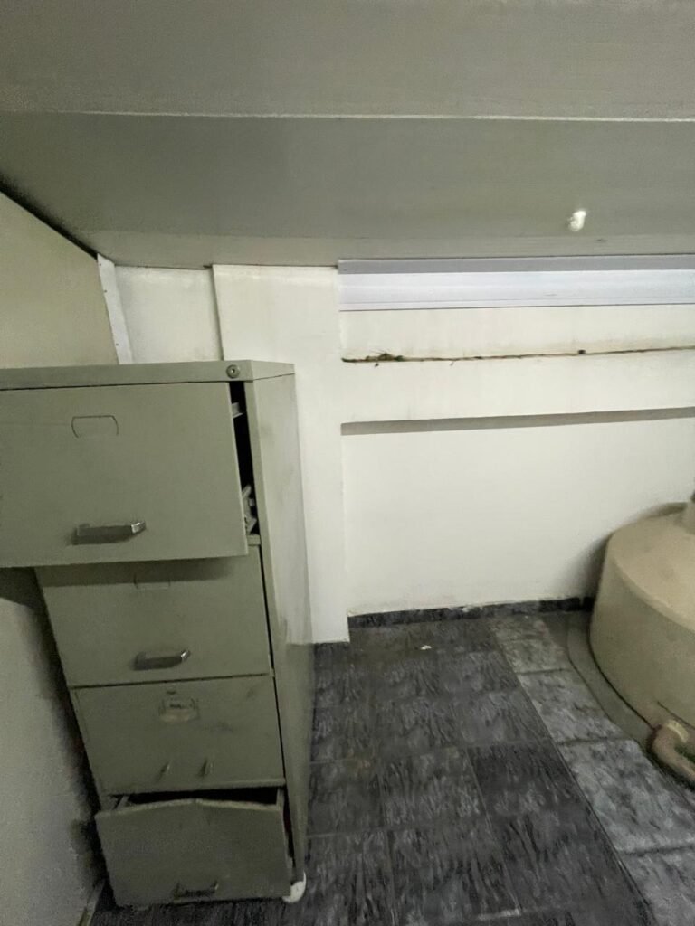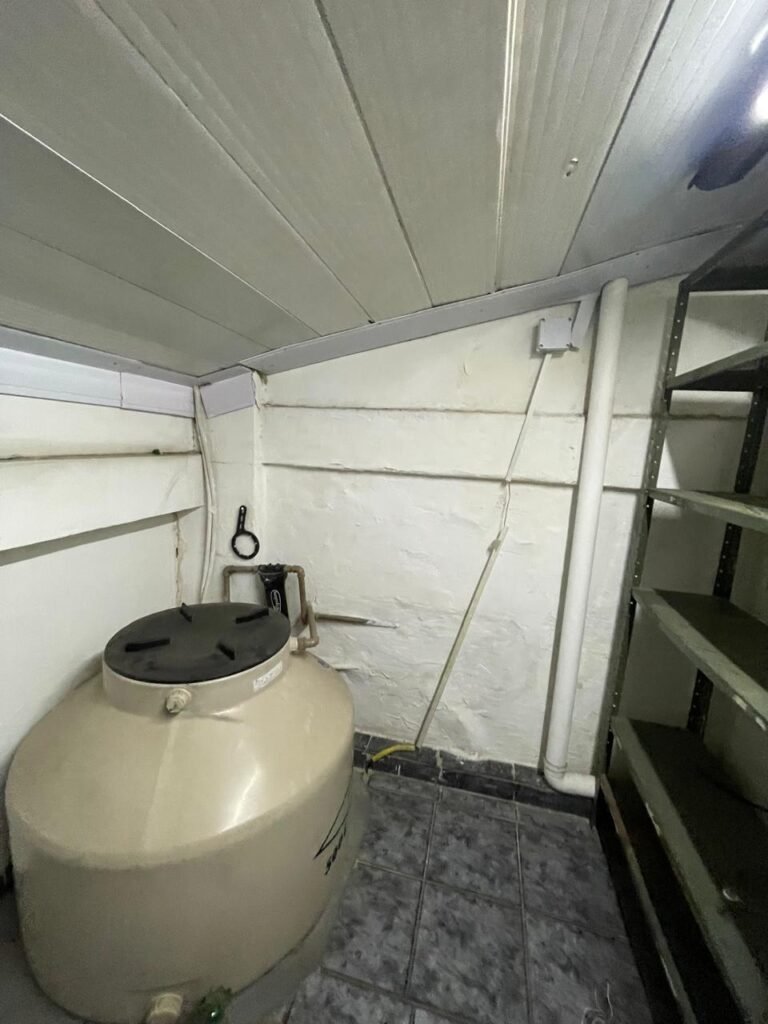 SALA SUPERIOR 3-: 01 Porta de divisória com maçaneta em ordem, 01 lâmpada led com acabamento e lâmpadas em ordem, piso revestido de frio cerâmico, paredes com pintura na cor branco , 01 caixa d’água de 500l em ordem, 01 extintor de pó em ordem.