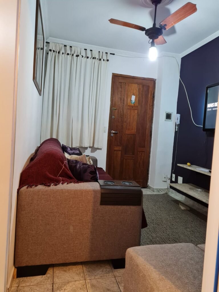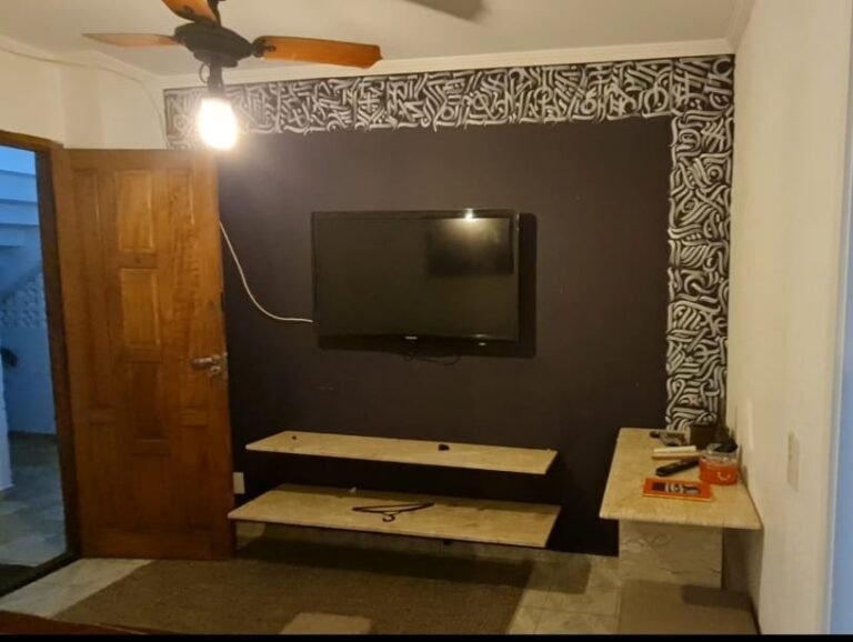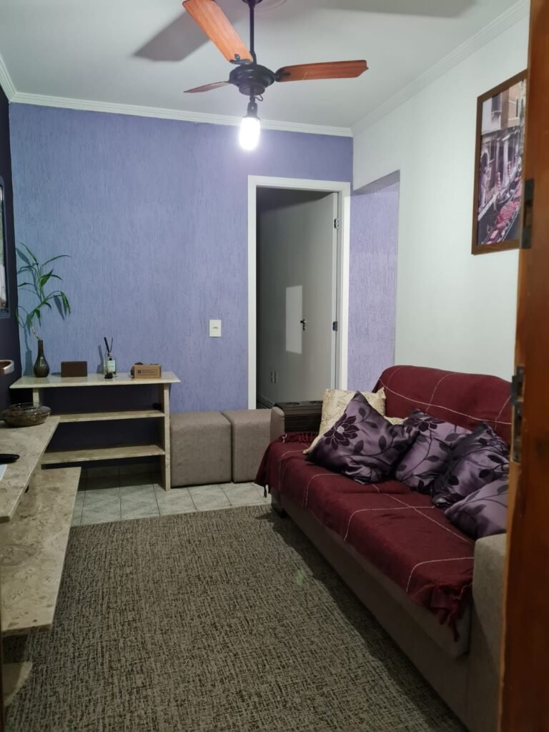 Sala:- Piso frio cerâmico mesclado com desgaste natural do tempo restante em ordem, rodapés com desgaste natural do tempo restante em ordem, soleira granito São Gabriel em ordem, porta de madeira maciça com guarnição em ordem, maçanetas em ordem, fechadura e chaves tetra e yale em ordem, parede com a pintura na cor cardo uva escurecido com pigmento preto e azul tinta Coral látex fosco, com desenhos na cor branco em ordem, parede com grafiato com a pintura na cor branco nova em ordem, parede na cor branco neve Coral em ordem, teto e gola de gesso com pintura nova na cor branco neve Coral em ordem, 01 ventilador de teto com lâmpada fria em ordem, 01 janela de alumínio de correr com duas folhas de vidro em ordem, 01 varão de cortina na cor mogno em ordem, 01 interfone intelbrás em ordem, 01 interruptor em ordem, 01 espelho de luz em ordem, 02 tomadas de energia e 02 espelhos em ordem.