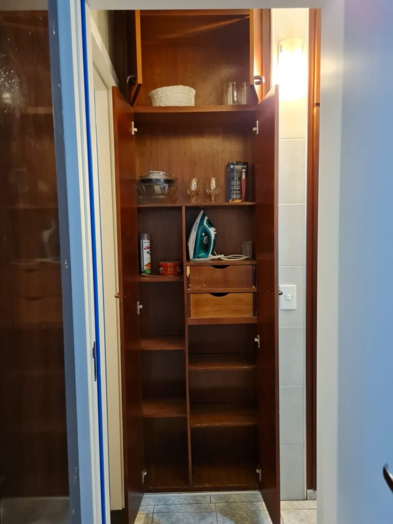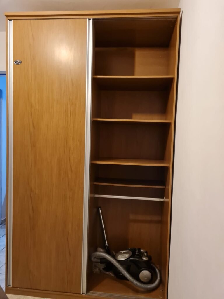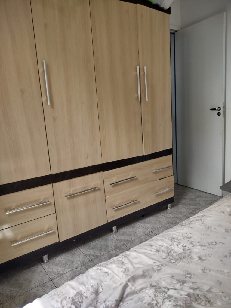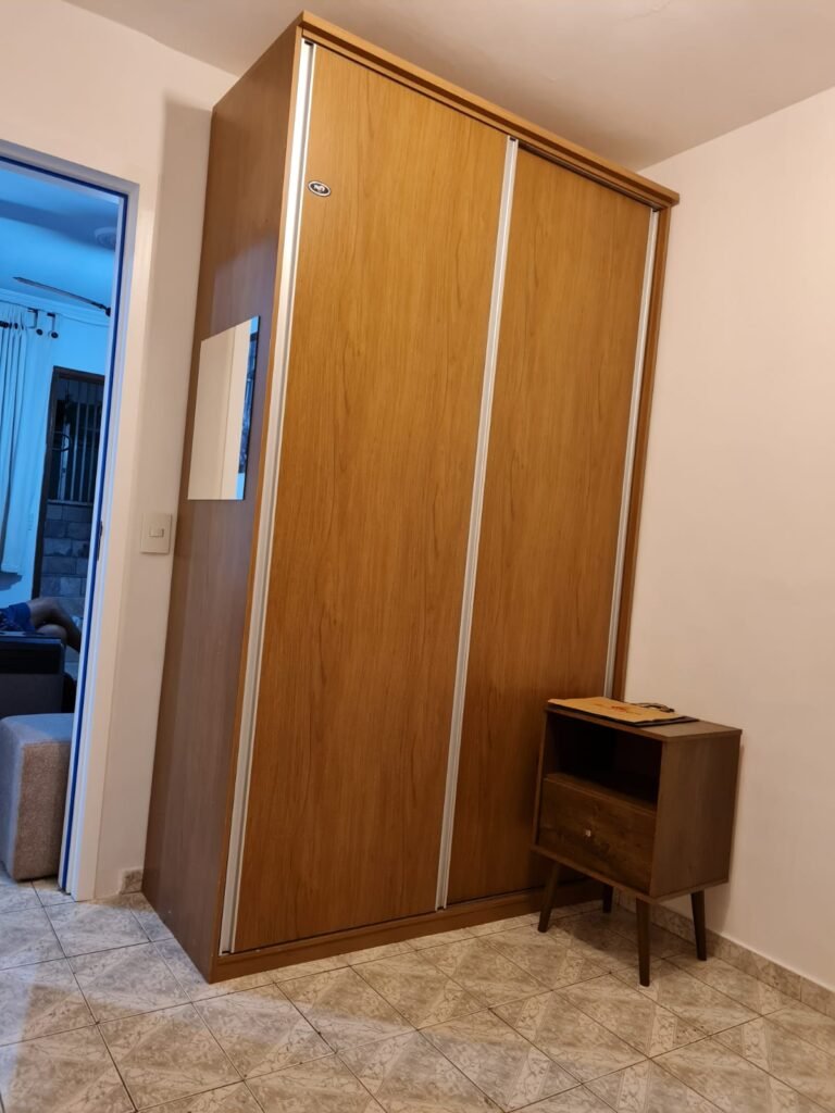 Mobília Quarto:- 01 armário embutido MDF na cor caramelo com duas portas de correr enroscando restante em ordem, 06 prateleiras sendo 01 com lascado restante em ordem, 01 porta calcas em ordem, 04 gavetas de corrediças em ordem, 01 criado mudo de madeira MDF na cor caramelo com 01 gaveta em ordem, 01 espelho na lateral do guarda roupas em ordem.