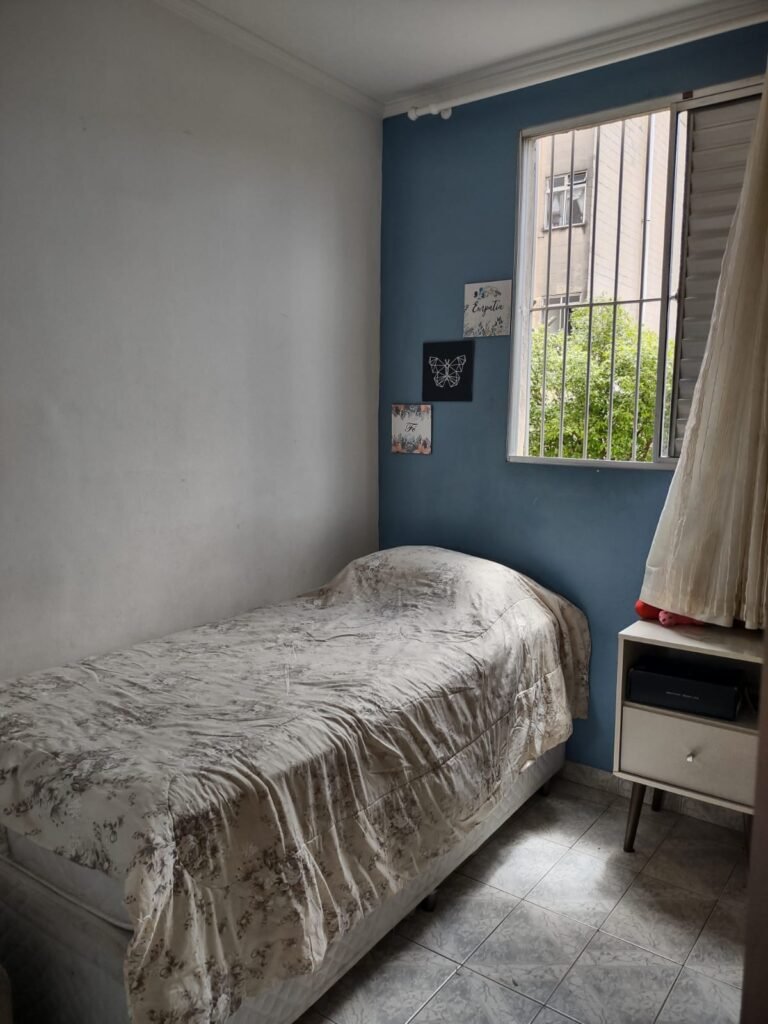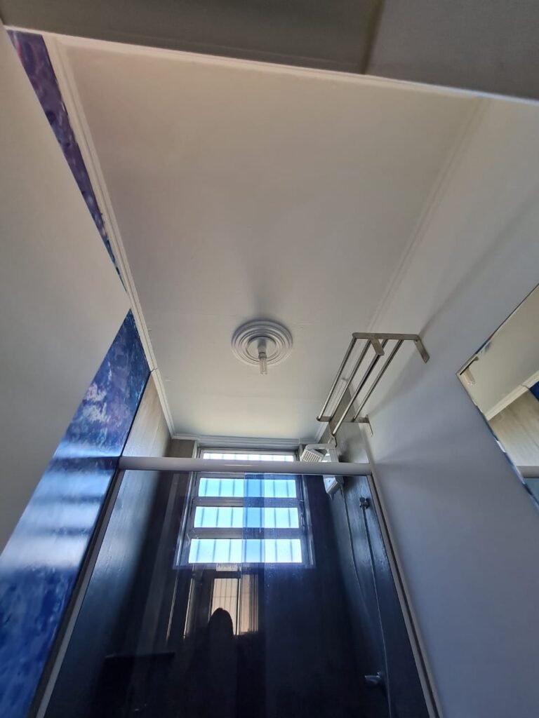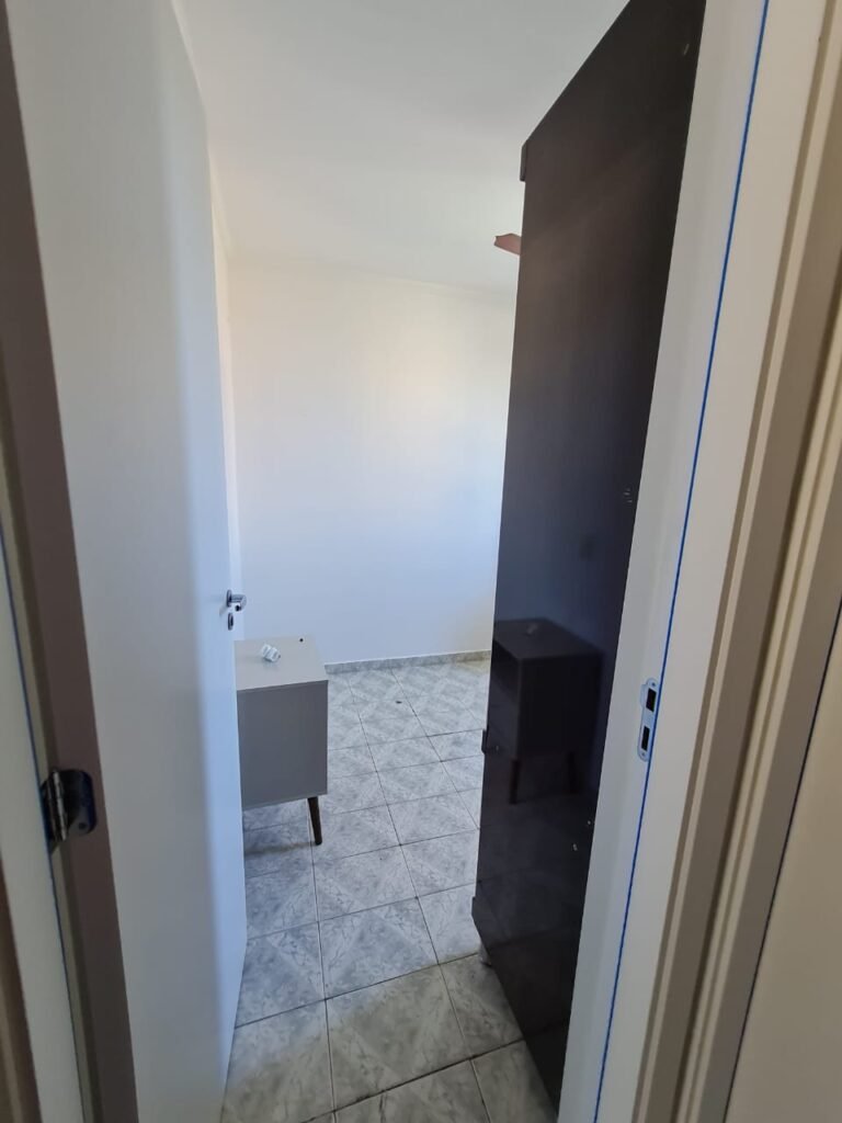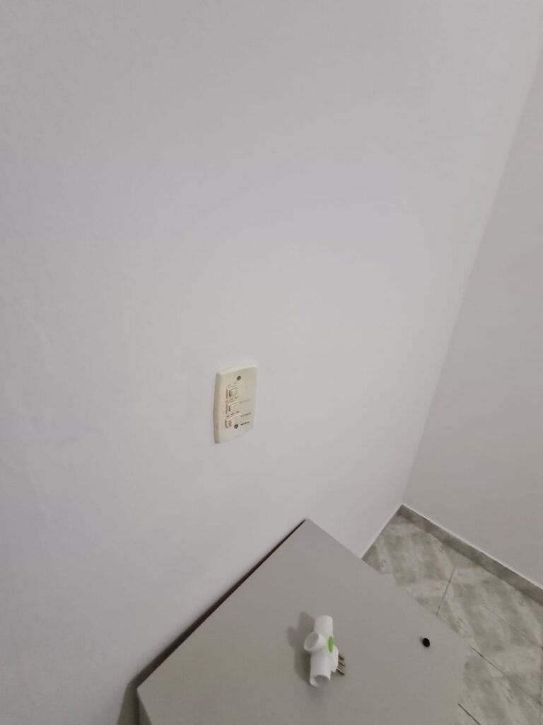 Quarto:- Piso frio cerâmico mesclado com desgaste natural do tempo restante em ordem, rodapé em ordem, porta de madeira concremwood 75 cm MDF na cor branco com guarnição nova em ordem, fixador para travar a porta na parede de plástico em ordem, paredes com pintura nova na cor branco neve Coral em ordem, 01 parede com pintura nova na cor azul inverno fosco Coral em ordem, teto com a pintura nova na cor branco neve Coral em ordem, golas de gesso com pintura na cor branco neve em ordem, 01 janela de alumínio de correr com 01 folha de vidro em ordem, 01 ventilador de teto com 01 lâmpada fluorescente em ordem, 01 interruptor para ventilador e lâmpada e ordem, 02 interruptores de energia com espelho em ordem.