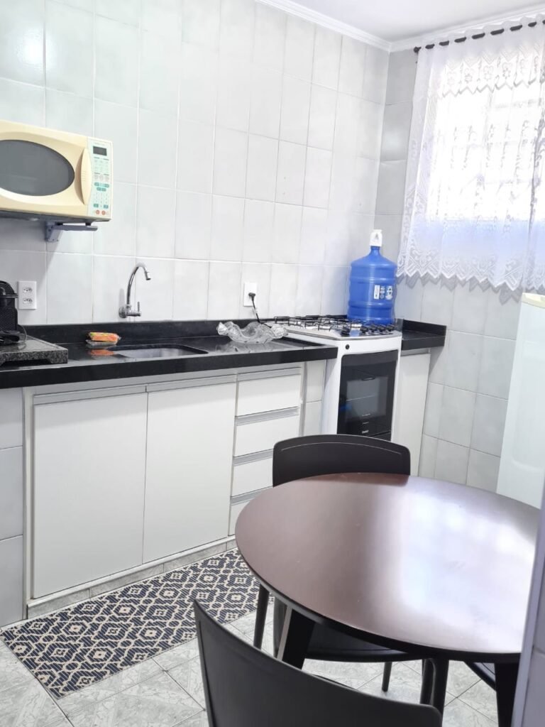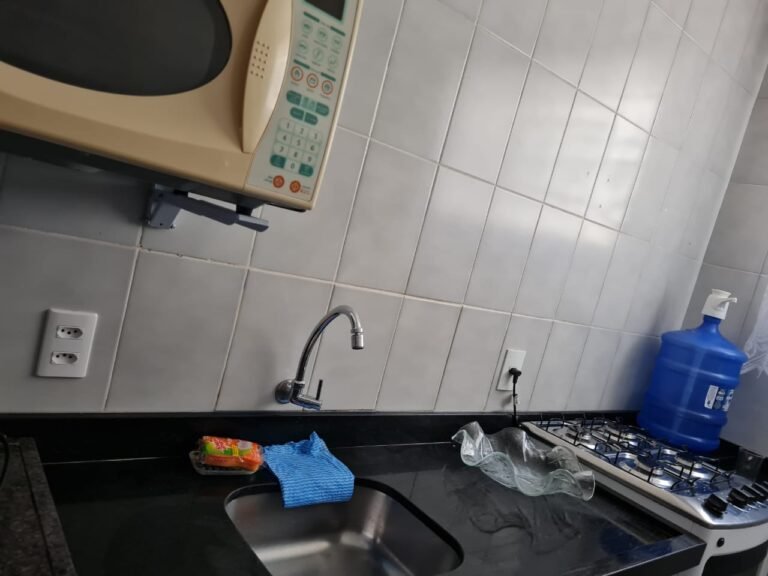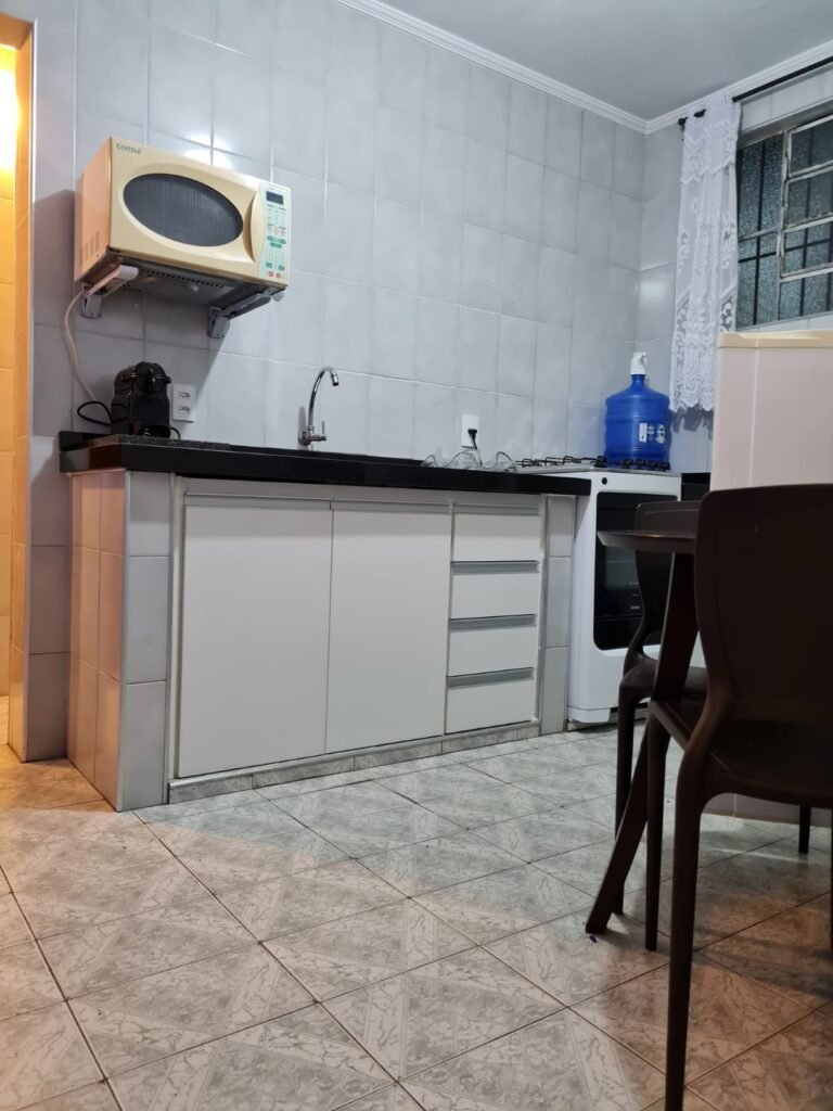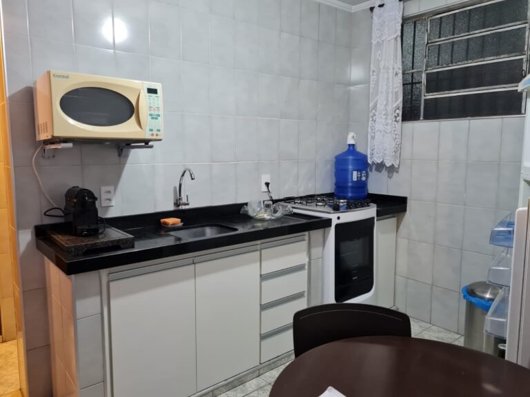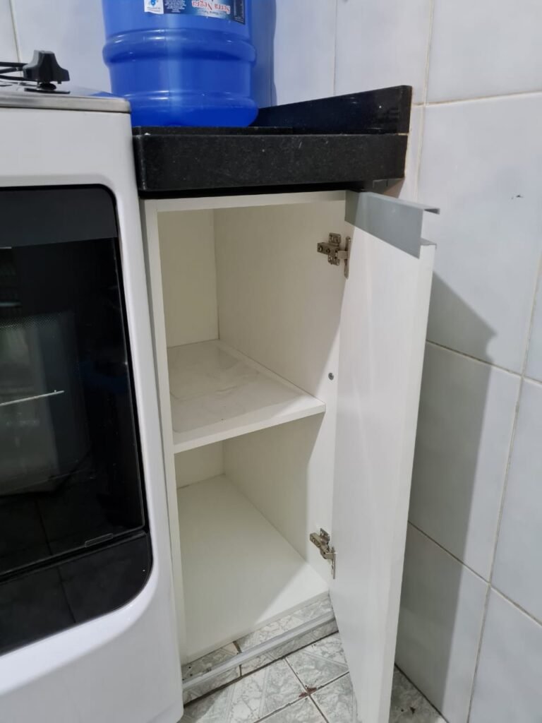 Cozinha:- Piso frio cerâmico mesclado com desgaste natural do tempo restante em ordem, paredes com revestimento cinza cerâmico com desgaste natural do tempo contento 10 furos com bucha restante em ordem, 01 peca azulejo lascado próximo a janela restante em ordem, 01 parede com grafiato com a pintura na nova na cor lavanda Coral fosco em ordem, 01 pia em granito São Gabriel com desgaste natural do tempo o restante em ordem, cuba de inox em ordem, 01 torneira bica móvel em ordem, 01 armário embutido de MDF 18 cm em ordem, 03 portas com 06 dobradiças pneumáticas em ordem, 07 puxadores alumínio em ordem, 04 gavetas com roldanas corrediças em ordem, 02 prateleiras sendo 01 removível em ordem, 01 botijão de gás 13kg em uso com registro e mangueira em ordem, teto com pintura na cor branco neve em ordem, gola de gesso faltando meia parede restante em ordem, gola de gesso em volta da lâmpada em ordem, 01 spot com 01 lâmpada fluorescente compacta em ordem, 01 janela de ferro com desgaste natural do tempo restante em ordem, 08 vidros em ordem, 01 interruptor em ordem, 05 tomadas de energia em ordem,06 espelhos de luz em ordem.