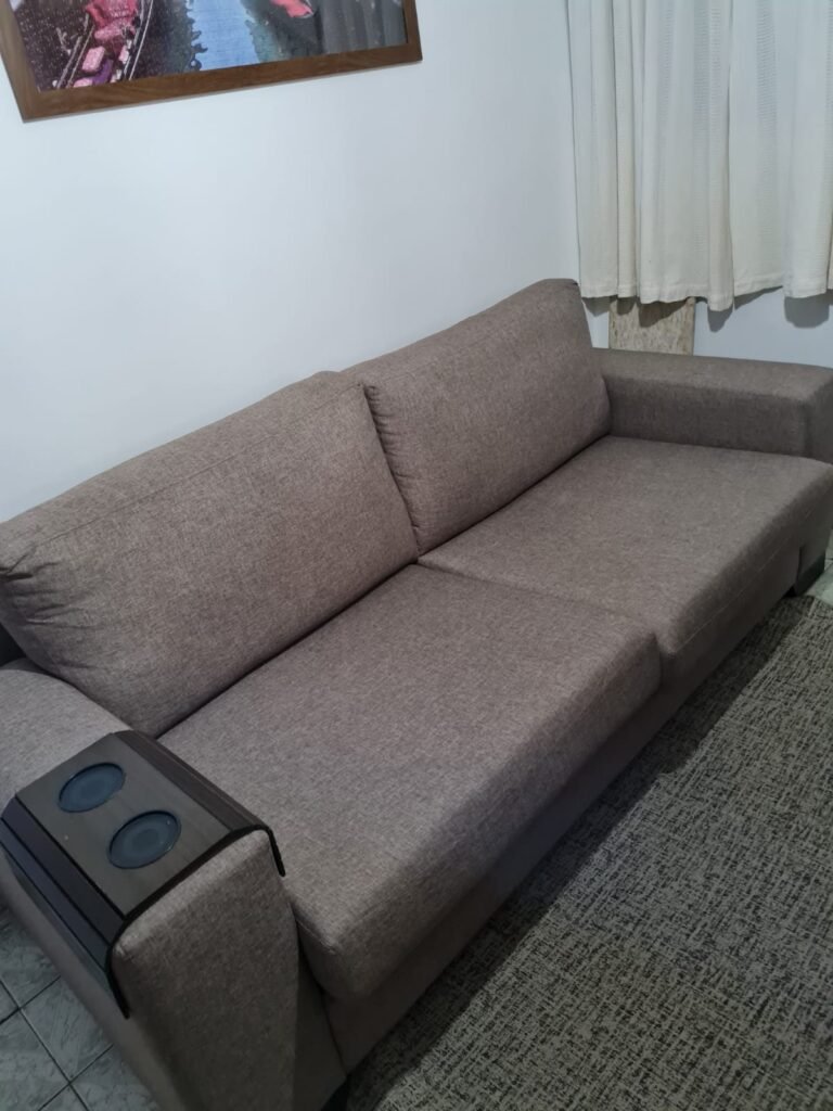 Mobília sala:- 01 sofá dois lugares em linho reformado em ordem, 02 pufes em linho novos em ordem, 01 rack móvel com duas prateleiras de tampão removível em granito Travertino em ordem, 01 rack embutido com duas prateleiras de granito Travertino em ordem, 01 tapete Home Tech Marrom 2,00 x 1,50m e ordem.
