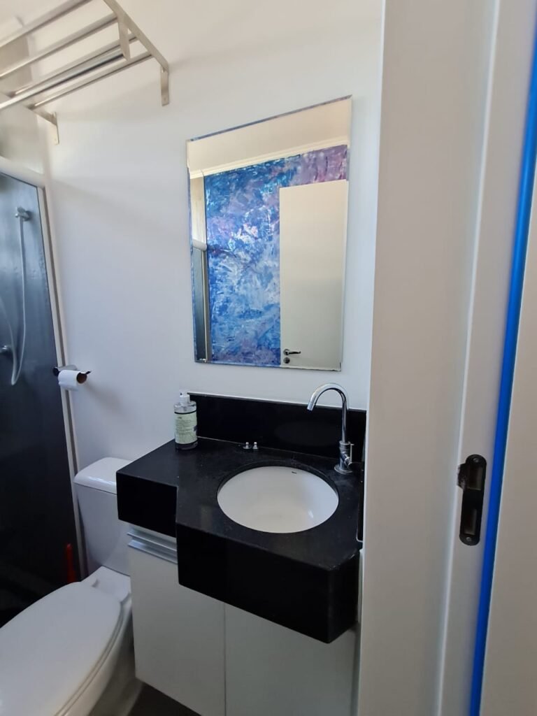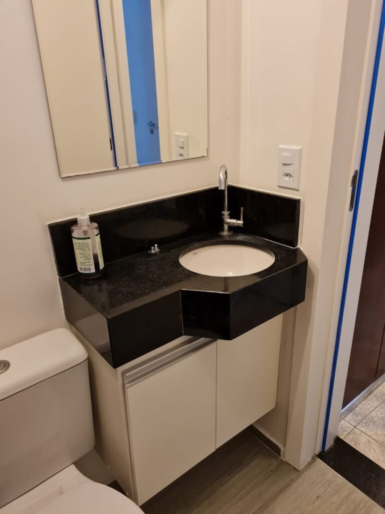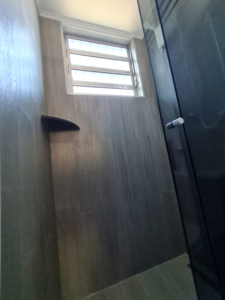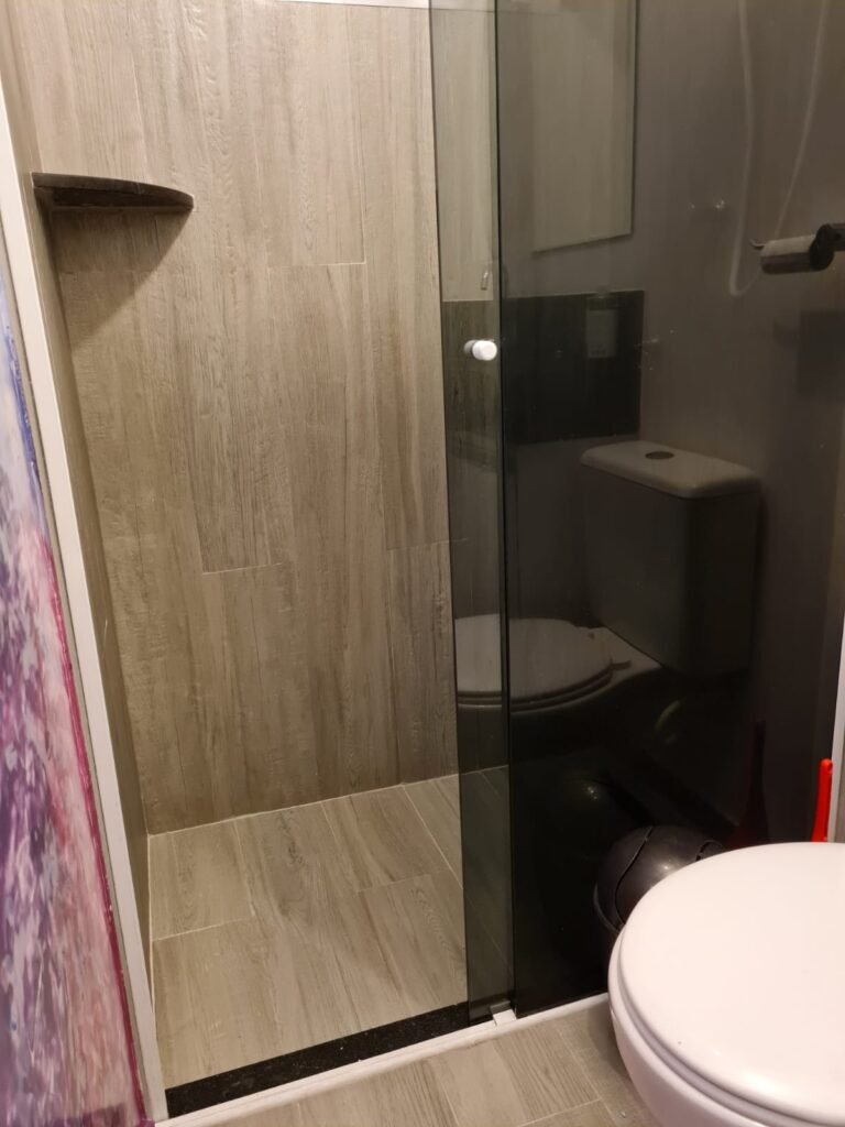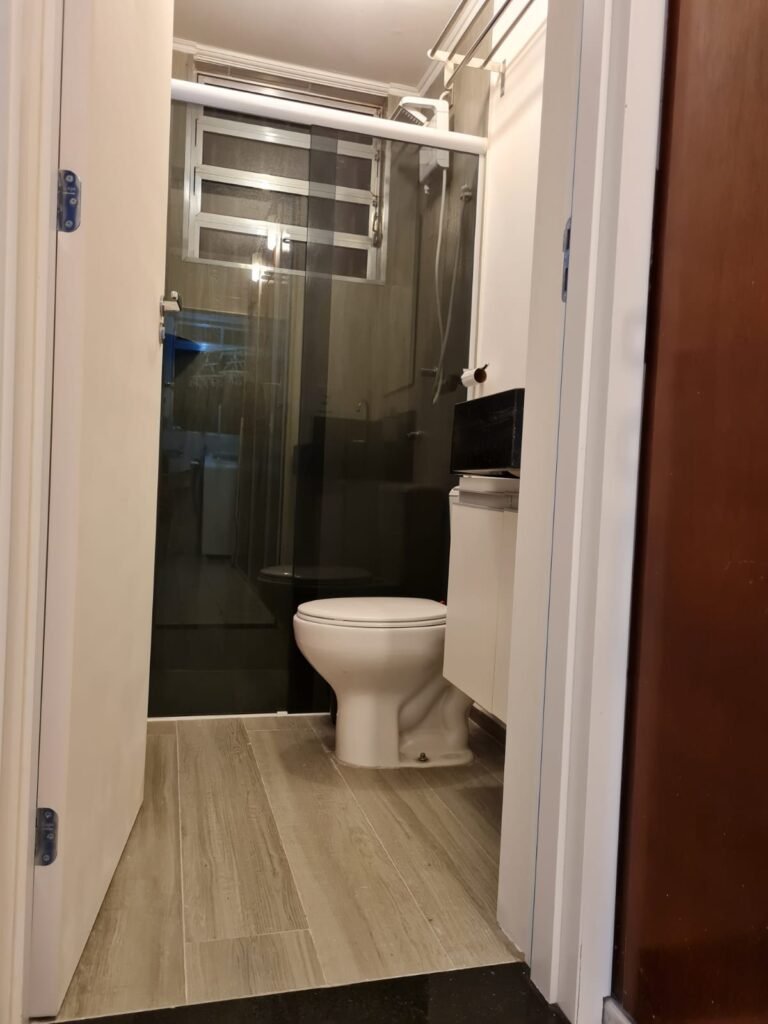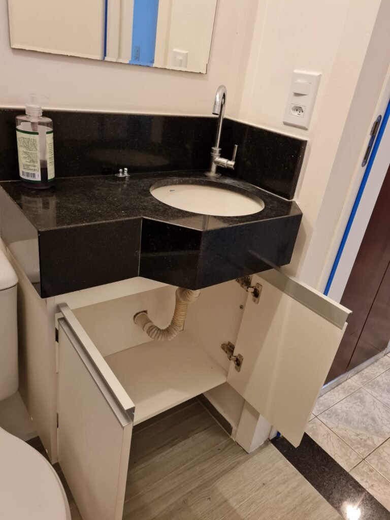Banheiro:- Piso cerâmico porcelanato Eliane modelo madeira na cor cinza com rodapés em ordem, 01 soleira de granito São Gabriel em ordem, paredes dentro do box com revestimento cerâmico porcelanato Eliane modelo madeira na cinza até o teto em ordem, parede com massa acrílica com a pintura na cor branco neve em ordem, 01 parede de massa acrílica com efeito de cimento queimado colorido revestido de resina em ordem, teto na cor branco neve em ordem, gola de isopor na cor branco neve em ordem, 01 box de vidro blindex na cor fume com duas folhas sendo uma decorrer em ordem , 01 puxador em ordem, 01 ralo seco com tampa inox desentupido em ordem, 02 registros deca em ordem, 01 pia de granito São Gabriel com desgaste natural do tempo restante em ordem, 01 cuba de cerâmica branca marca Deca em ordem, 01 torneira bica móvel em ordem, 02 registros Deca sendo 01 do chuveiro e 01 geral em ordem, 01 armário embutido de madeira MDF 18 cm com a pintura na cor branco com duas portas em ordem, 04 dobradiças pneumáticas em ordem, 02 puxadores de inox em ordem, 01 porta papel higiênico de inox em ordem, 01 porta toalhas de aço inox em ordem, 01 spot com 01 lâmpada fluorescente em ordem, 01 espelho com parte lateral lascada o restante em ordem, 01 ralo com tampa inox desentupido em ordem, 01 conjunto de vaso sanitário e caixa acoplada cerâmica na cor branco marca incepa em ordem, 01 tampa vaso em acrílico em ordem, 01 interruptor para lâmpada e tomada com espelho em ordem, 01 janela de alumínio de abrir com 04 vidros em ordem, 01 prateleira de granito São Gabriel em ordem.